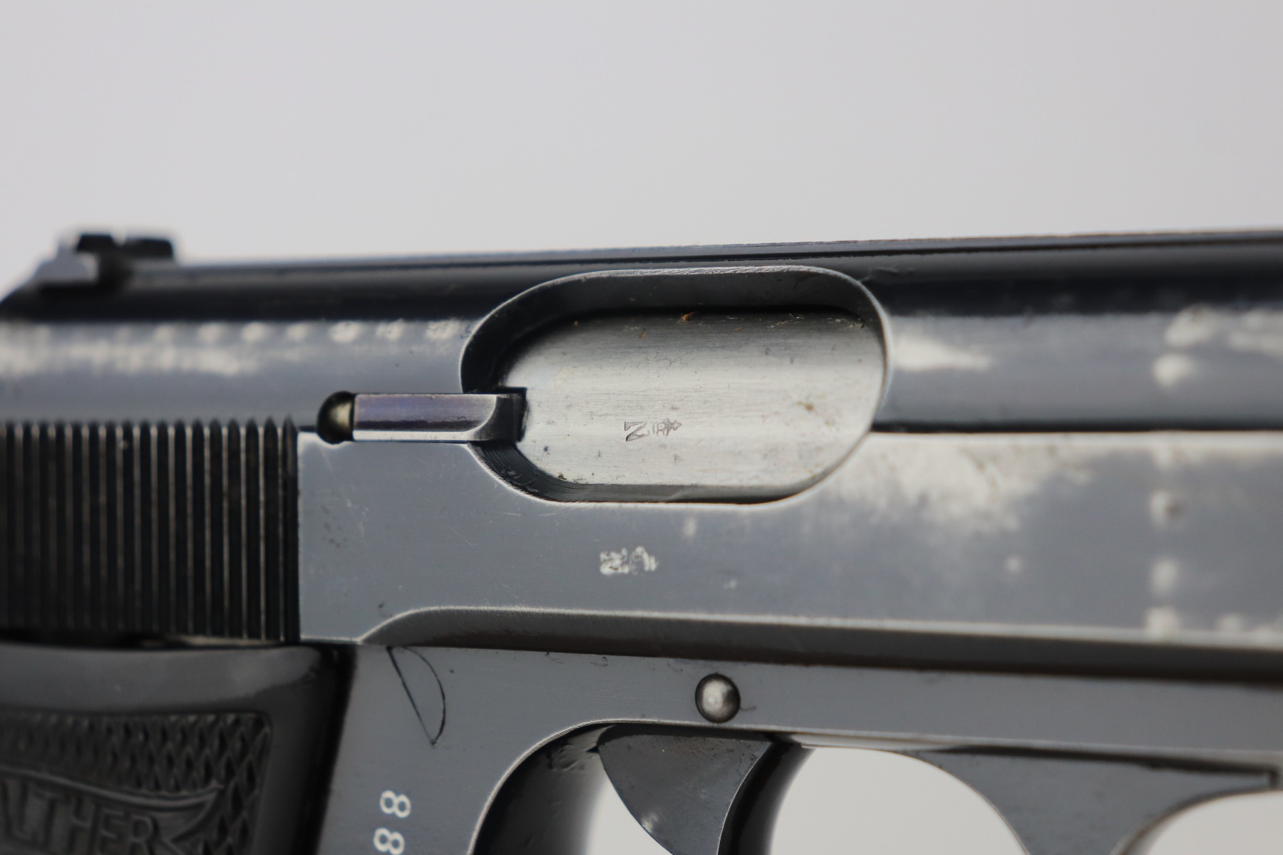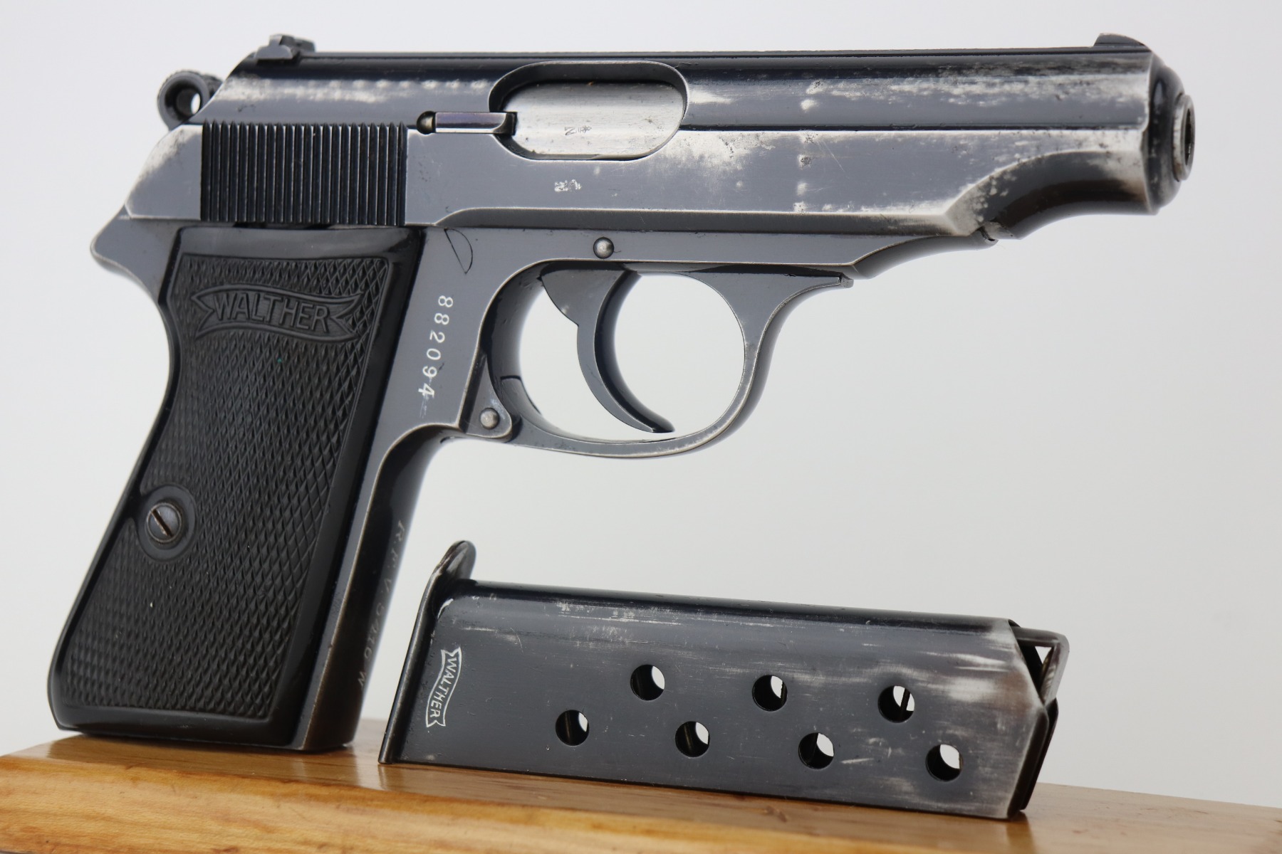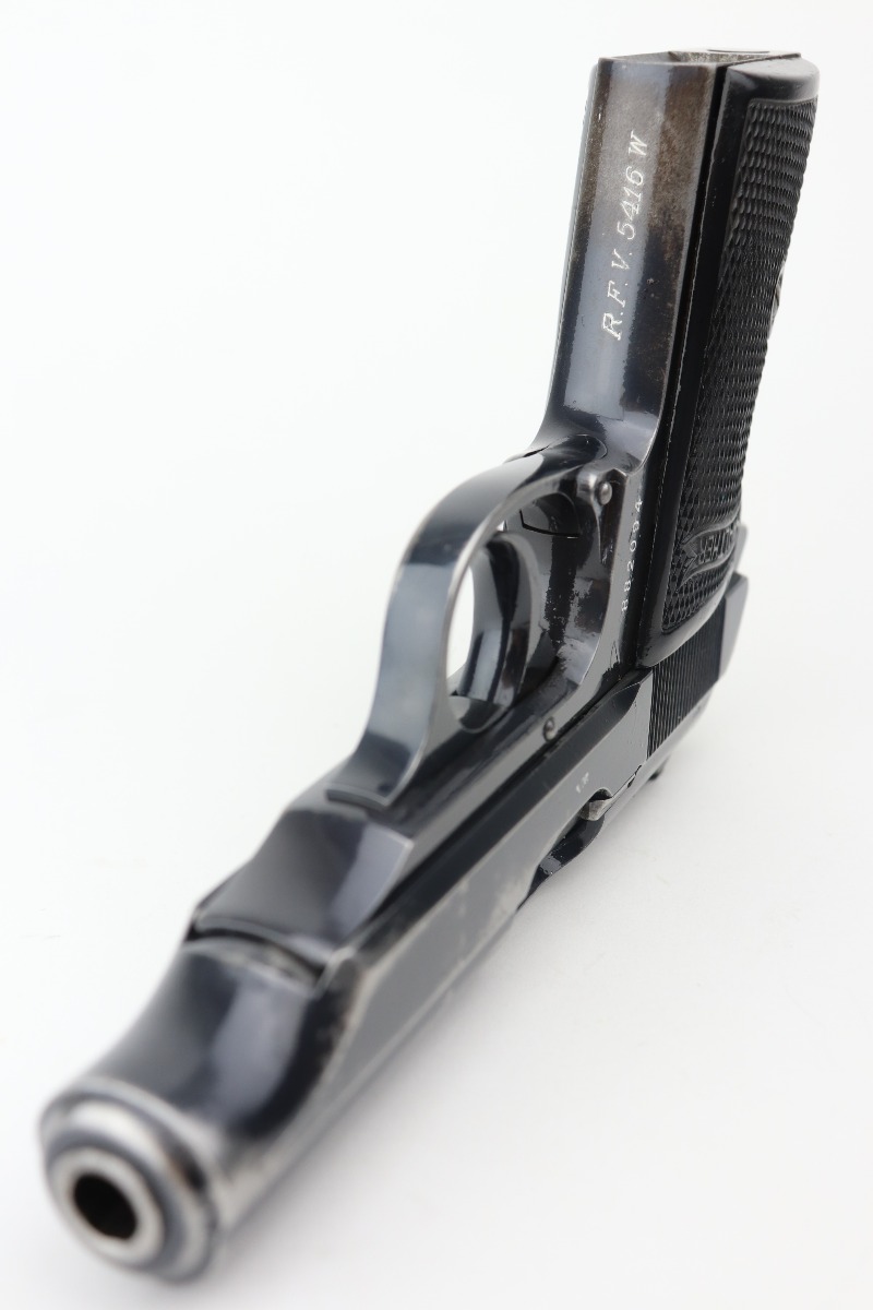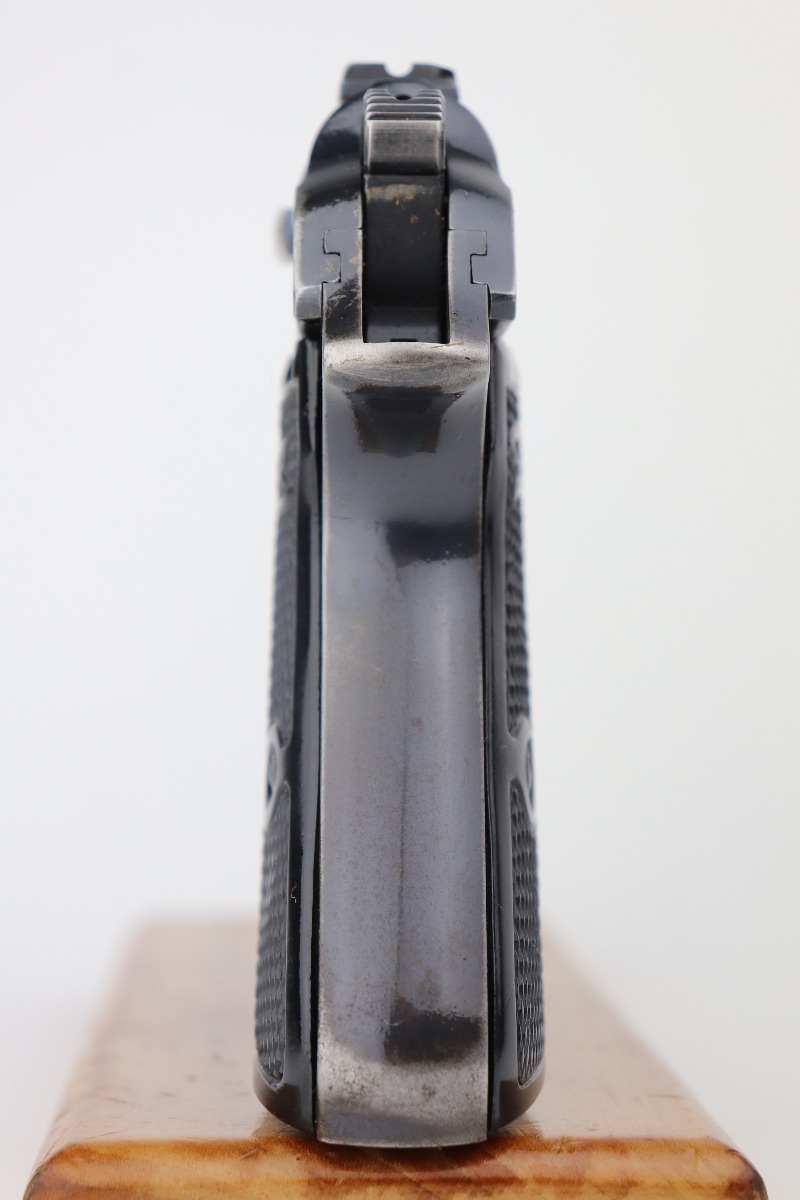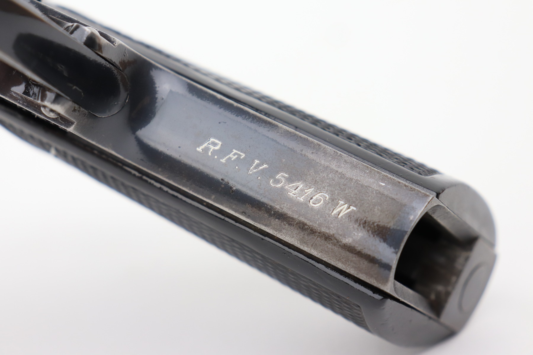 4/27/21 – This is a nice example of a Walther PP issued to the Finance Bureau of the Third Reich. This gun is all matching, has the proper “Crown N” proofs, and has a Reich’s Finance Bureau “RFV” marking on the front strap. It has retained roughly 85% of its original finish. There is spotty wear on both sides of the slide (especially around the muzzle). There is minor wear and spotty patina on the straps. It comes with excellent grips and a proper Walther banner-only magazine. Excellent bore – shiny with strong rifling.