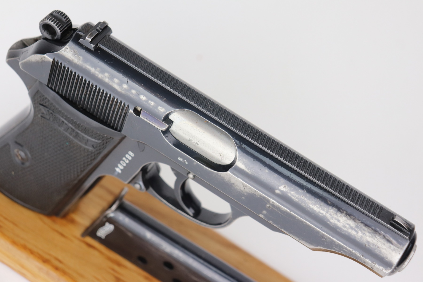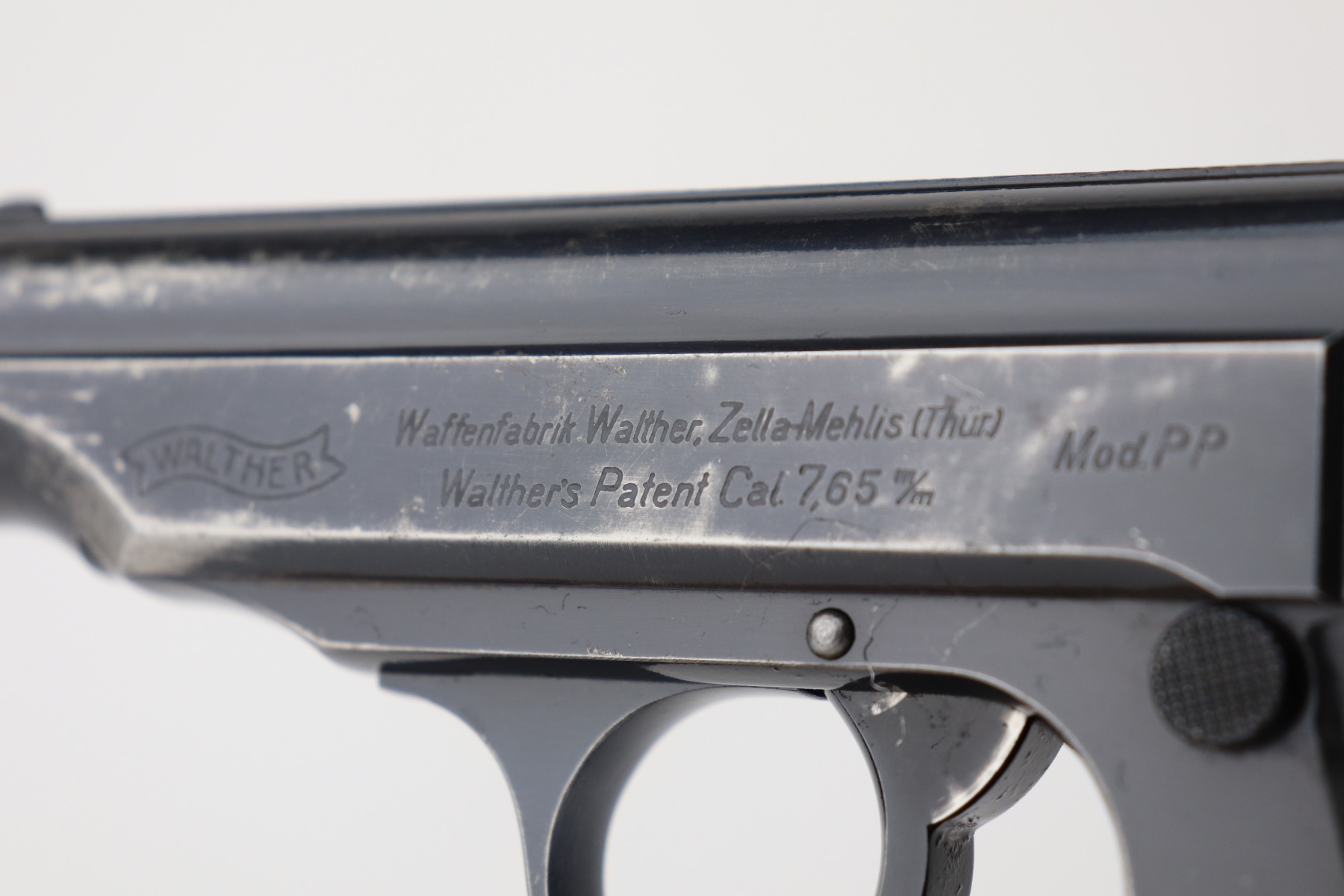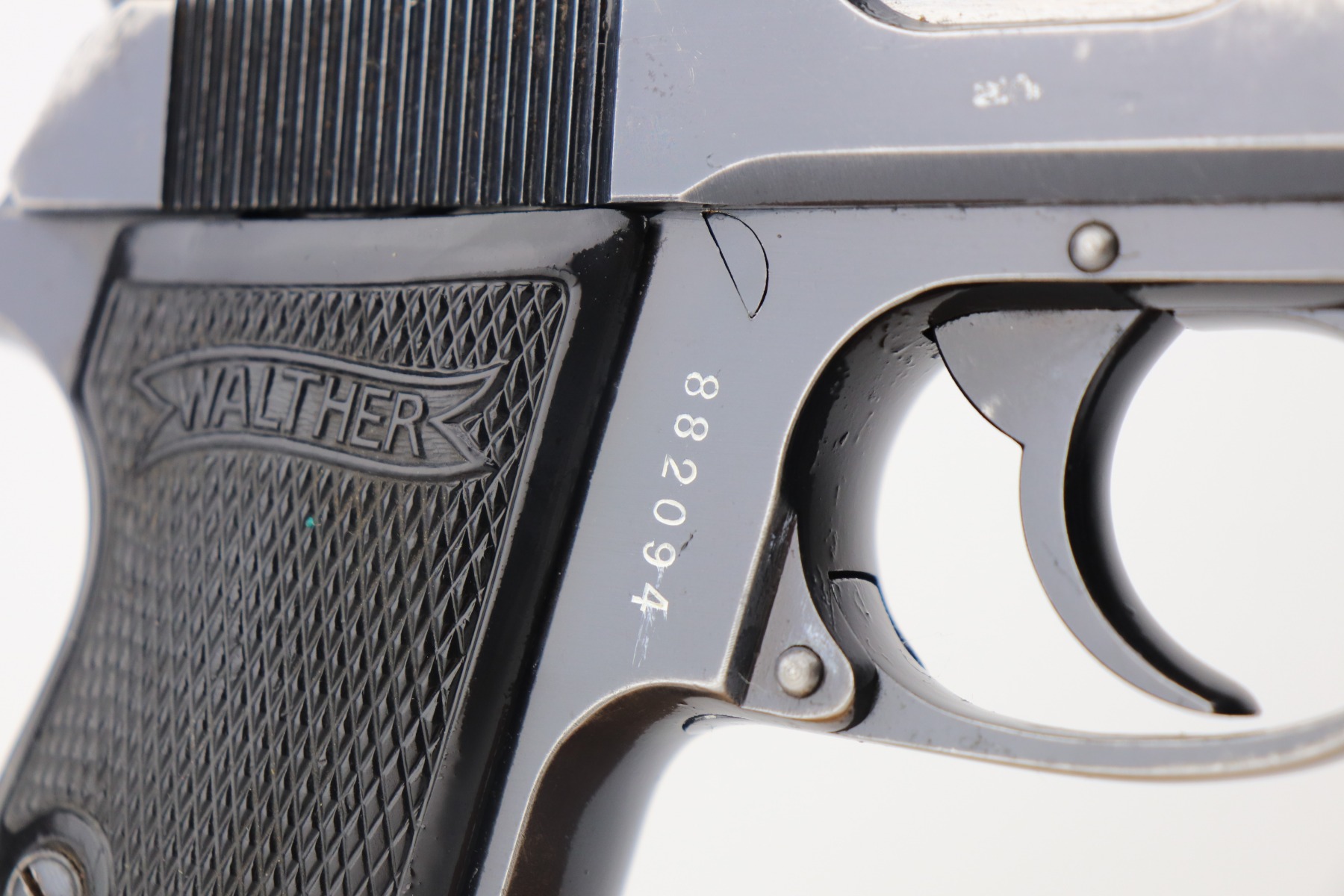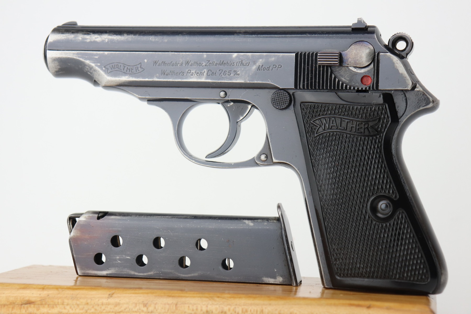 4/27/21 – This is a nice example of a Walther PP issued to the Finance Bureau of the Third Reich. This gun is all matching, has the proper “Crown N” proofs, and has a Reich’s Finance Bureau “RFV” marking on the front strap. It has retained roughly 85% of its original finish. There is spotty wear on both sides of the slide (especially around the muzzle). There is minor wear and spotty patina on the straps. It comes with excellent grips and a proper Walther banner-only magazine. Excellent bore – shiny with strong rifling.