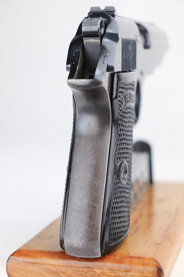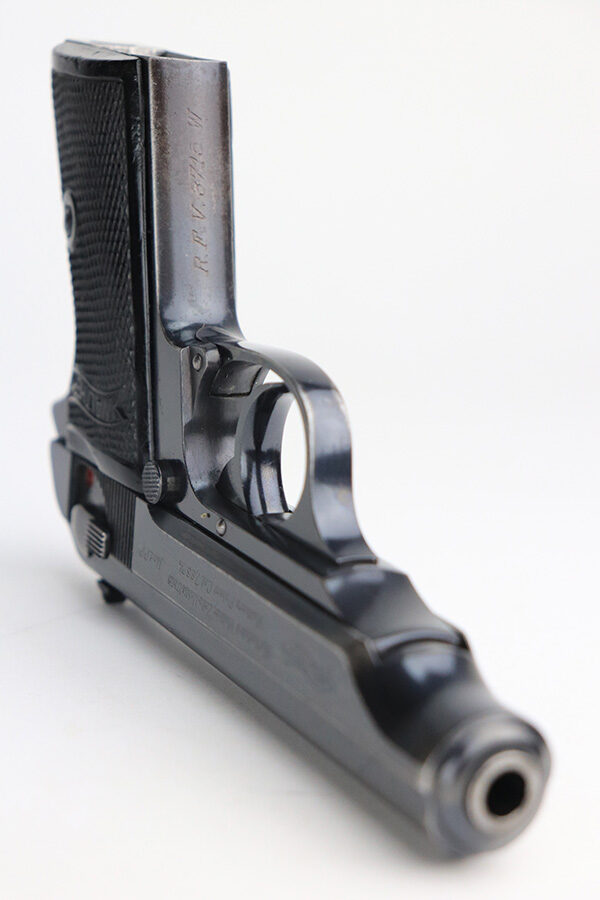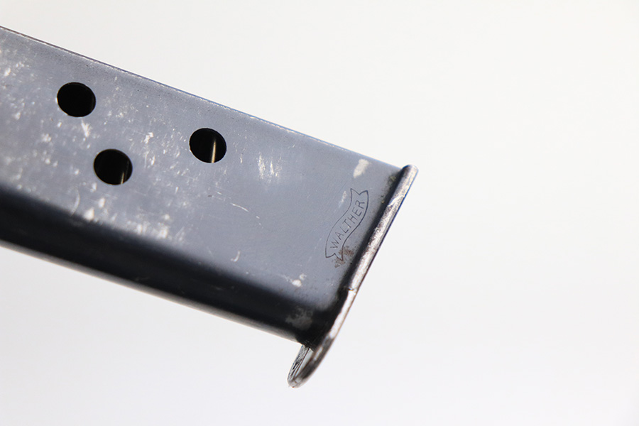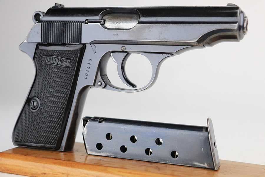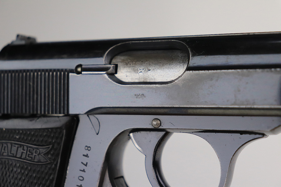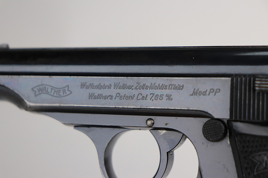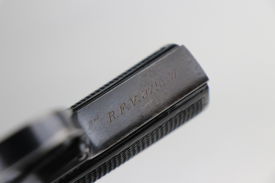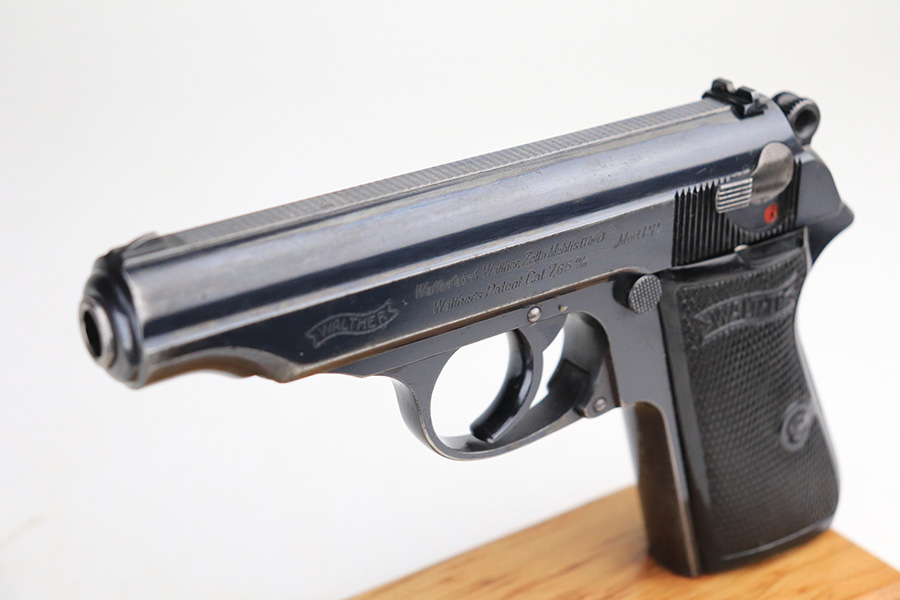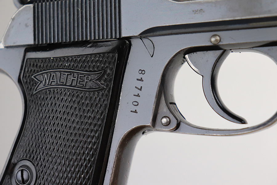 1/25/22 – This is a very nice example of a Walther PP issued to the Finance Bureau of the Third Reich in 1935. This gun is all matching, has the proper “Crown N” proofs, and has a Reich’s Finance Bureau “RFV” marking on the front strap. It has retained roughly 92% of its original finish. There is minor, somewhat spotty wear along the high edges of the slide and around the muzzle. Areas of splotchy discoloration along the right side of the slide. There is minor thinning and spotty brown patina on both grip straps. Comes with excellent black bakelite grips and a period-correct Walther banner-only magazine. The bore is near-mint.