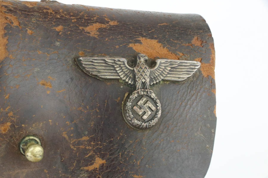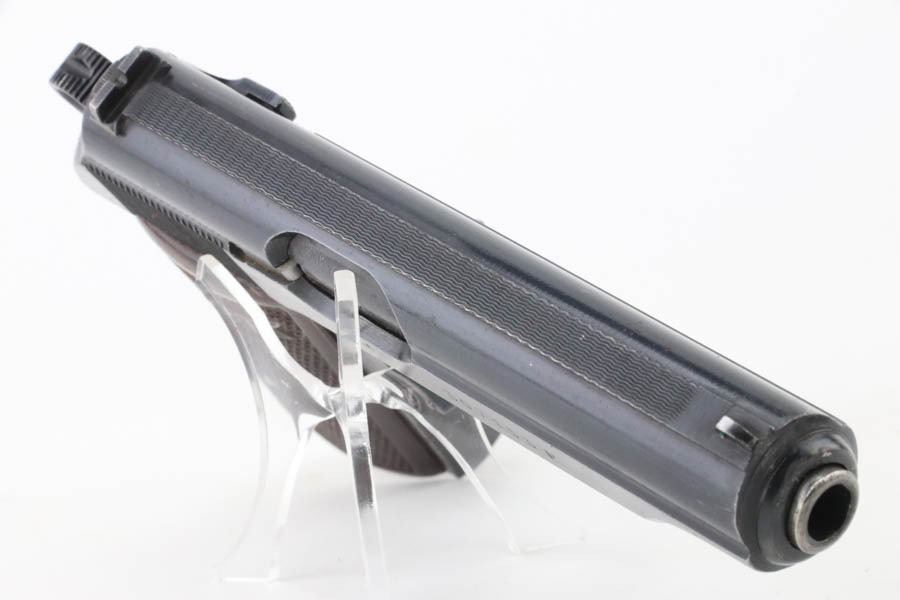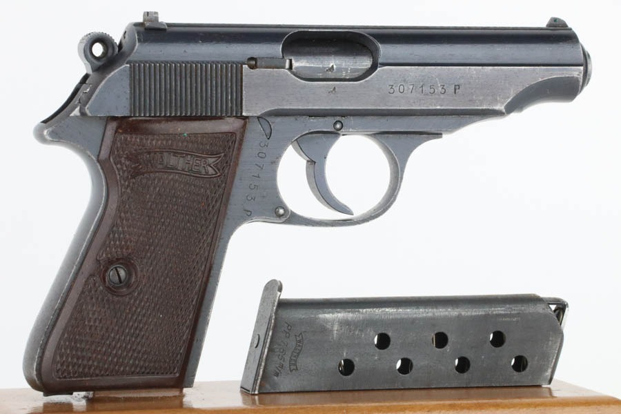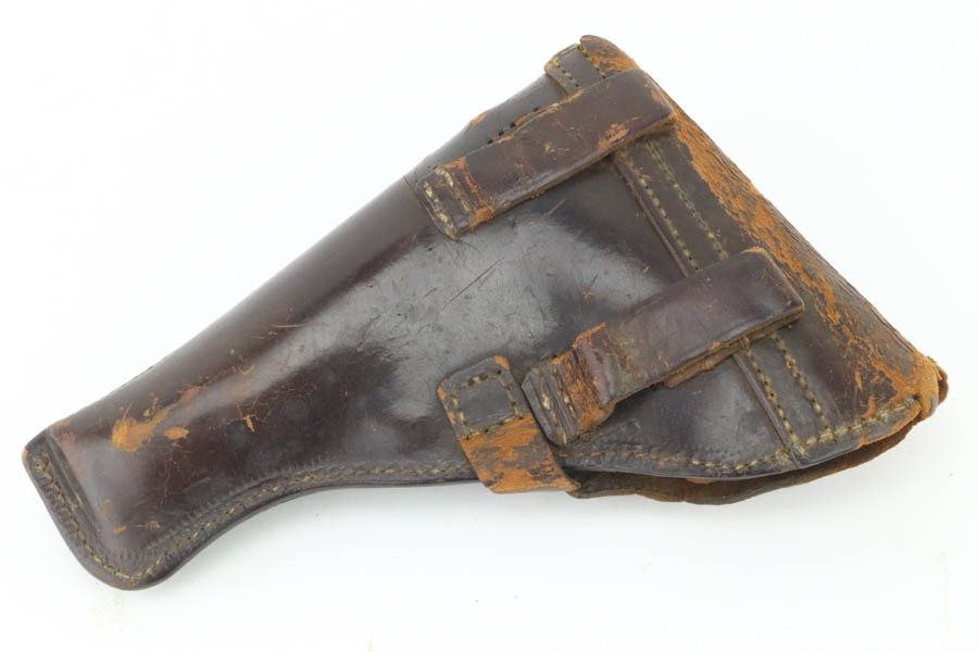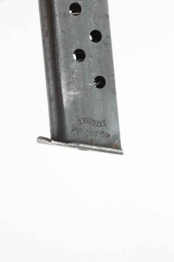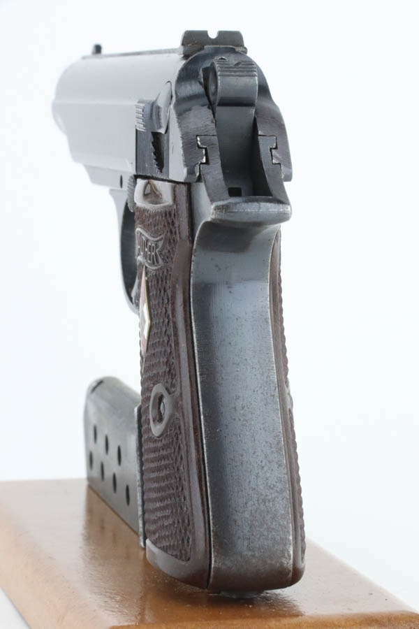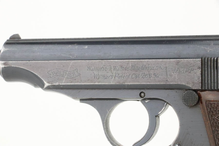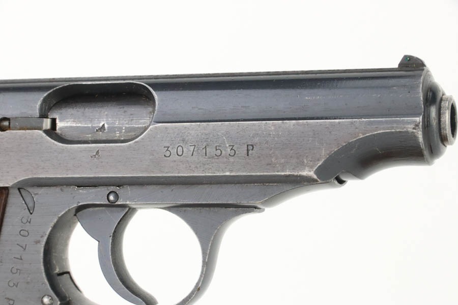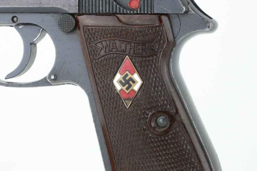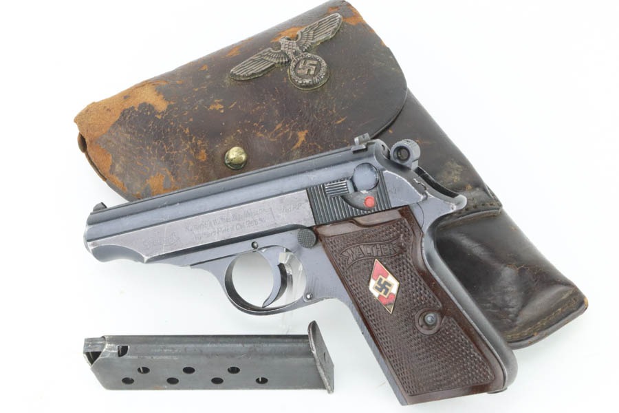 10/03/2024 – For sale is a Walther PP made in 1943 that comes with a holster. The pistol is well worn with spotting of oxidation on the slide. There are large spots of edge wear towards the muzzle. The front and back of the grip also have oxidation freckling. The bore is almost mirror bright with great rifling. The pistol comes with one magazine. The frame and slide are matching. A prior owner had placed a Hitler Youth medallion in the left grip panel and the bottom of the medallion is chipped. The holster is heavily worn and the securing strap is torn off. There was also an eagle medallion pressed onto the outer flap.