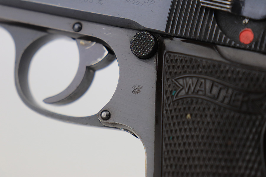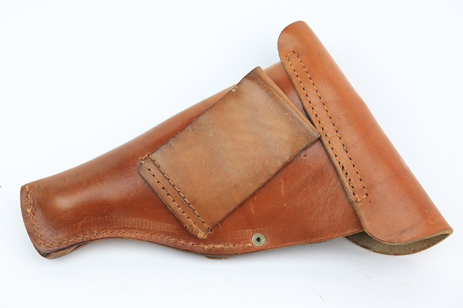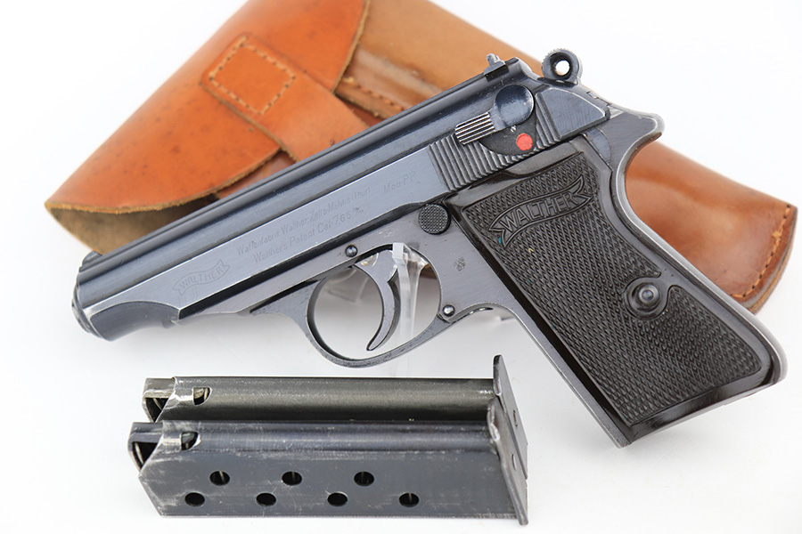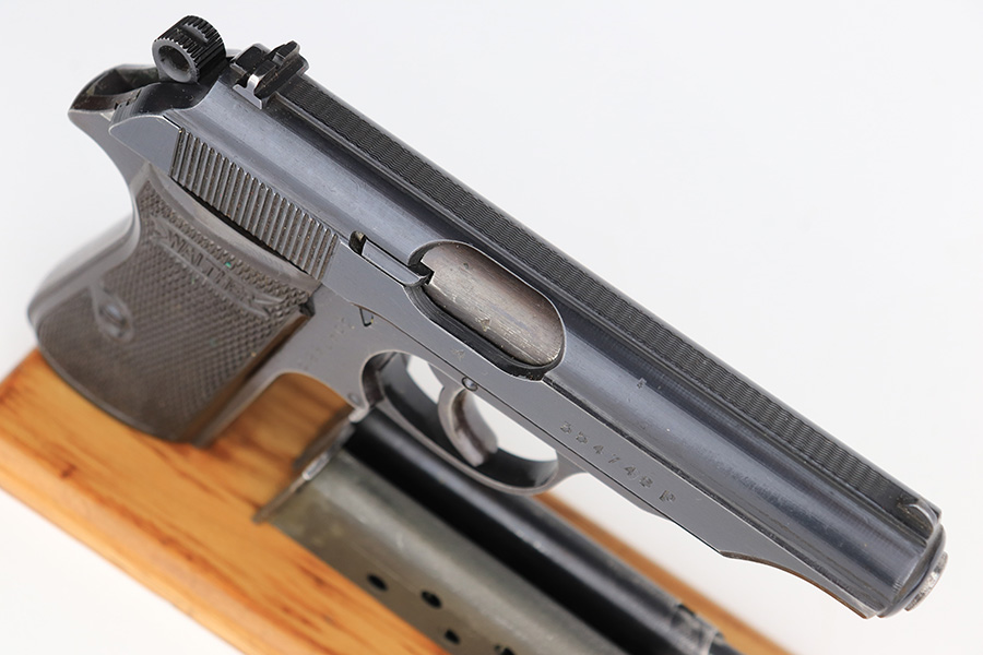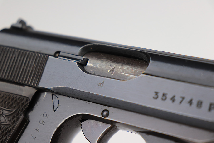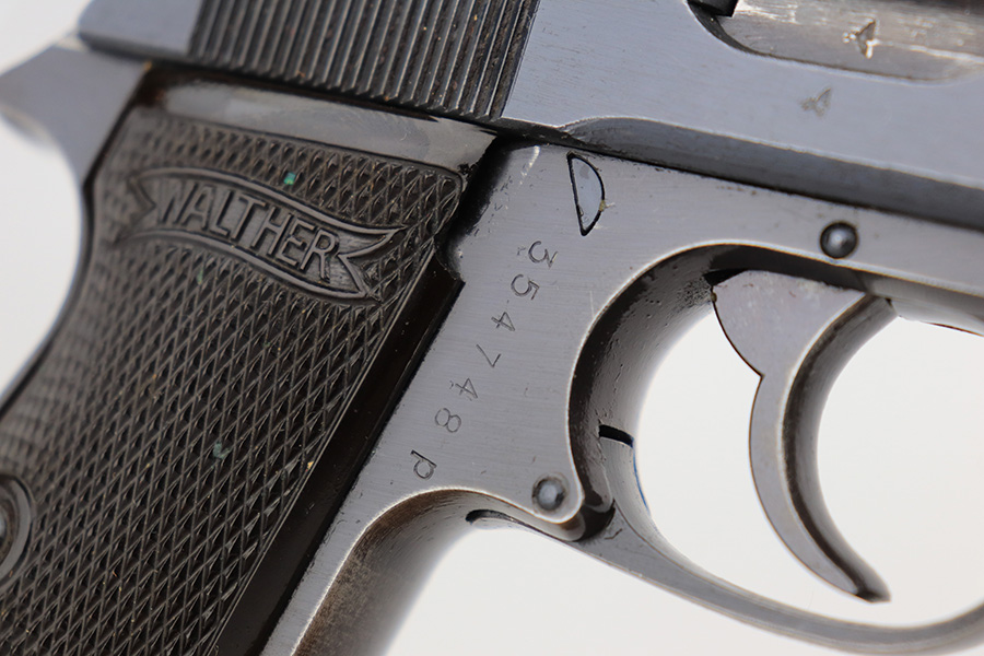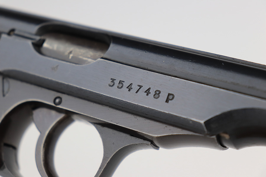 3/23/23 – This is a minty example of a scarce late-war Walther PP rig issued to the Nazi police in 1944. It is all matching and has the proper police “Eagle F” proof. This police “Eagle F” variation is scarce as only about 5,000 were made. It comes as a rig with an un-issued tan leather police holster, one wartime magazine, and a rare “W” marked phosphate magazine. This gun also comes with scarce brownish bakelite grips- small chip on the right panel. It has retained about 97% of its original finish with minor thinning and light freckling on the grip straps. Mint bore.