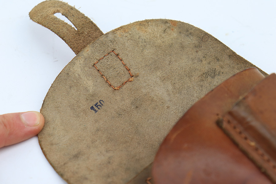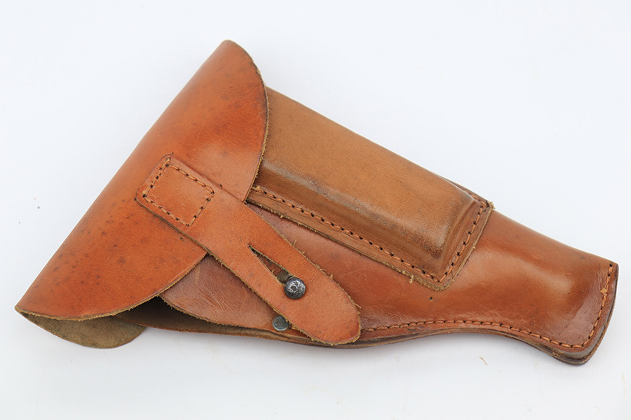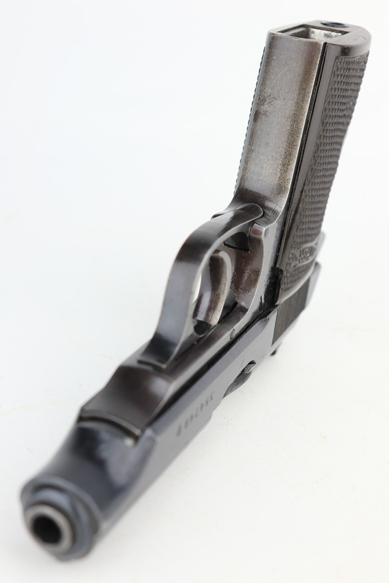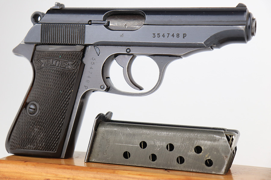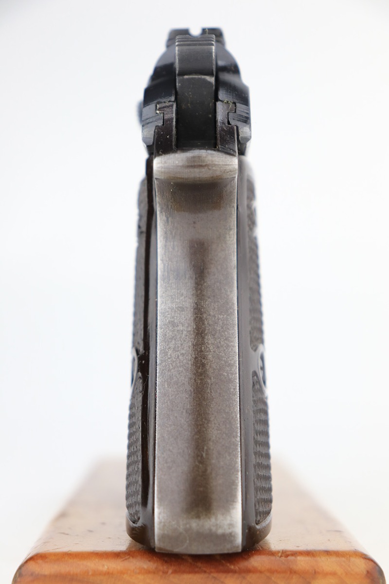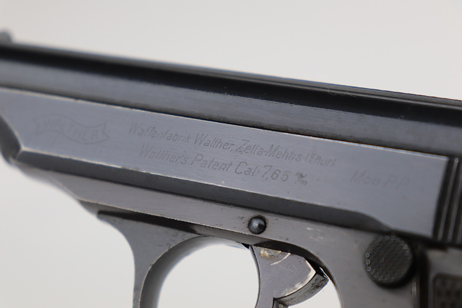 3/23/23 – This is a minty example of a scarce late-war Walther PP rig issued to the Nazi police in 1944. It is all matching and has the proper police “Eagle F” proof. This police “Eagle F” variation is scarce as only about 5,000 were made. It comes as a rig with an un-issued tan leather police holster, one wartime magazine, and a rare “W” marked phosphate magazine. This gun also comes with scarce brownish bakelite grips- small chip on the right panel. It has retained about 97% of its original finish with minor thinning and light freckling on the grip straps. Mint bore.