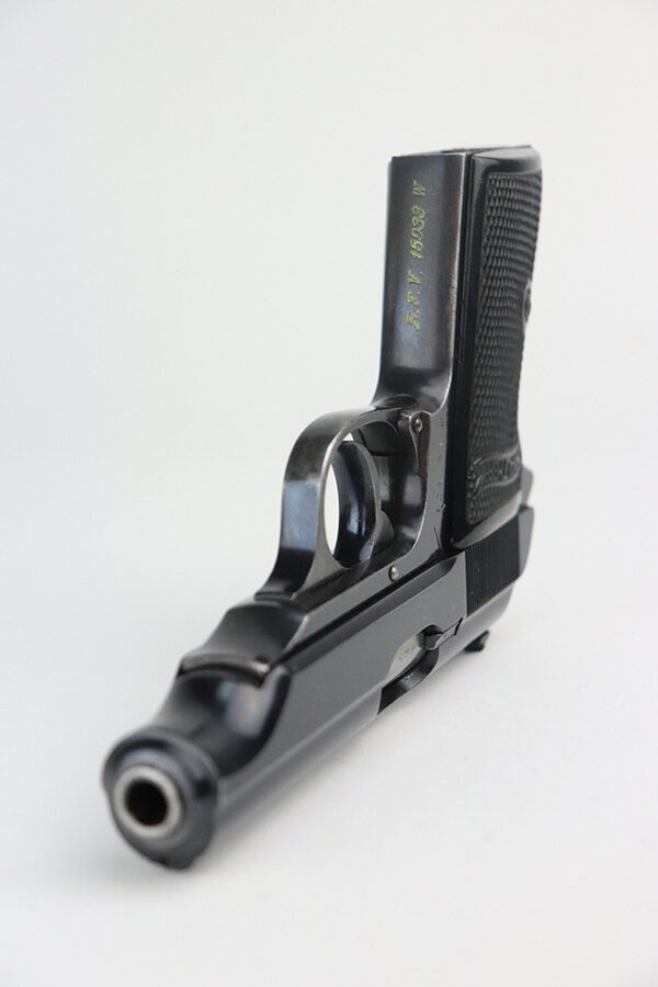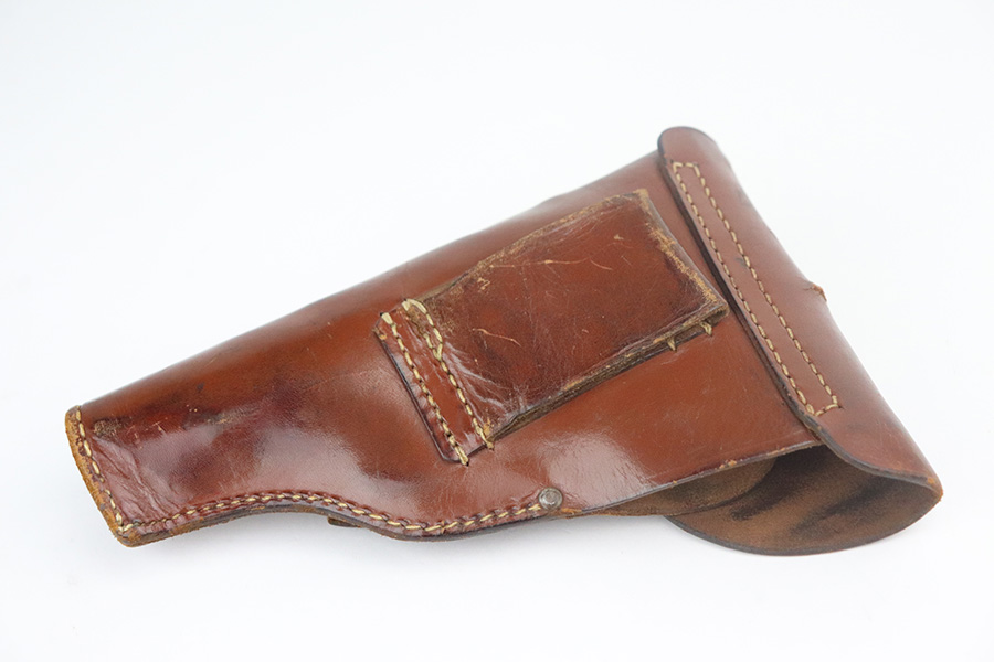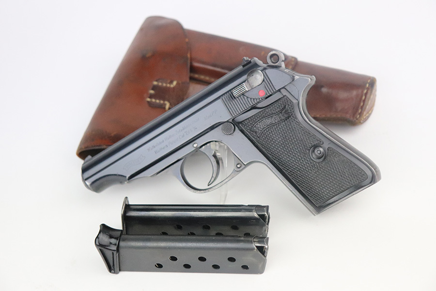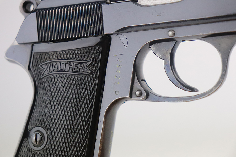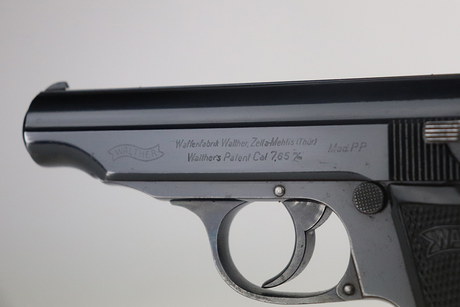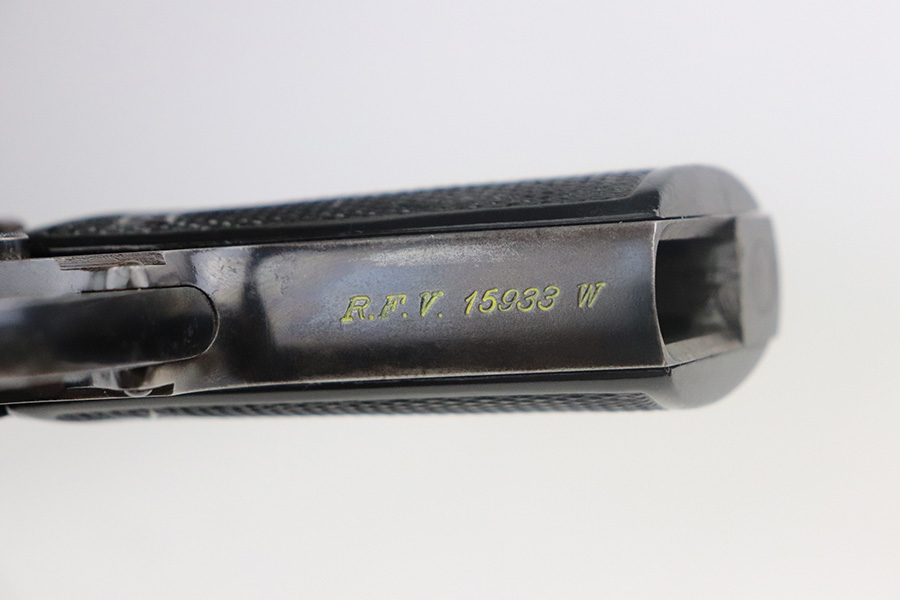 7/12/21 – This is a very nice example of a Walther PP rig manufactured in 1939. This one has an “RFV” marking on the front strap, indicating it was issued to the Finance Bureau of the Third Reich. It is all matching and has the proper “Crown N” proofs. It comes with a nice 1942-dated police-style holster, one finger extension magazine, and one flat-bottom magazine. It has retained about 93-94% of its high polish finish. There is very minor wear around the muzzle. Some minor streaky wear and pin-pricking on both straps. Comes with excellent grips. Excellent bore – shiny with strong rifling.