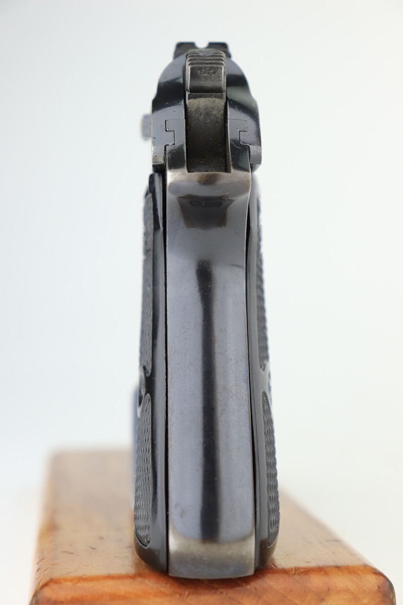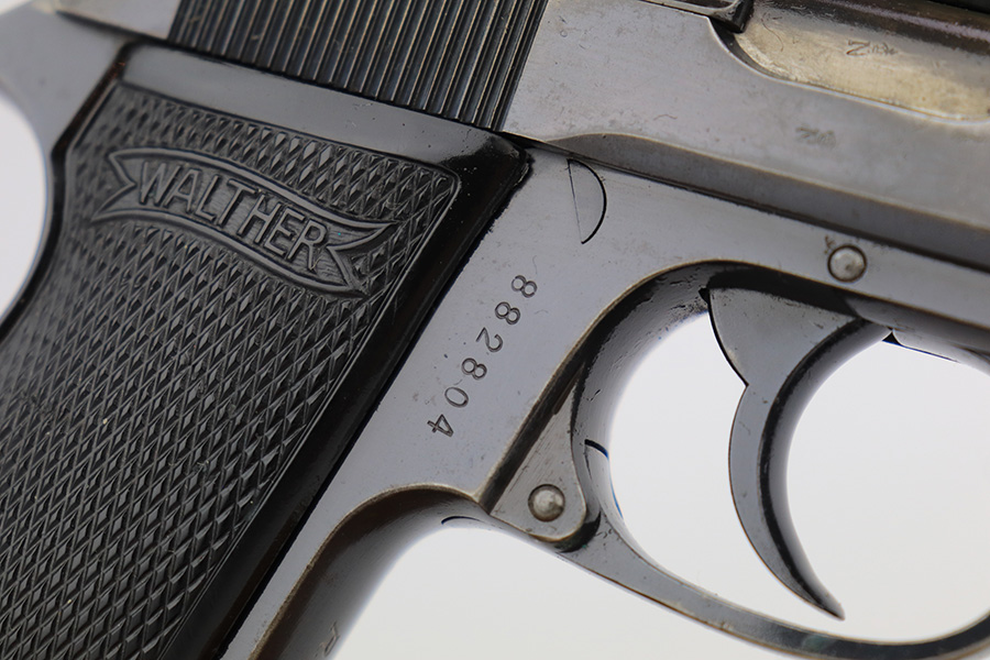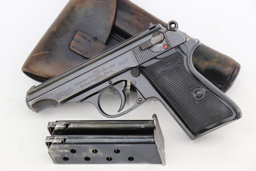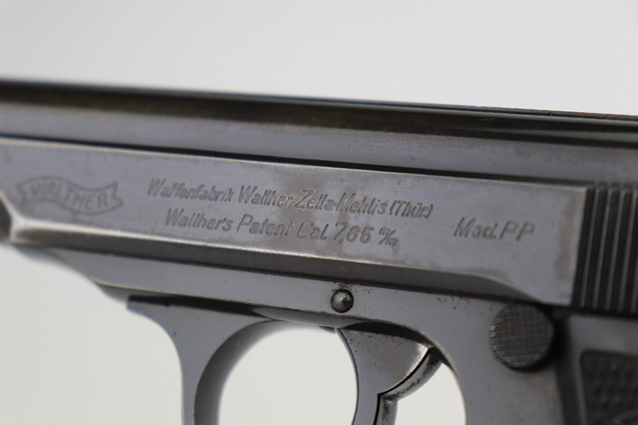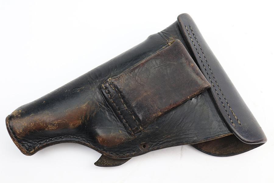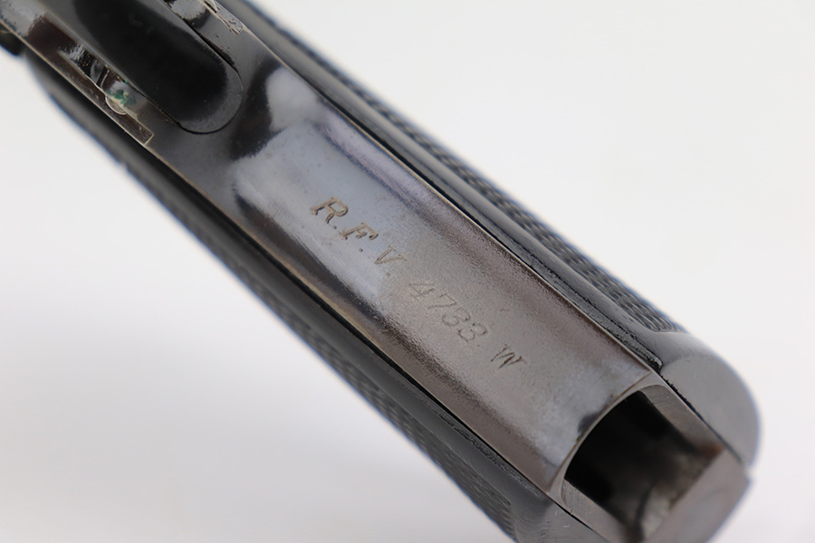 3/7/23 – This is an original Walther PP designated for the Reichs Finanz Verwaltung. It is marked “R.F.V. 4733 W” on the front strap. This Nazi department was in charge of the borders as well as government financial matters – much like our own IRS and border police. This one comes as a rig with two period-correct magazines and a 1935-dated police-style holster. The gun itself has retained about 90% of its original finish. There is general high edge wear and some minor thinning and minor spotty discoloration along both sides of the slide. An area of brown patina and pin-pricking on the front strap. Fitted with a set of very nice period-correct black bakelite grips. Minty bore.
