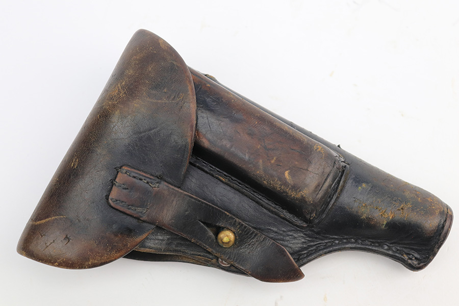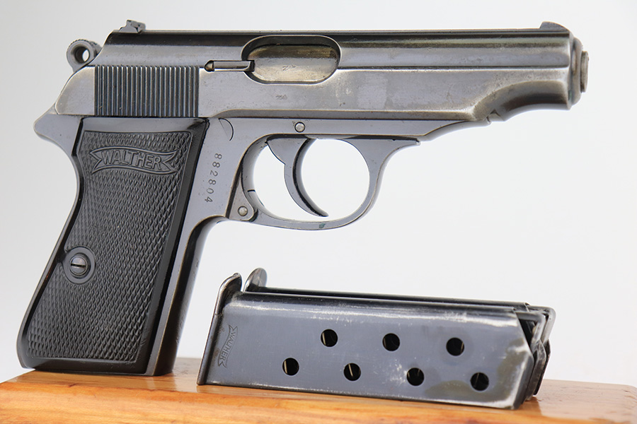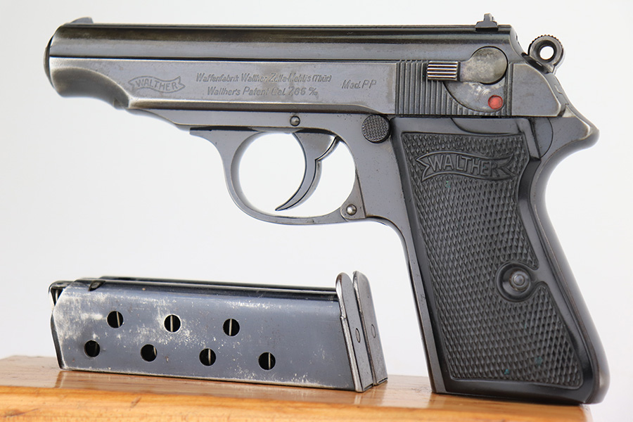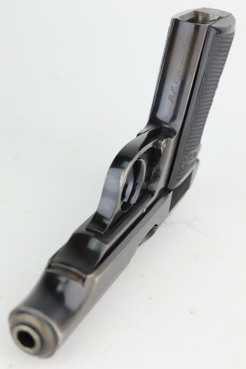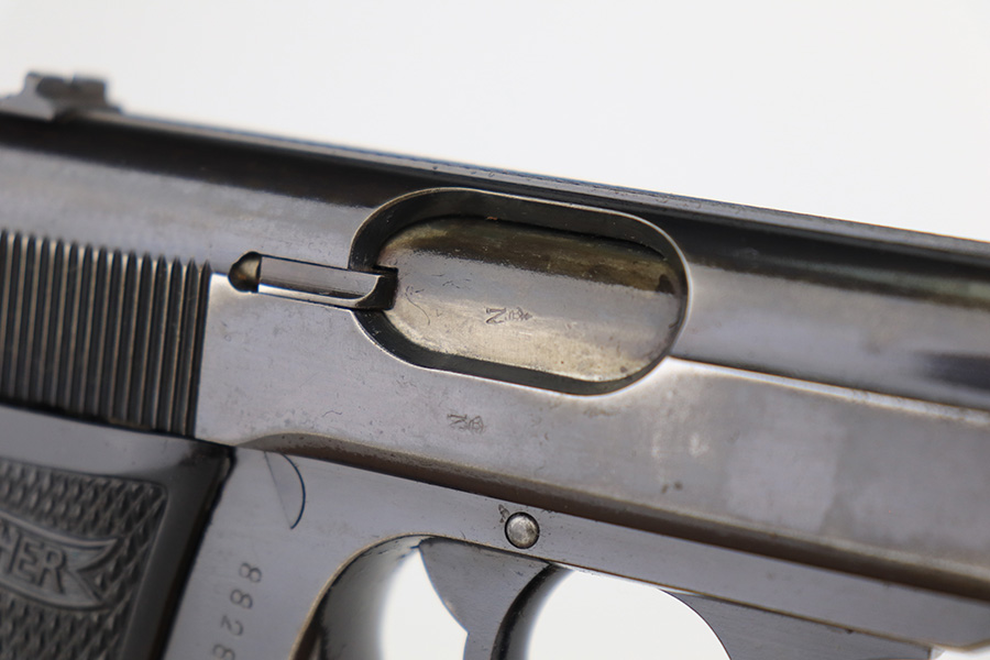 3/7/23 – This is an original Walther PP designated for the Reichs Finanz Verwaltung. It is marked “R.F.V. 4733 W” on the front strap. This Nazi department was in charge of the borders as well as government financial matters – much like our own IRS and border police. This one comes as a rig with two period-correct magazines and a 1935-dated police-style holster. The gun itself has retained about 90% of its original finish. There is general high edge wear and some minor thinning and minor spotty discoloration along both sides of the slide. An area of brown patina and pin-pricking on the front strap. Fitted with a set of very nice period-correct black bakelite grips. Minty bore.
