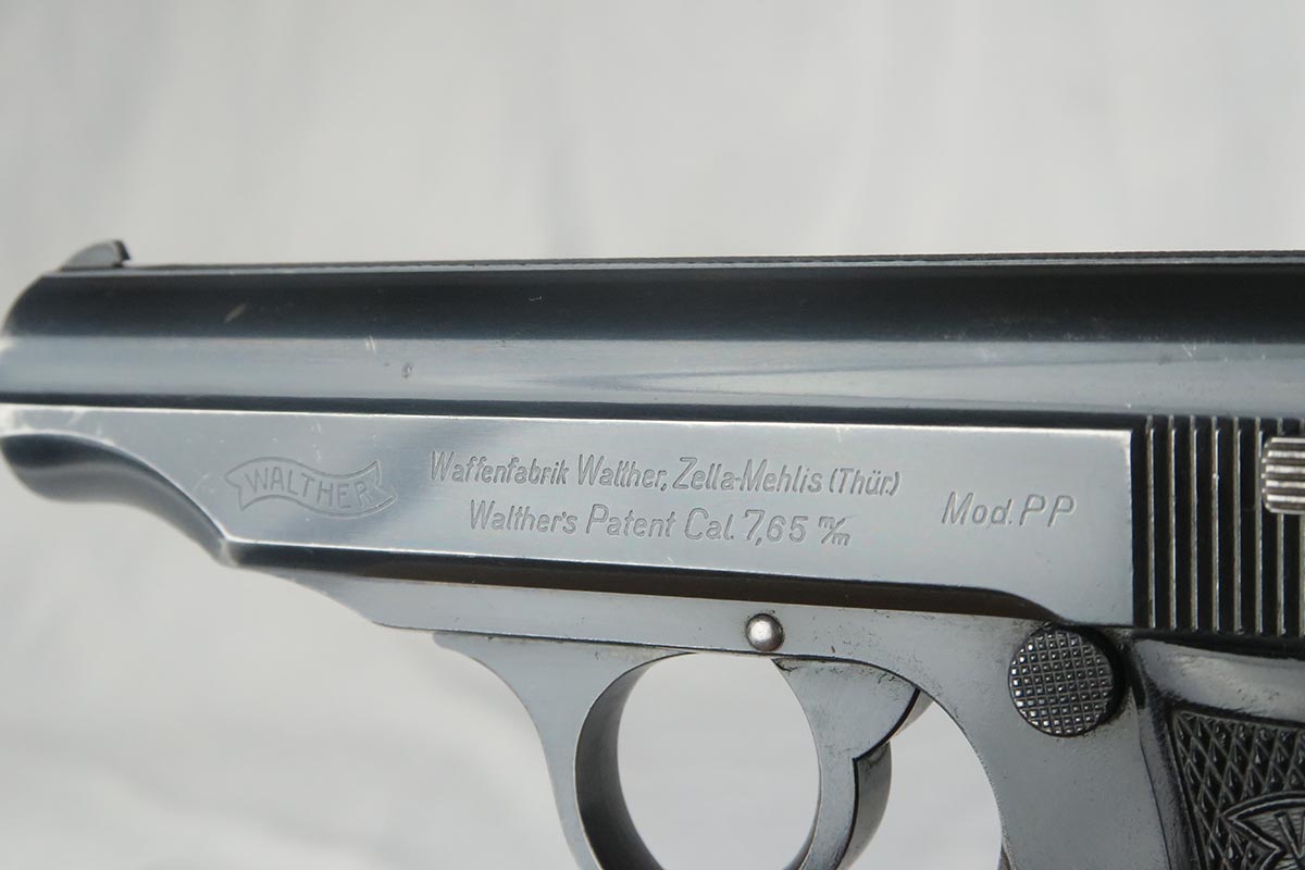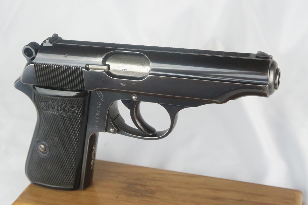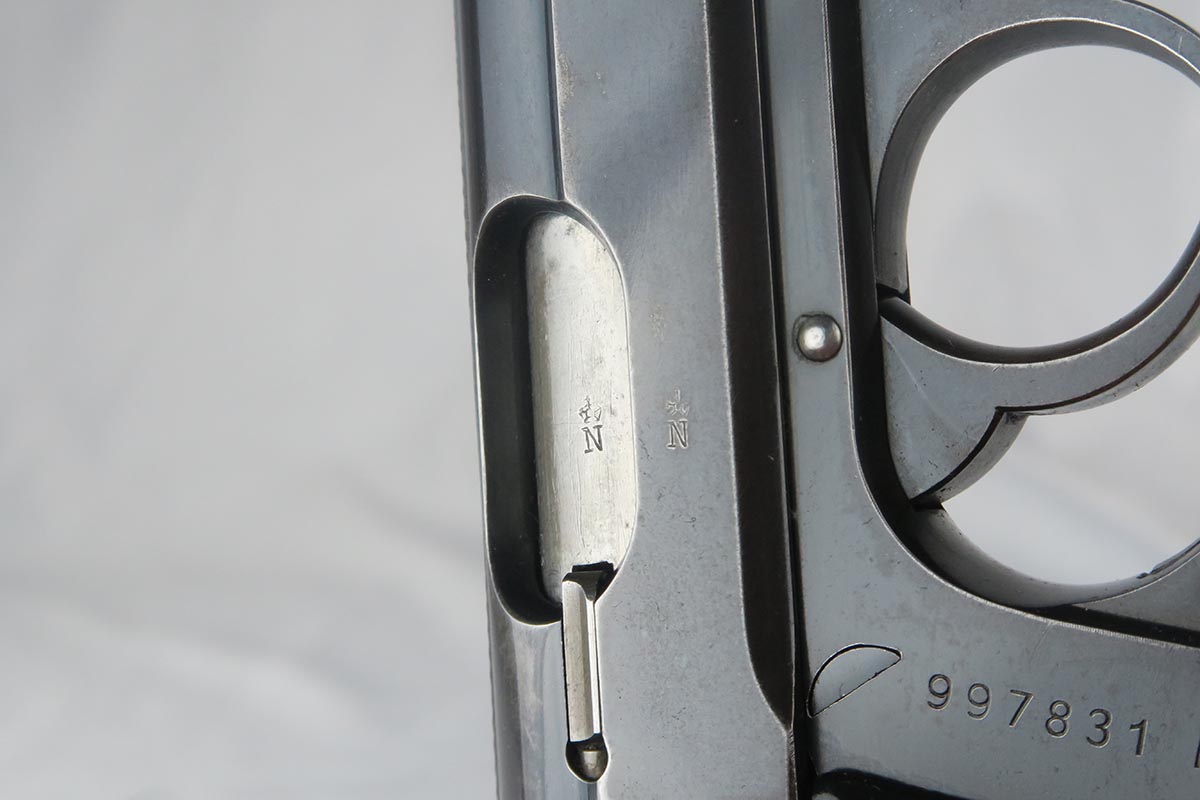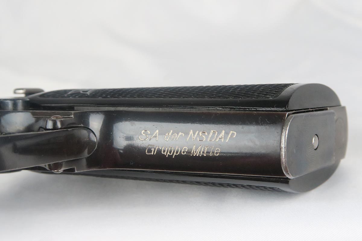 10/23/17 – This is an SA Walther PP from the Nazi era. It is a Gruppe Mitte and was manufactured in 1938. These were issued to Hitler’s personal “army” or body guard. The original finish is excellent, conservatively rated at about 95%. There is only some light muzzle and edge wear, as well as some very minor finish loss on the bottom of the back strap. These are very common areas of wear, and the rest of the bluing is excellent and all original. All parts are matching and correct. The bore is excellent with strong rifling. There is no corrosion or notable residue in the bore. Correct grips and magazine. Guaranteed all original and authentic.