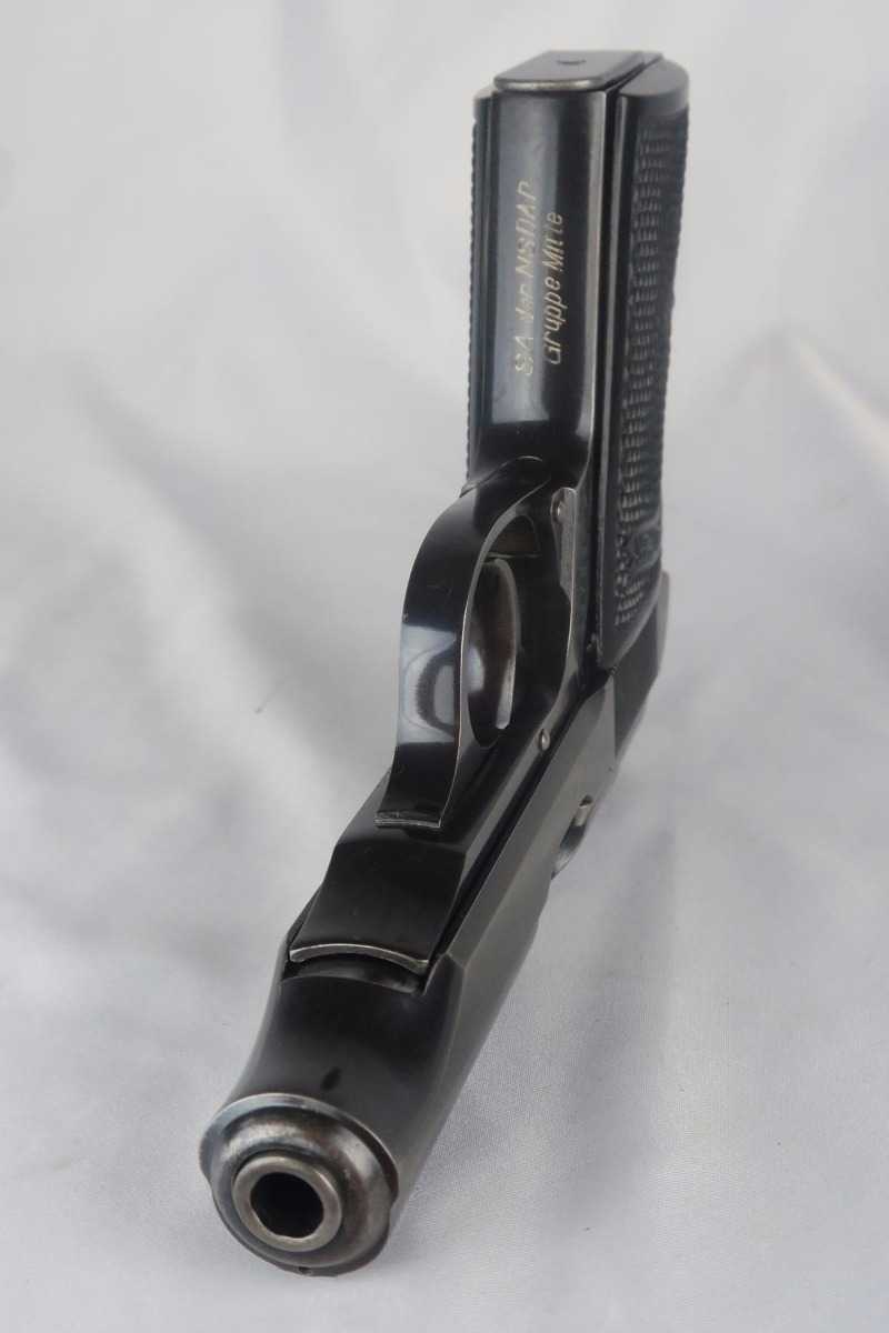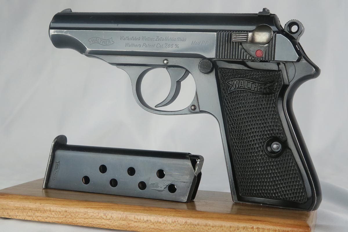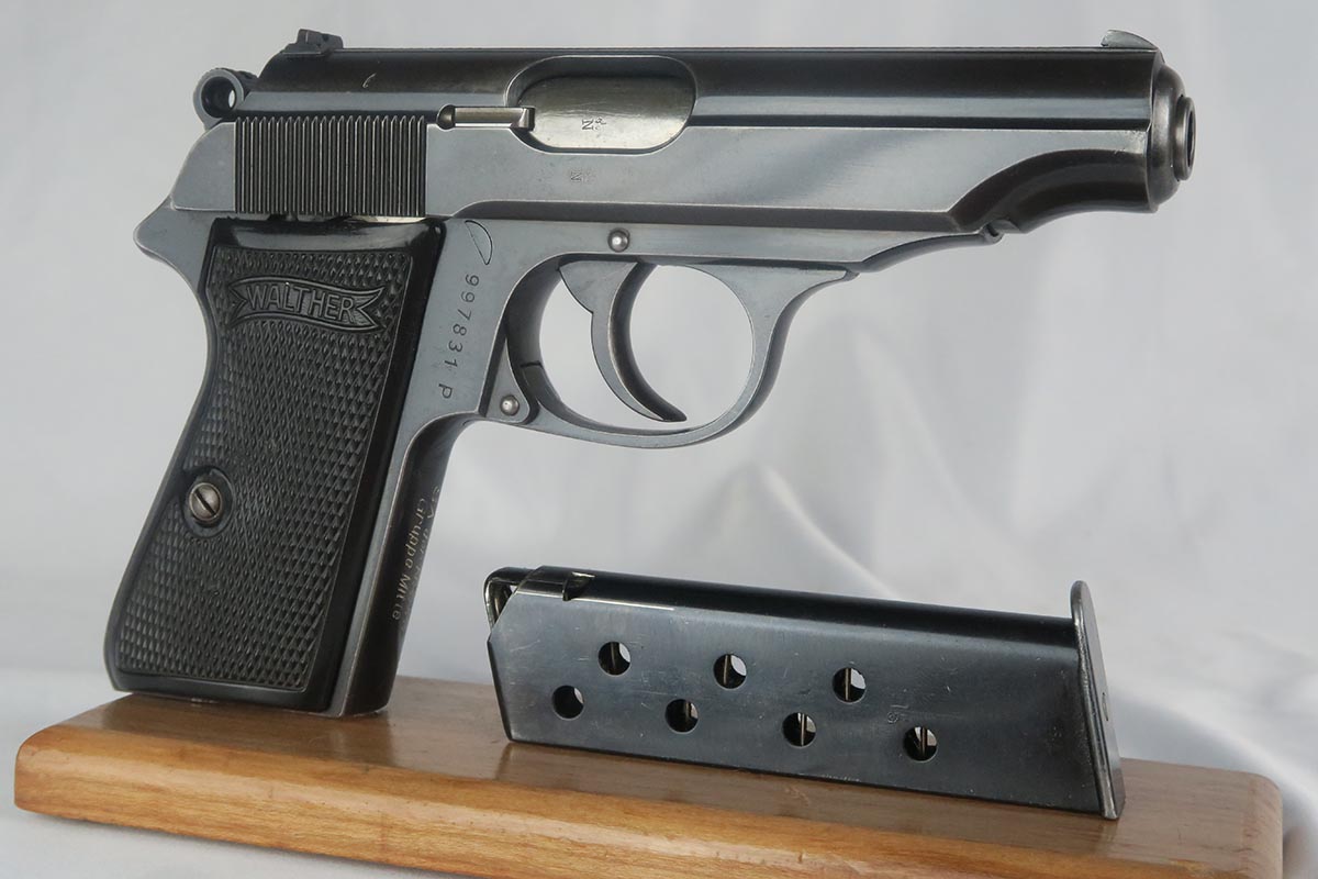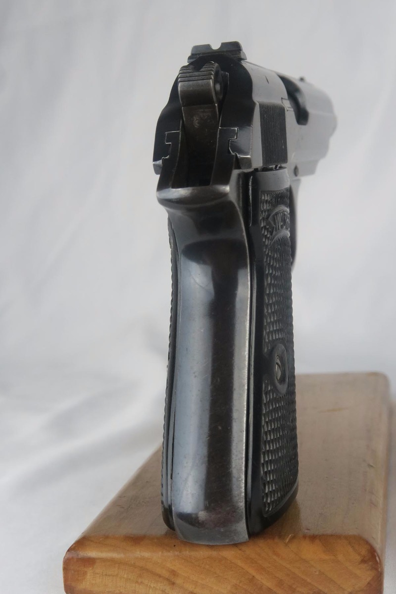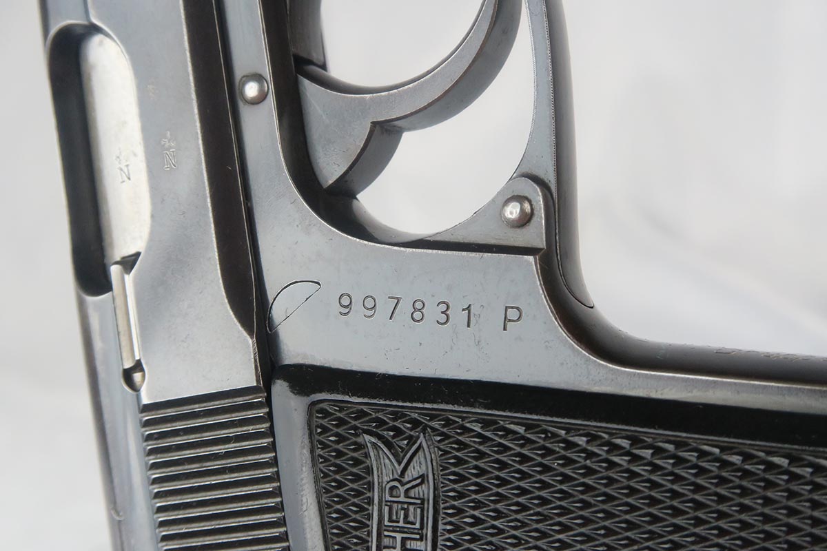 10/23/17 – This is an SA Walther PP from the Nazi era. It is a Gruppe Mitte and was manufactured in 1938. These were issued to Hitler’s personal “army” or body guard. The original finish is excellent, conservatively rated at about 95%. There is only some light muzzle and edge wear, as well as some very minor finish loss on the bottom of the back strap. These are very common areas of wear, and the rest of the bluing is excellent and all original. All parts are matching and correct. The bore is excellent with strong rifling. There is no corrosion or notable residue in the bore. Correct grips and magazine. Guaranteed all original and authentic.