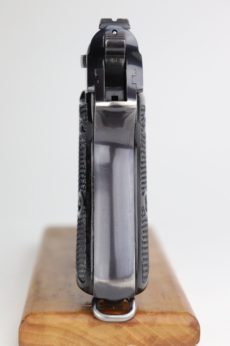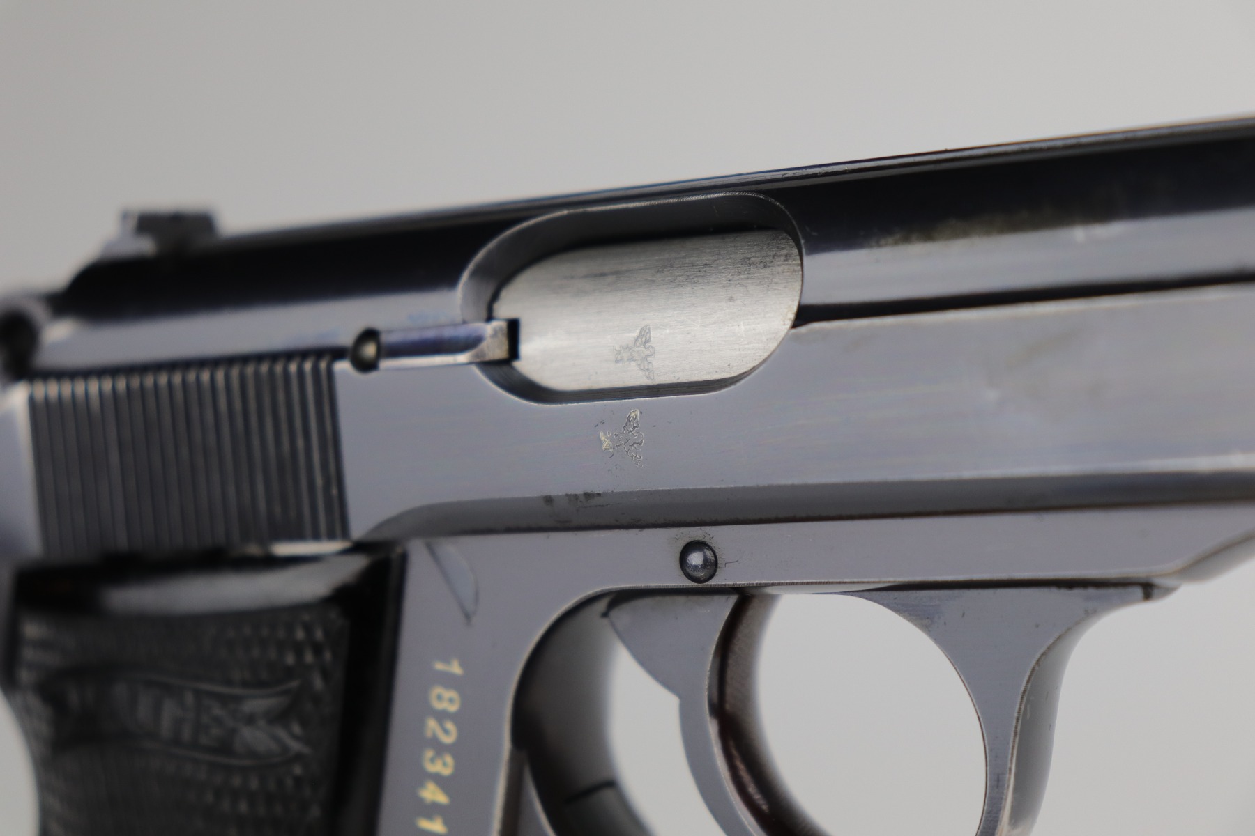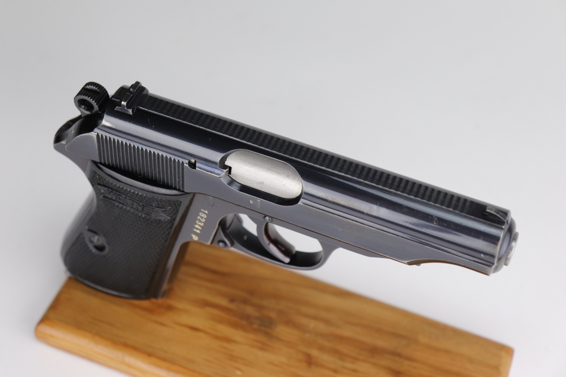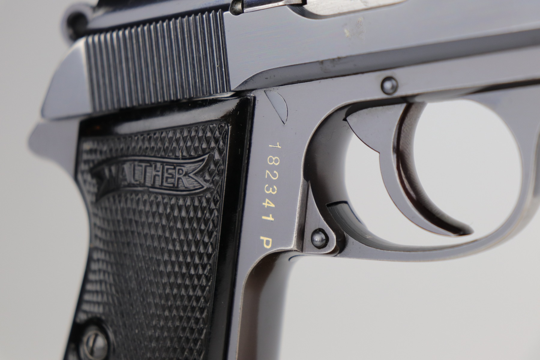11/3/20 – This is an excellent example of a Walther PP that was ordered by the Swedish Police force. This is evidenced by the serial range this gun falls in and the factory-added lanyard ring on the butt of the frame. This particular example is matching and has the proper “Eagle N” firing proofs. It has retained about 93-94% of its original bluing. There are areas of wear around the muzzle, high edges of the slide, on the tang, one spot on the front strap, a spot at the base of the back strap, and some spotty wear on the right side of the slide. The gun comes with excellent period-correct grips and a period-correct black finger extension magazine. The bore is excellent – shiny with strong rifling, a few areas of very minor freckling.