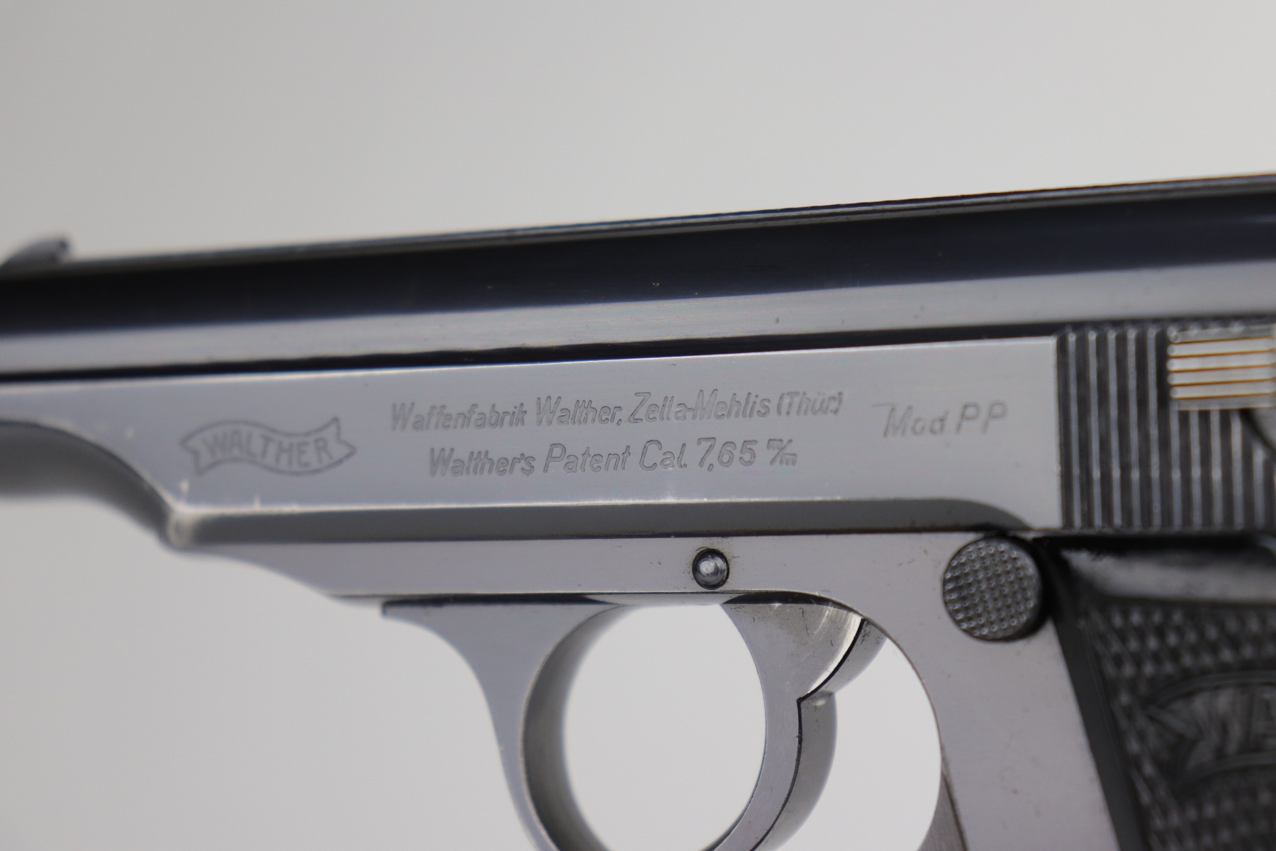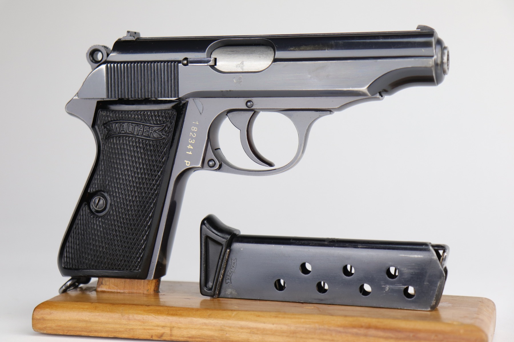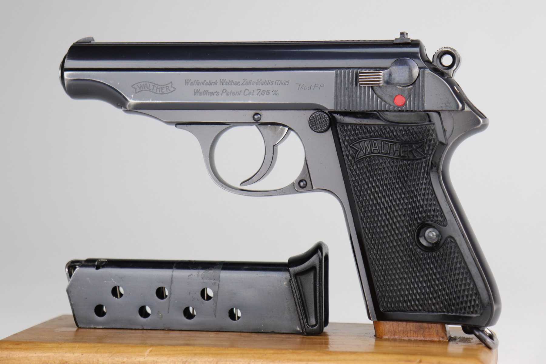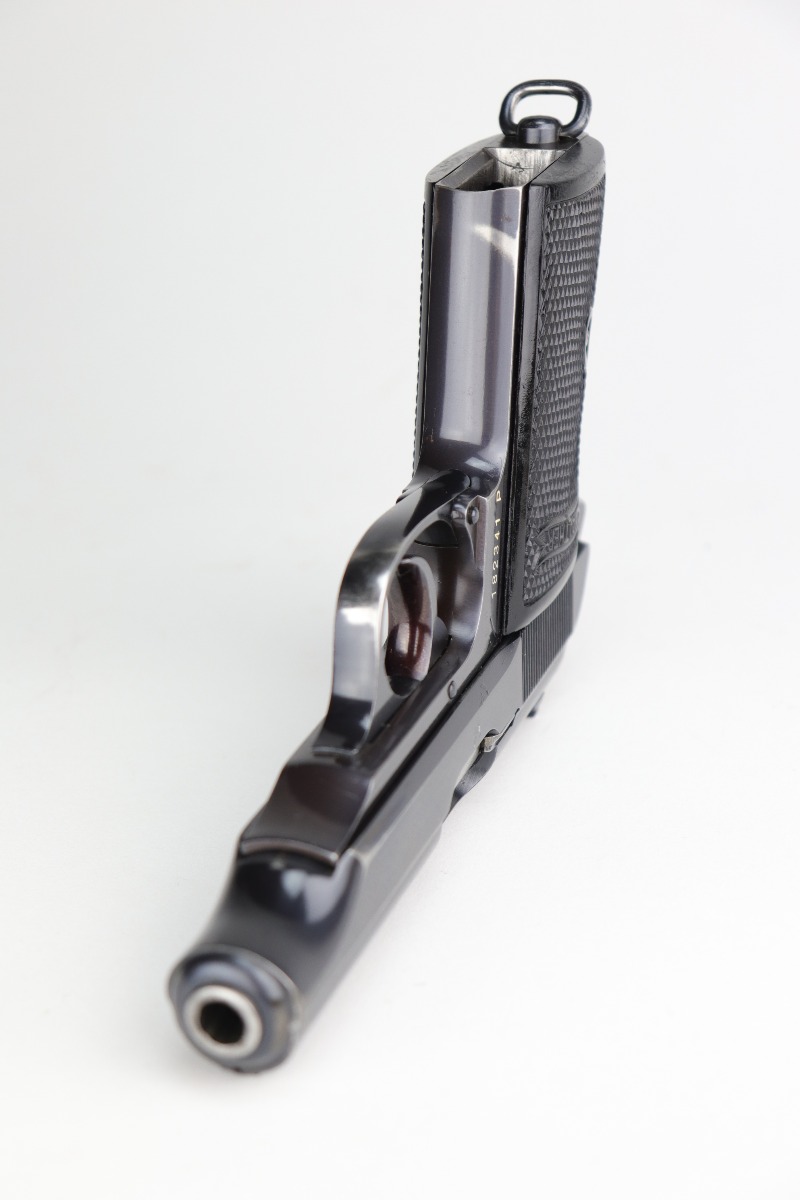 11/3/20 – This is an excellent example of a Walther PP that was ordered by the Swedish Police force. This is evidenced by the serial range this gun falls in and the factory-added lanyard ring on the butt of the frame. This particular example is matching and has the proper “Eagle N” firing proofs. It has retained about 93-94% of its original bluing. There are areas of wear around the muzzle, high edges of the slide, on the tang, one spot on the front strap, a spot at the base of the back strap, and some spotty wear on the right side of the slide. The gun comes with excellent period-correct grips and a period-correct black finger extension magazine. The bore is excellent – shiny with strong rifling, a few areas of very minor freckling.