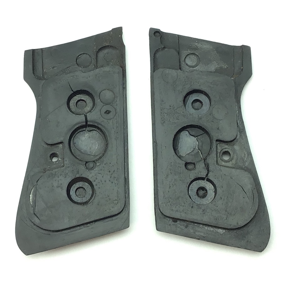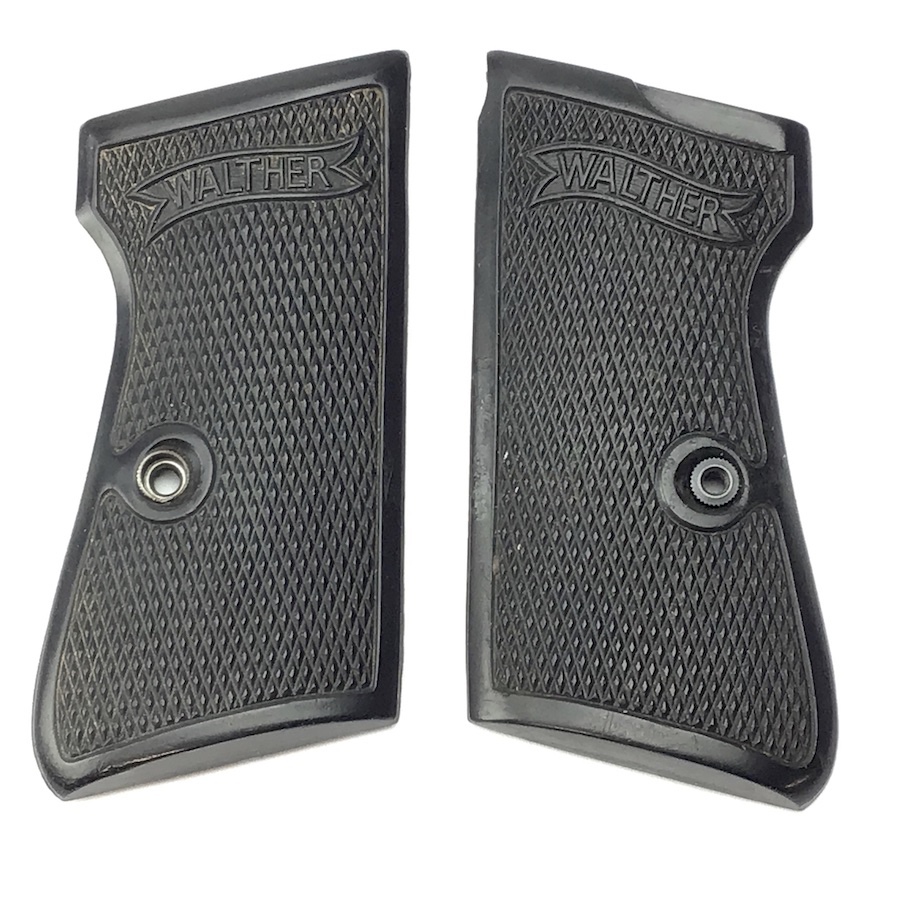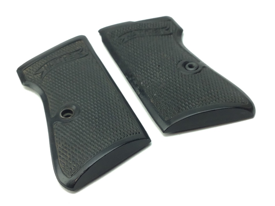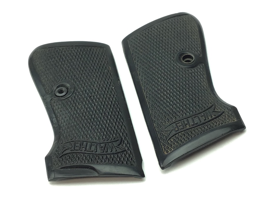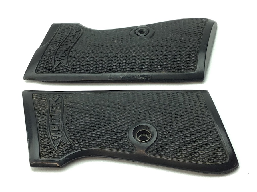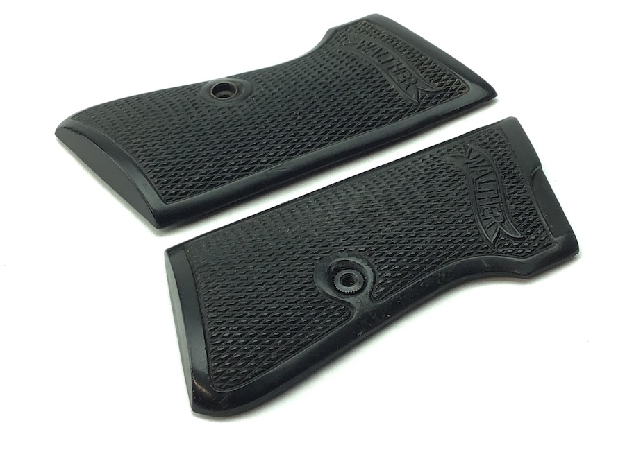 1/28/21 – This is an original pair of bakelite early WW2 Walther PP grips. The grips are early wartime variation with internal weights. Nice checkering and Walther logo. No cracks or chips. Overall in excellent condition and guaranteed original.