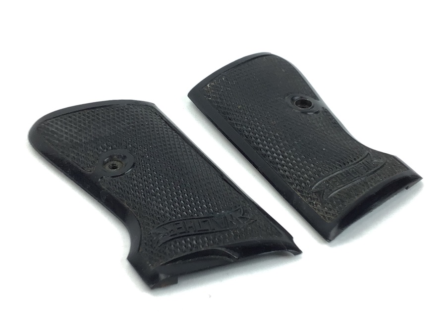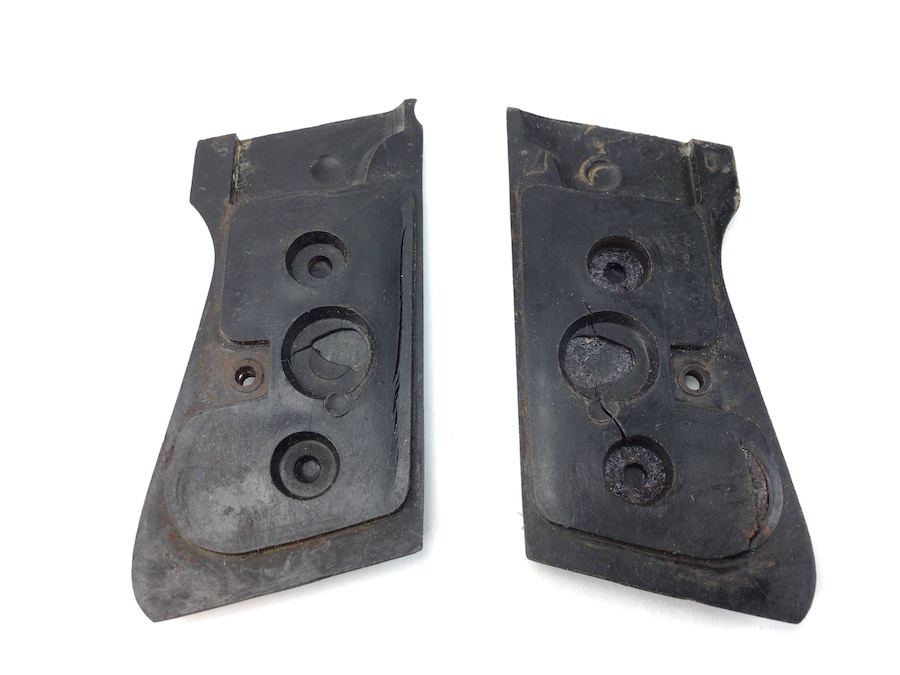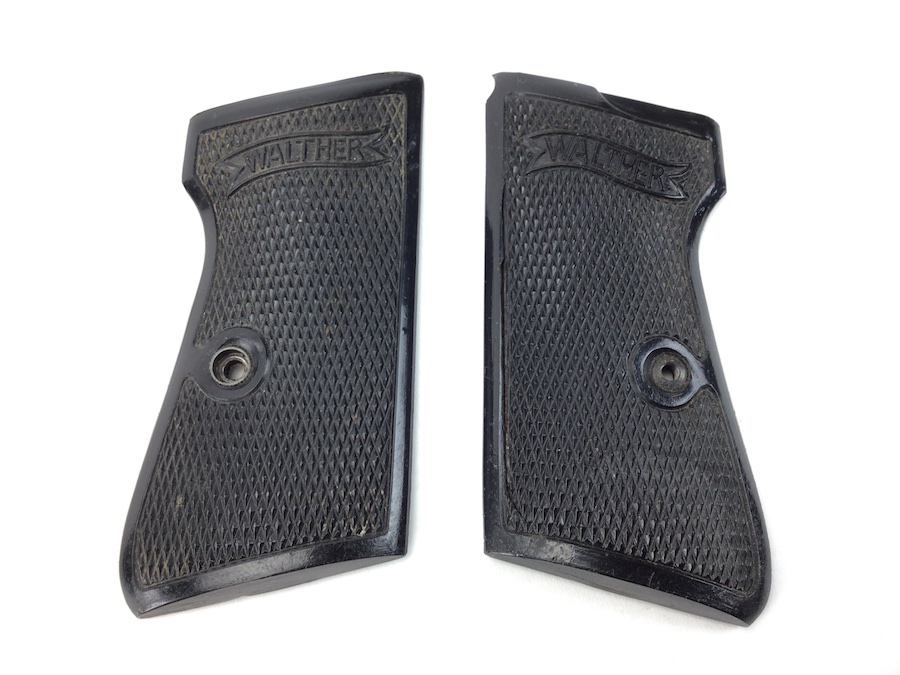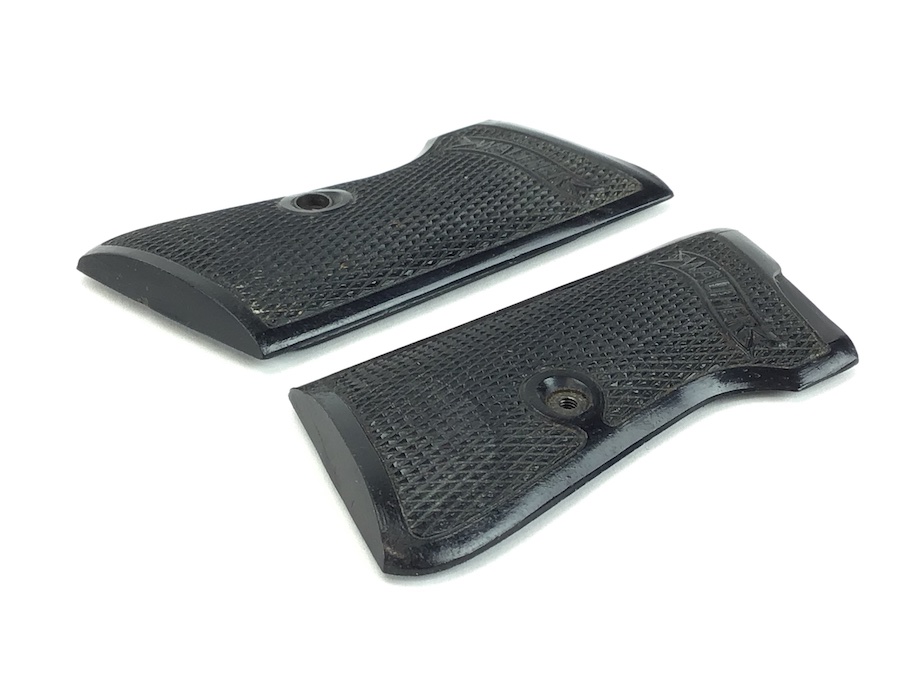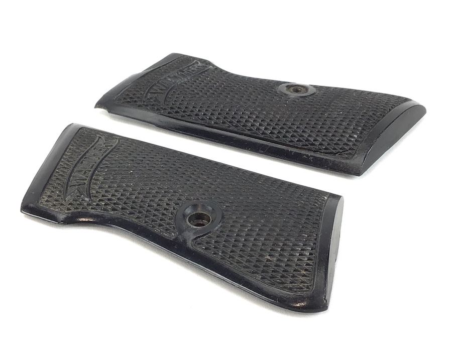 5/25/21 – This is an original pair of bakelite early WW2 Walther PP grips. The grips are early wartime variation with internal weights. Nice checkering and Walther logo. No cracks or chips. Overall in excellent condition and guaranteed original.