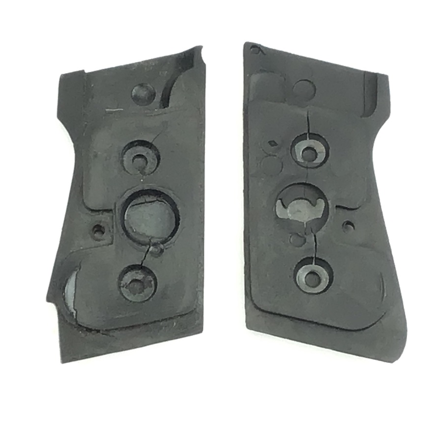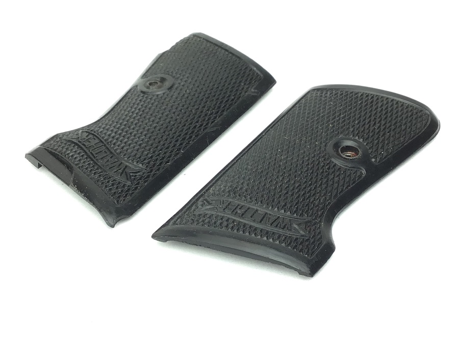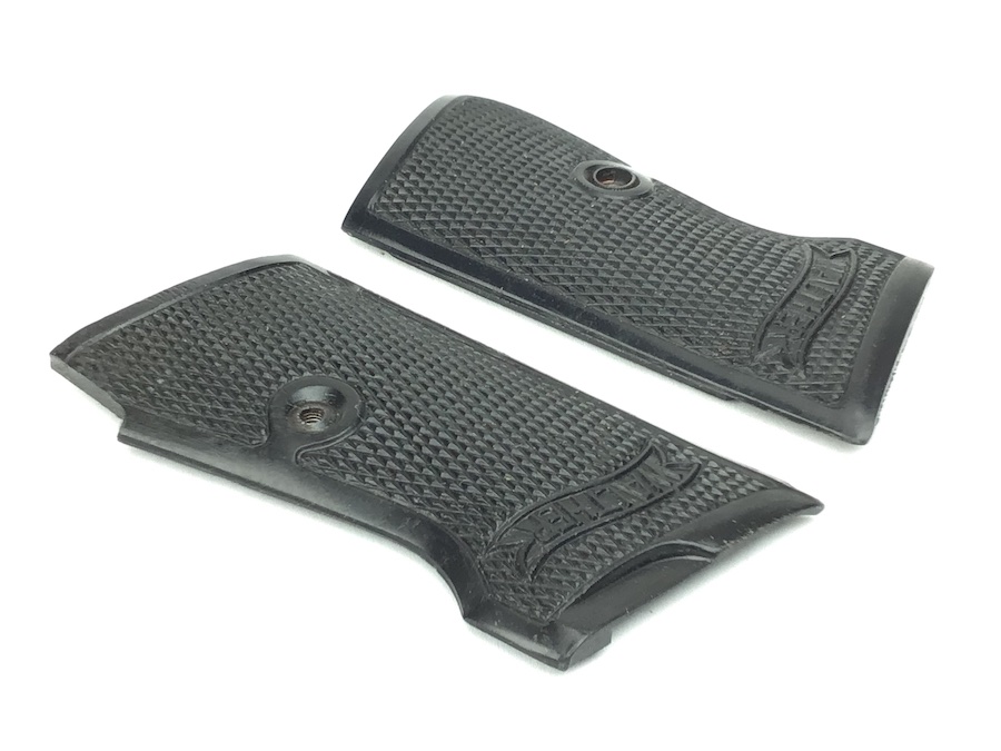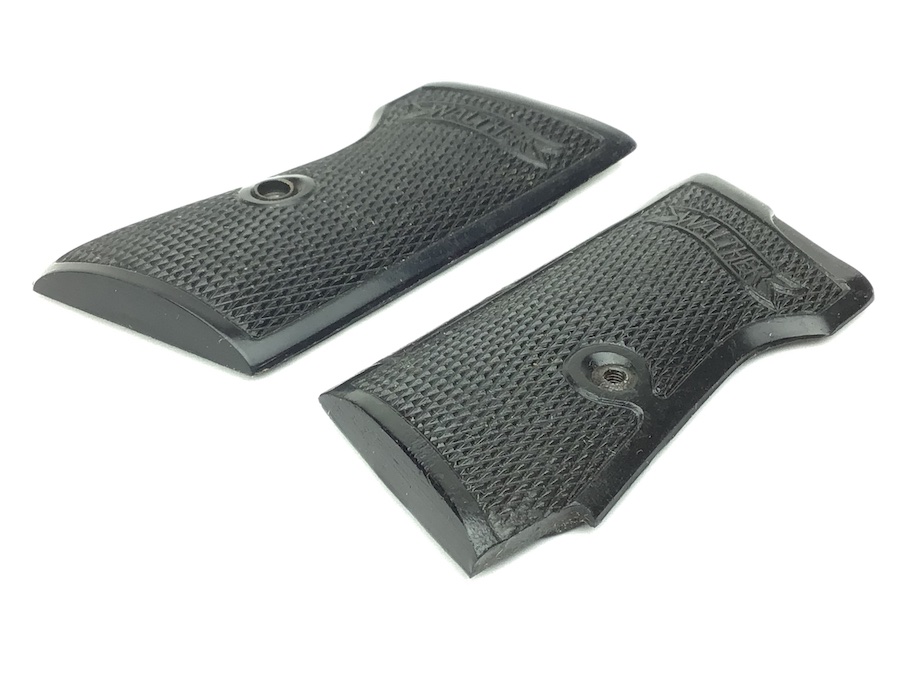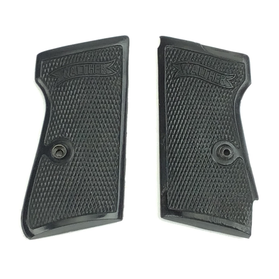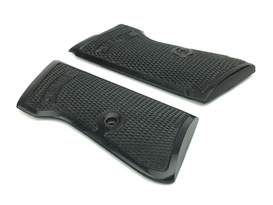 10/18/21 – This is an original pair of bakelite, early WW2 Walther PP grips. The grips are early wartime variation with internal weights. Nice checkering and Walther logo. No cracks or chips.