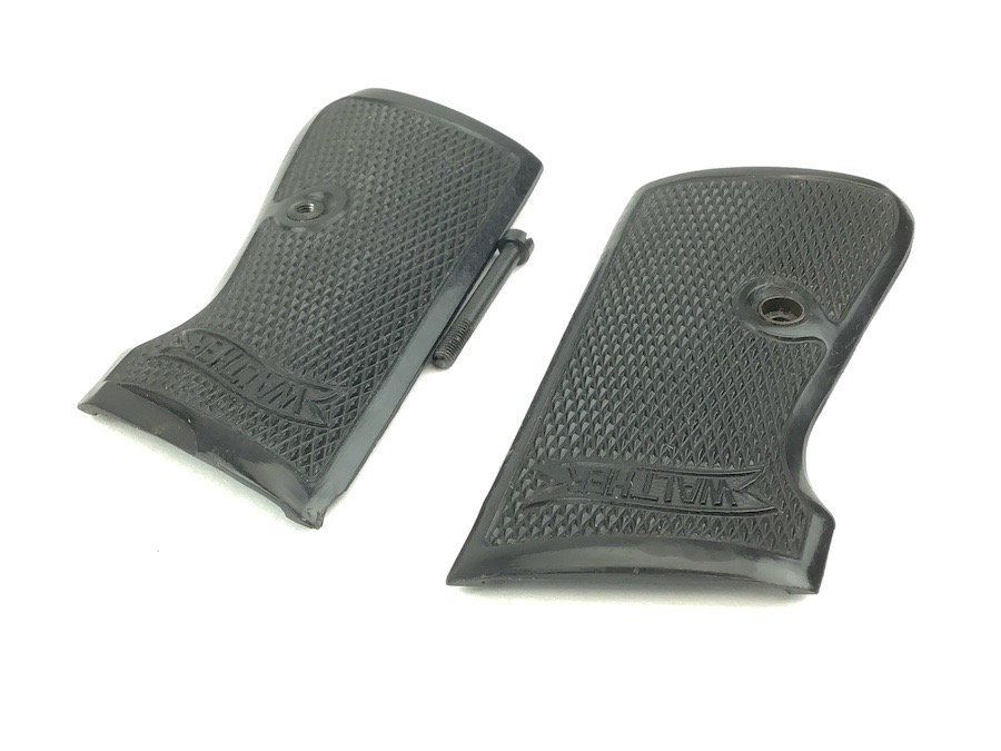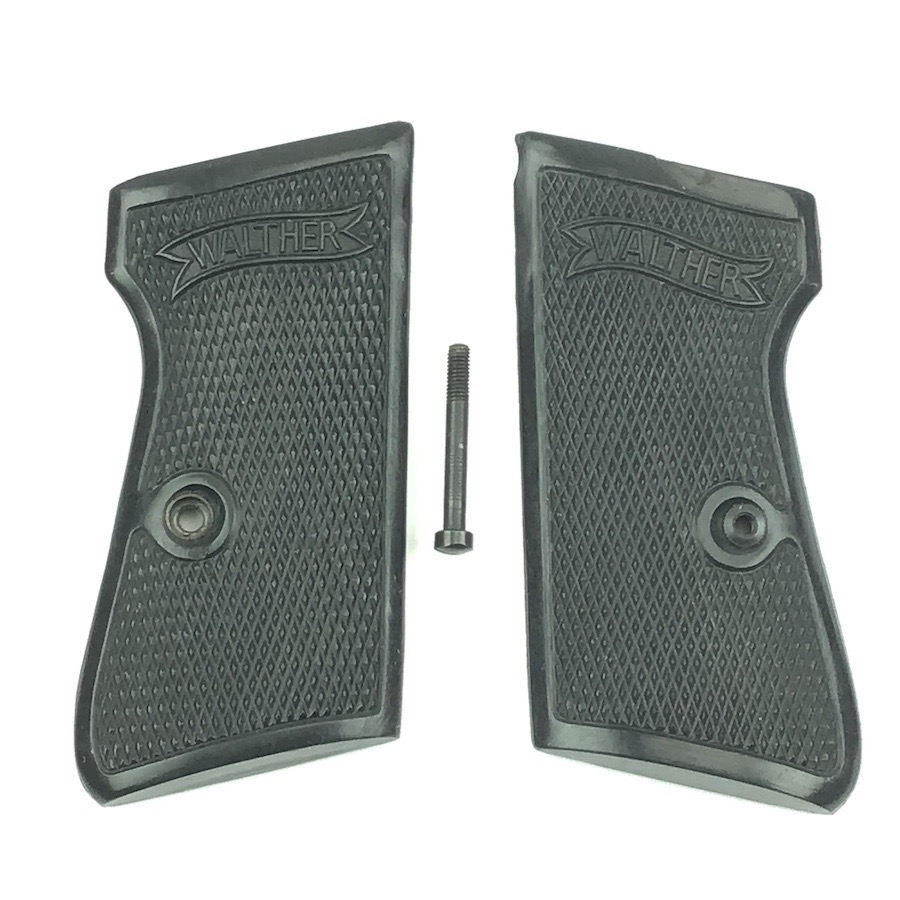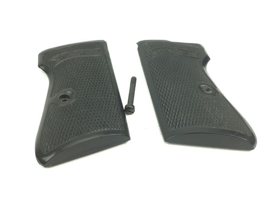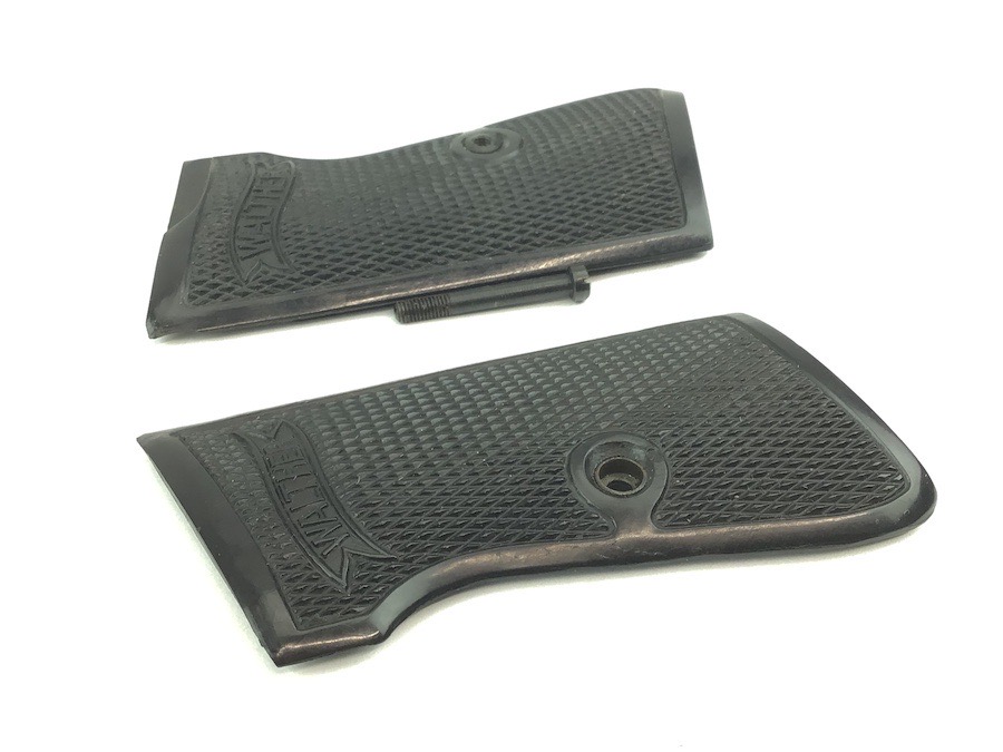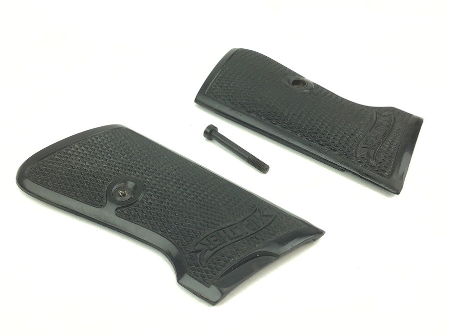 10/17/22 – Original and excellent condition. Walther PP Grips and screw. The grips are early wartime variation with internal weights. Nice checkering and Walther logo. No cracks or chips.