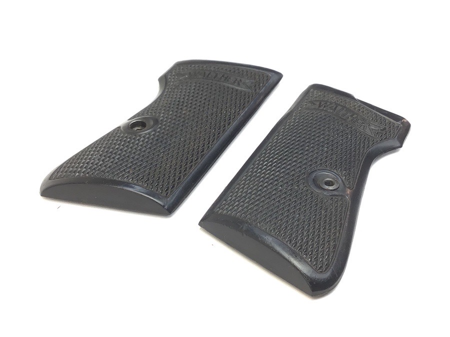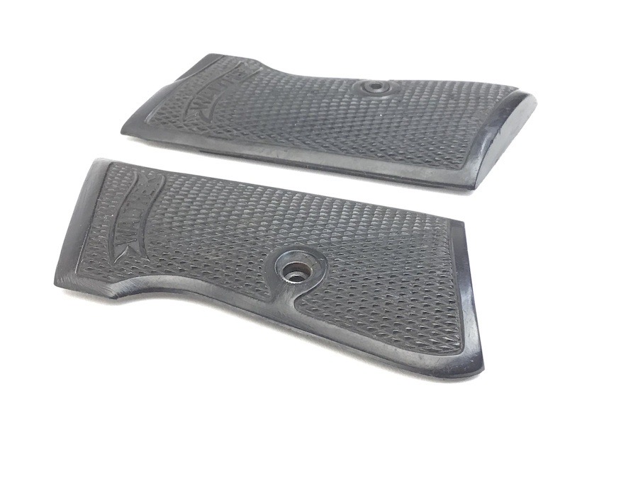 7/31/23 – Original and excellent condition. Walther PP Grips and screw. The grips are early wartime variation with internal weights. Nice checkering and Walther logo. No cracks or chips. Overall in excellent condition.