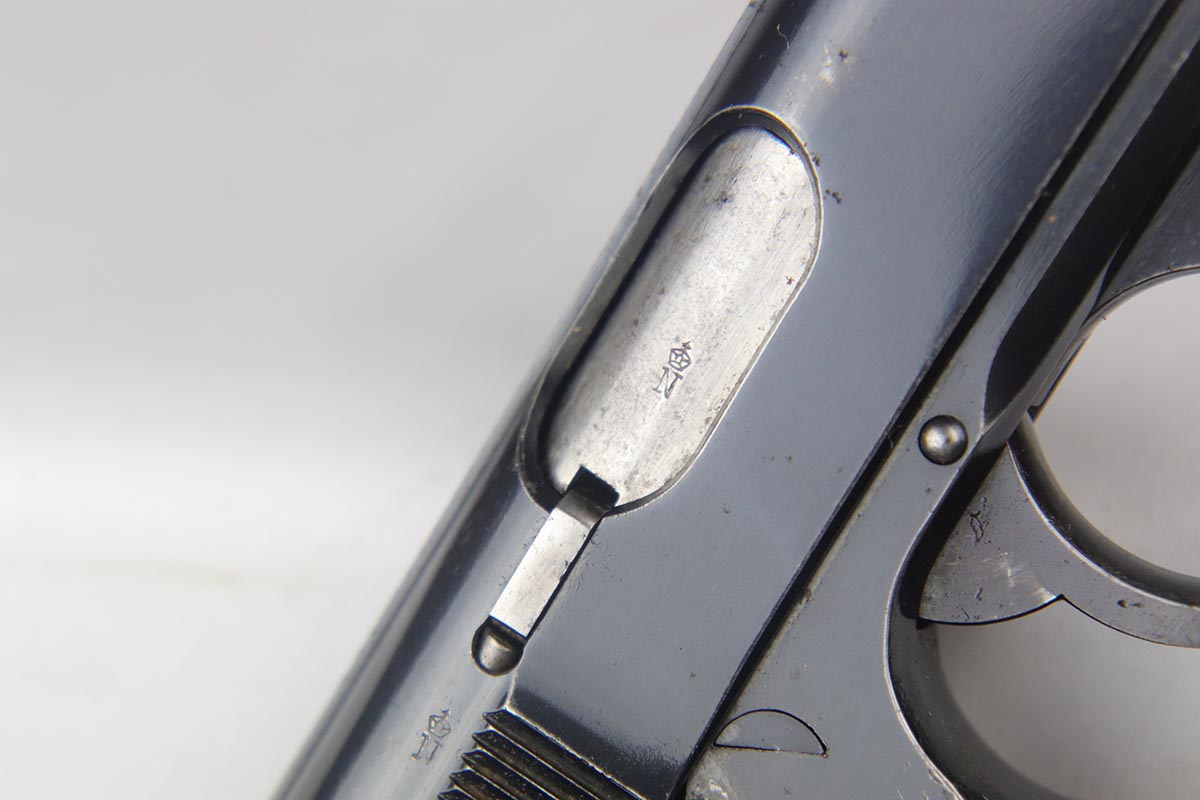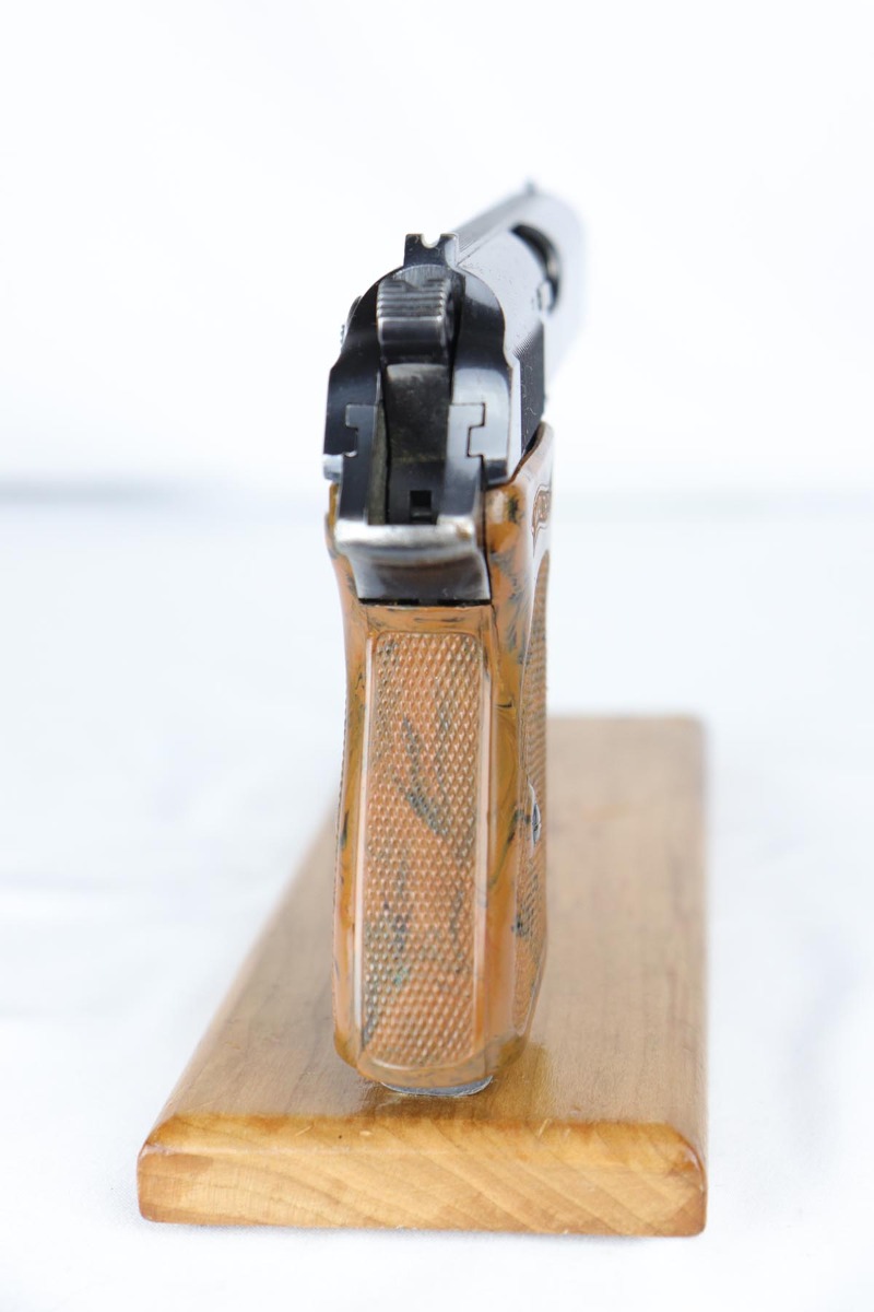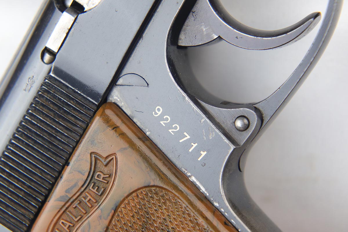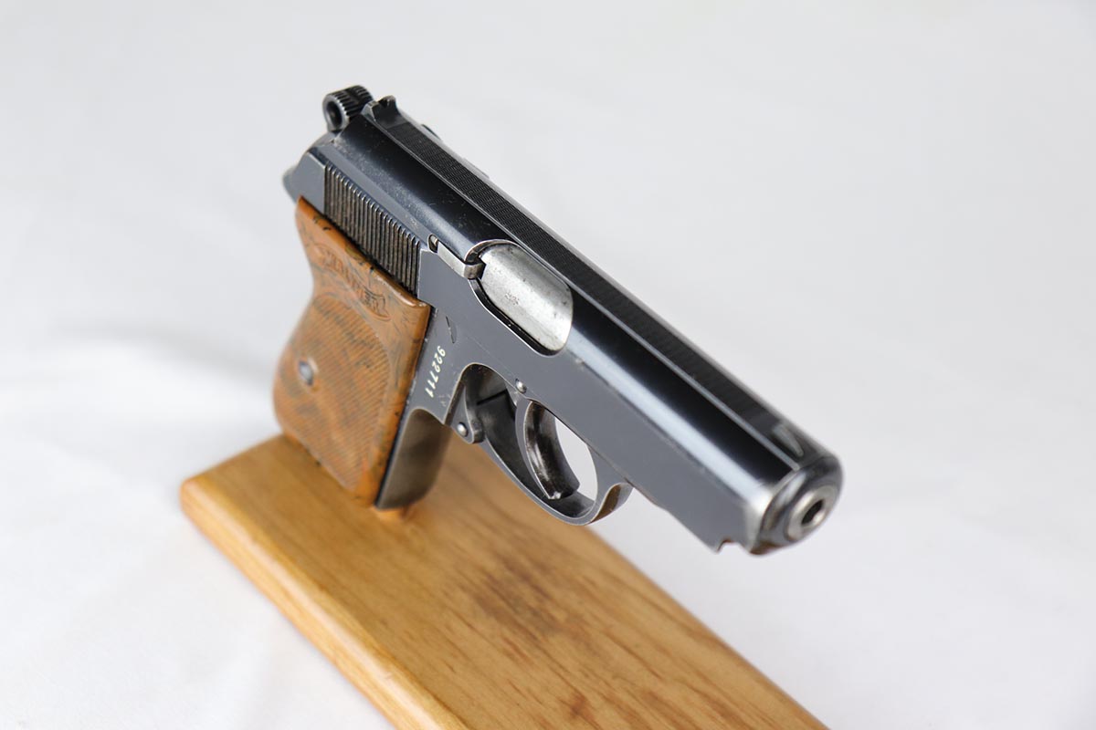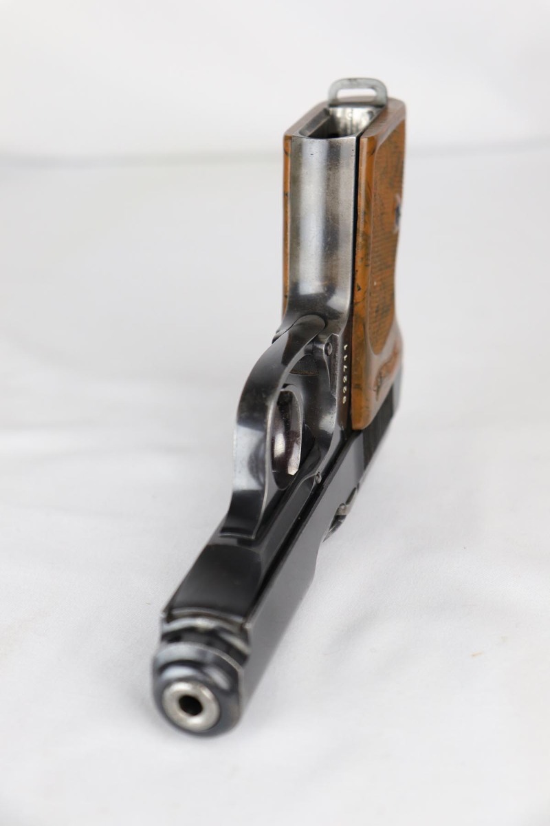 6/27/18 – Made in 1935 for the German commercial market, this is a .22 caliber Walther PPK in original configuration. The bluing rates at about 85% with muzzle wear on the slide and a very thin front strap. Fantastic grip with no cracks or chips. Very nice finger extension magazine with only small, minor surface crack. Terrific bore.