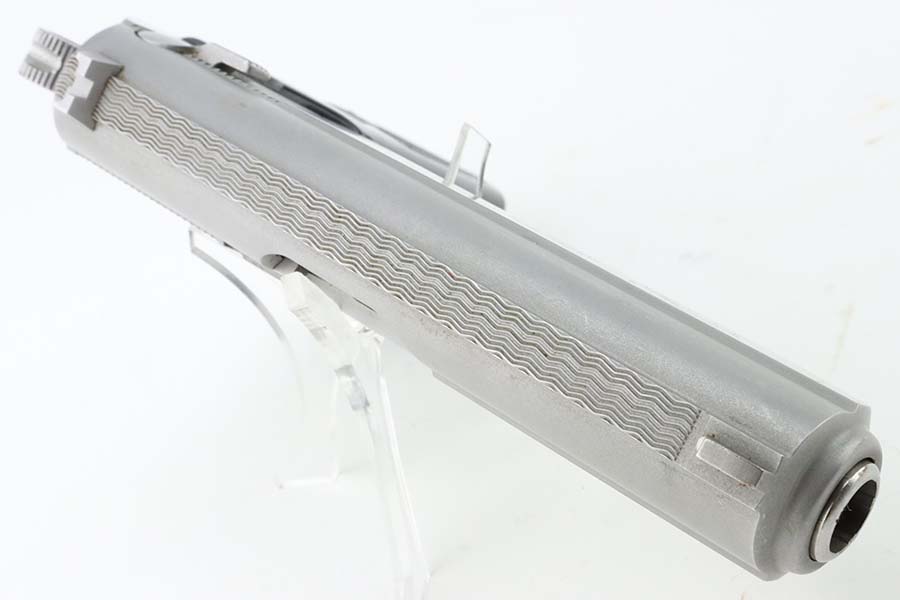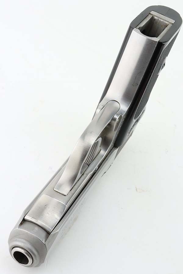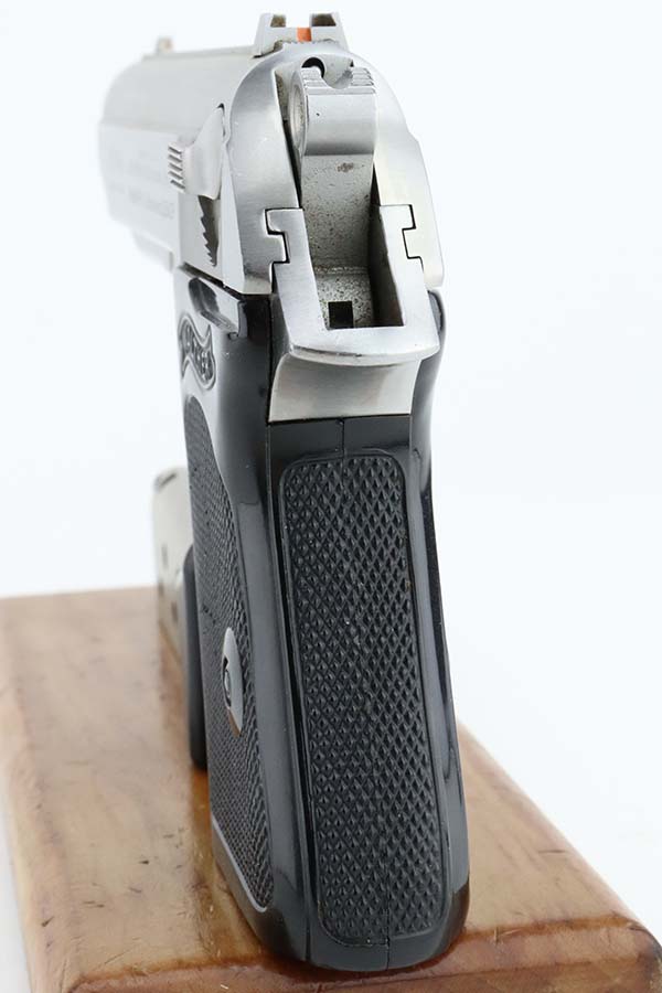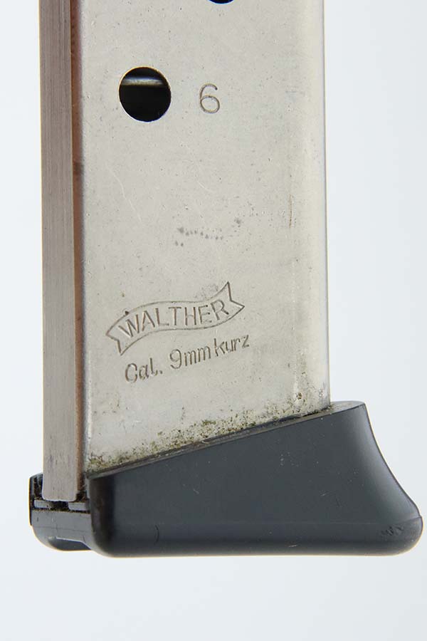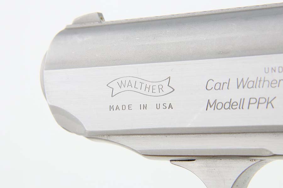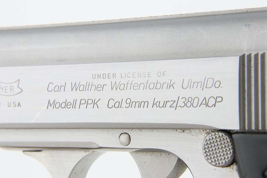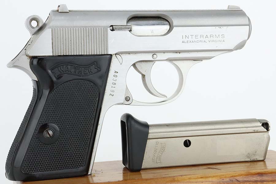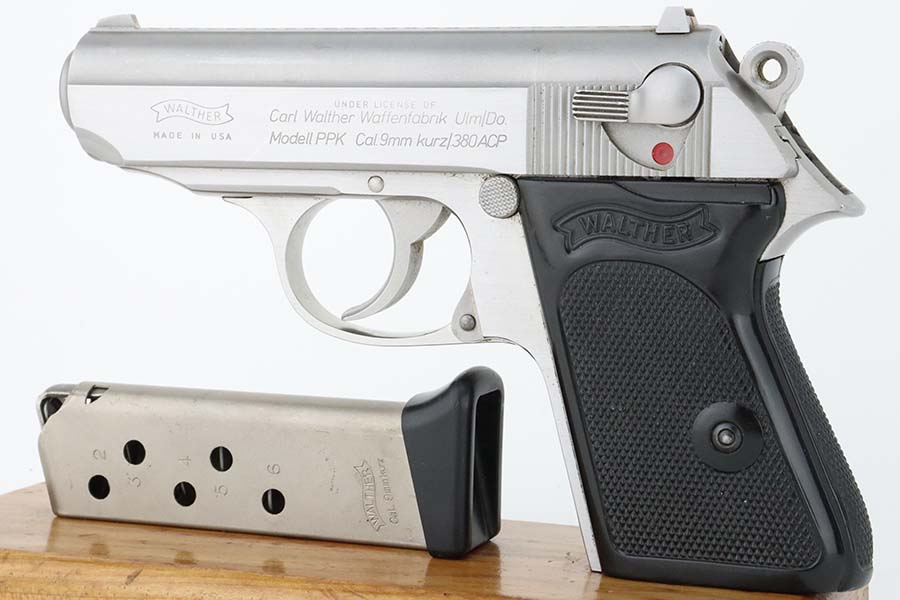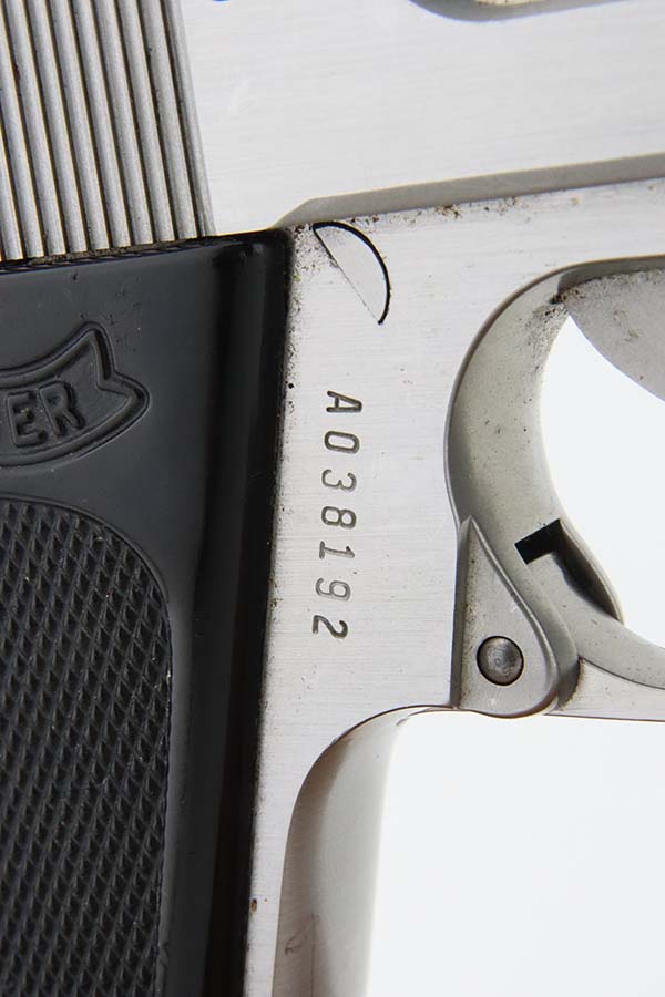 3/21/24 – This is a Walther PPK, chambered in 9mm kurz or .380 ACP. It has a really nice stainless finish and is fitted with black plastic grips. Comes with one finger extension magazine. There are light surface scratches on both sides of the slide. Minty bore.