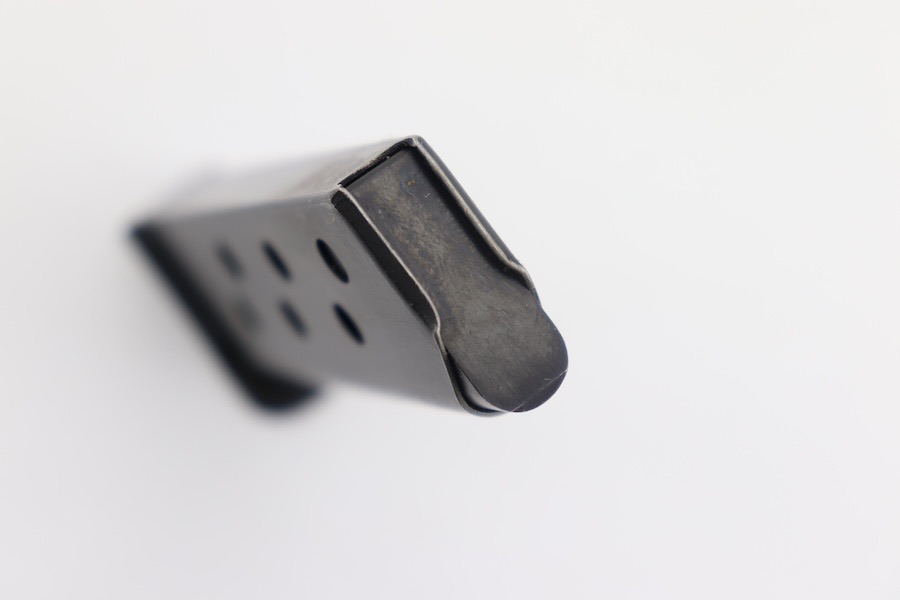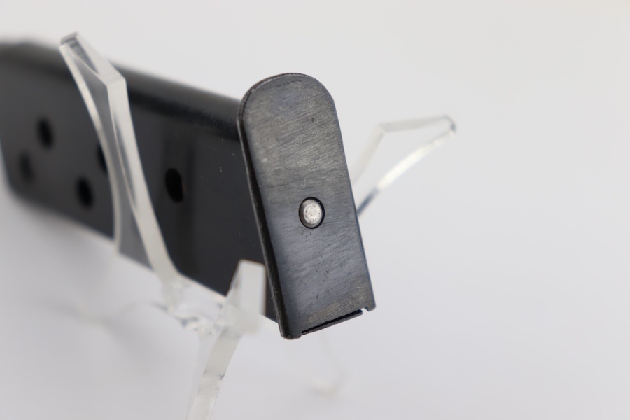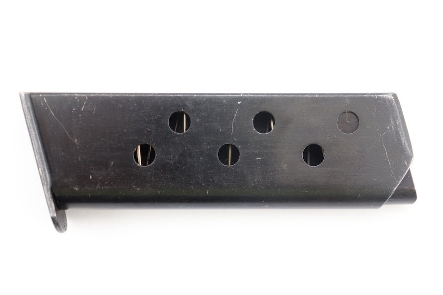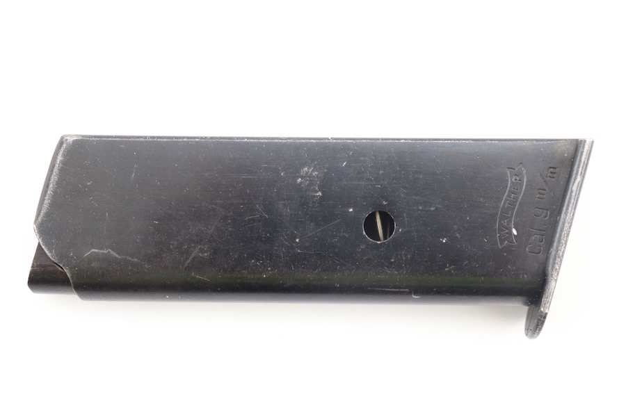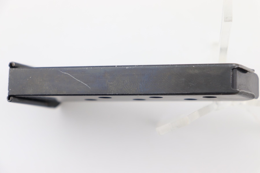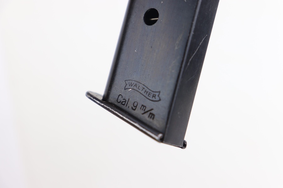 2/29/24 – This is an excellent condition example of a Walther PPk 9mm/(.380) magazine. This is a wartime example, as indicated by the m/m. The body of the magazine has retained nearly all of its bluing finish and only has a few light surface scratches here and there. The left side of the tube is marked with the Walther banner and “CAL. 9m/m” underneath. The spring is strong and fully functional.