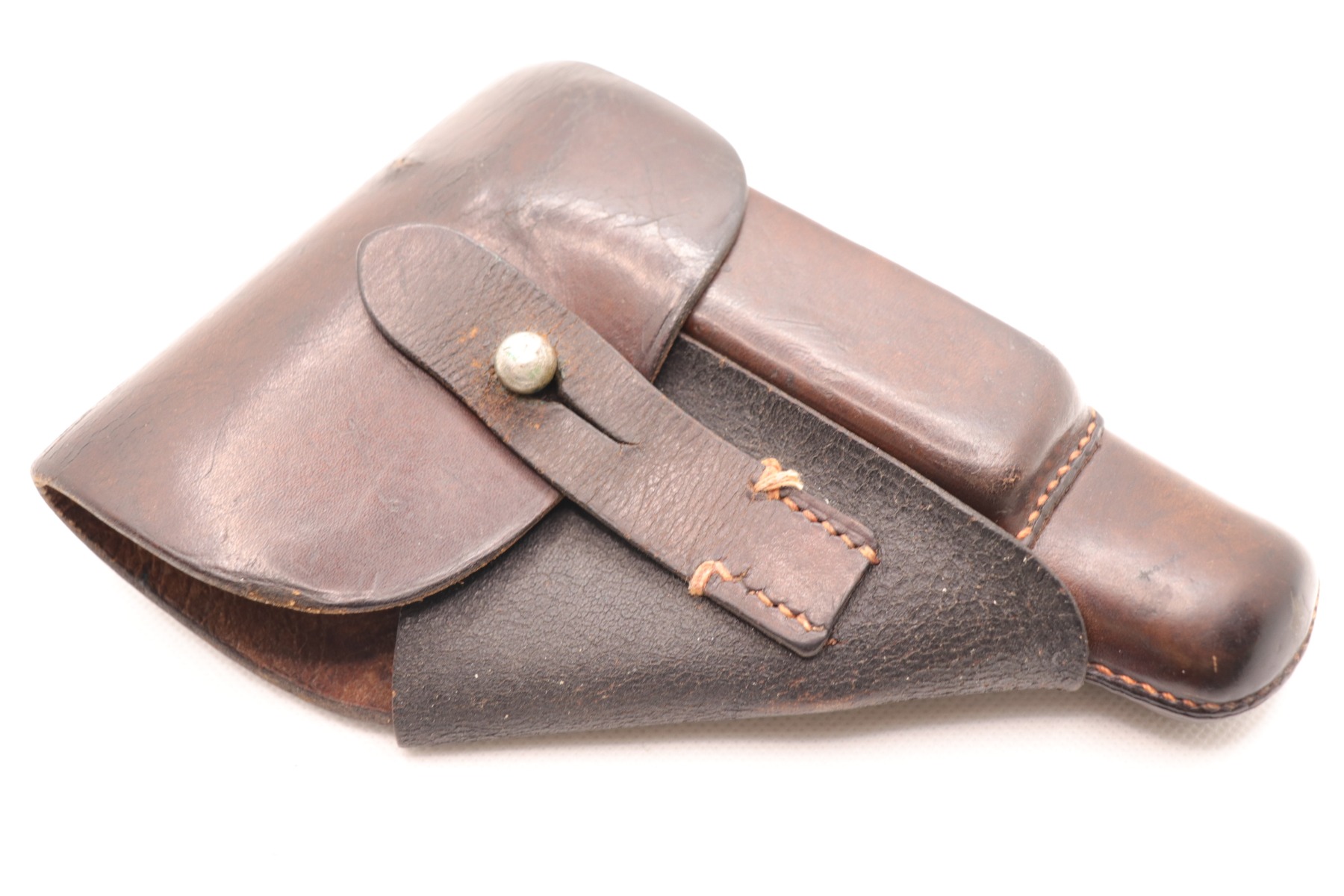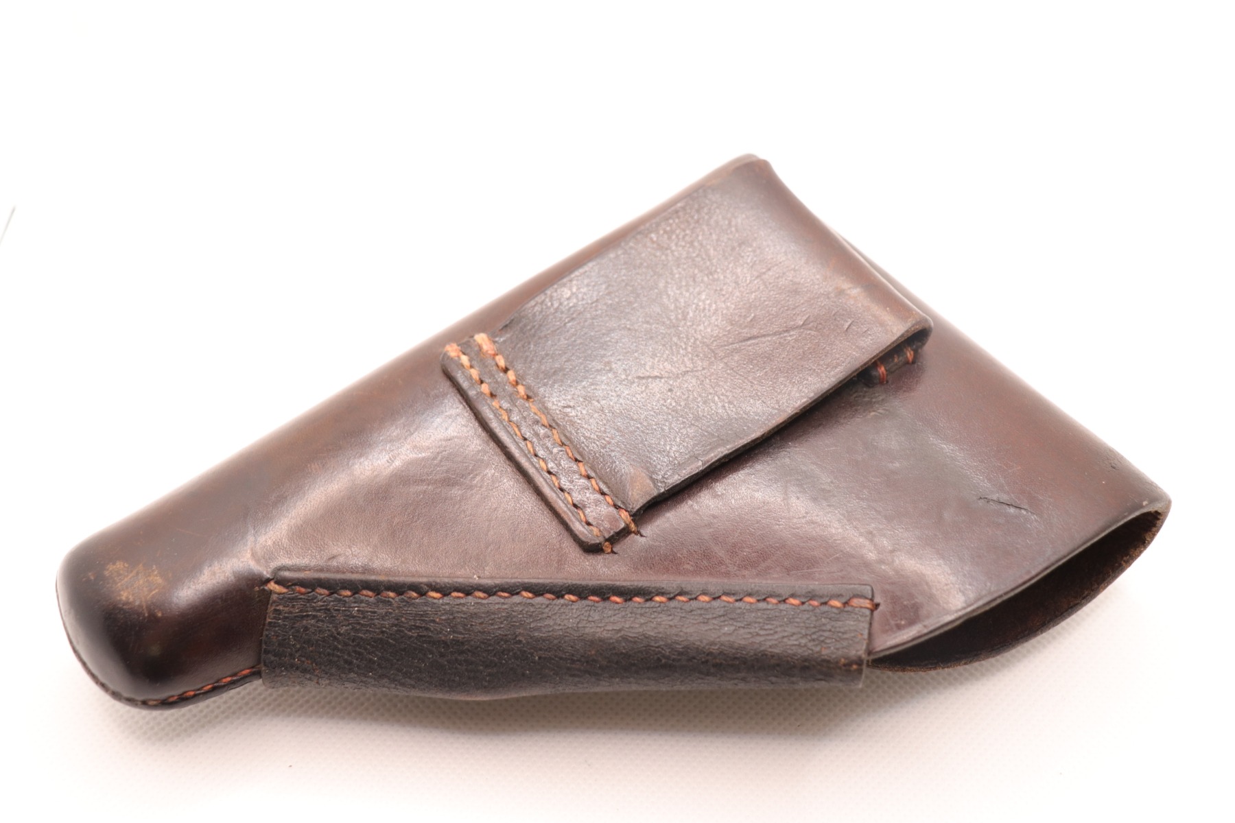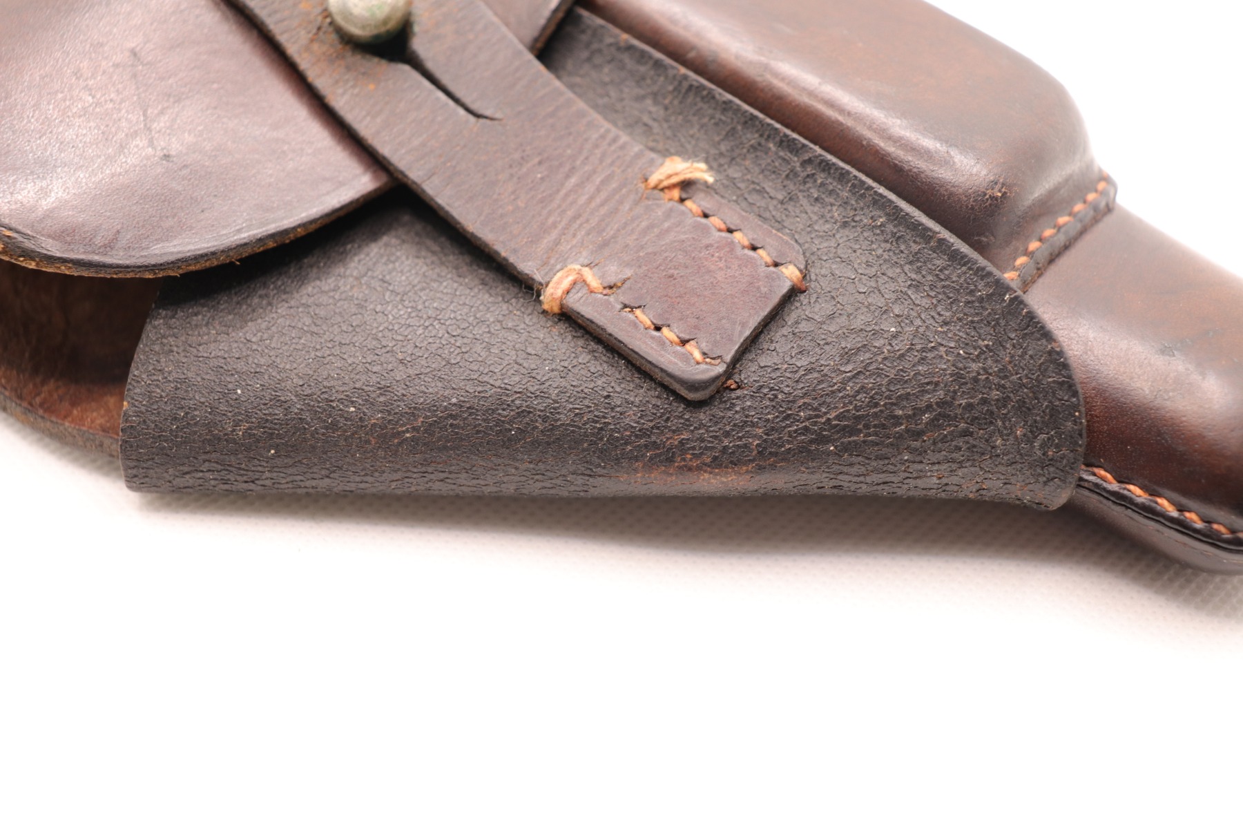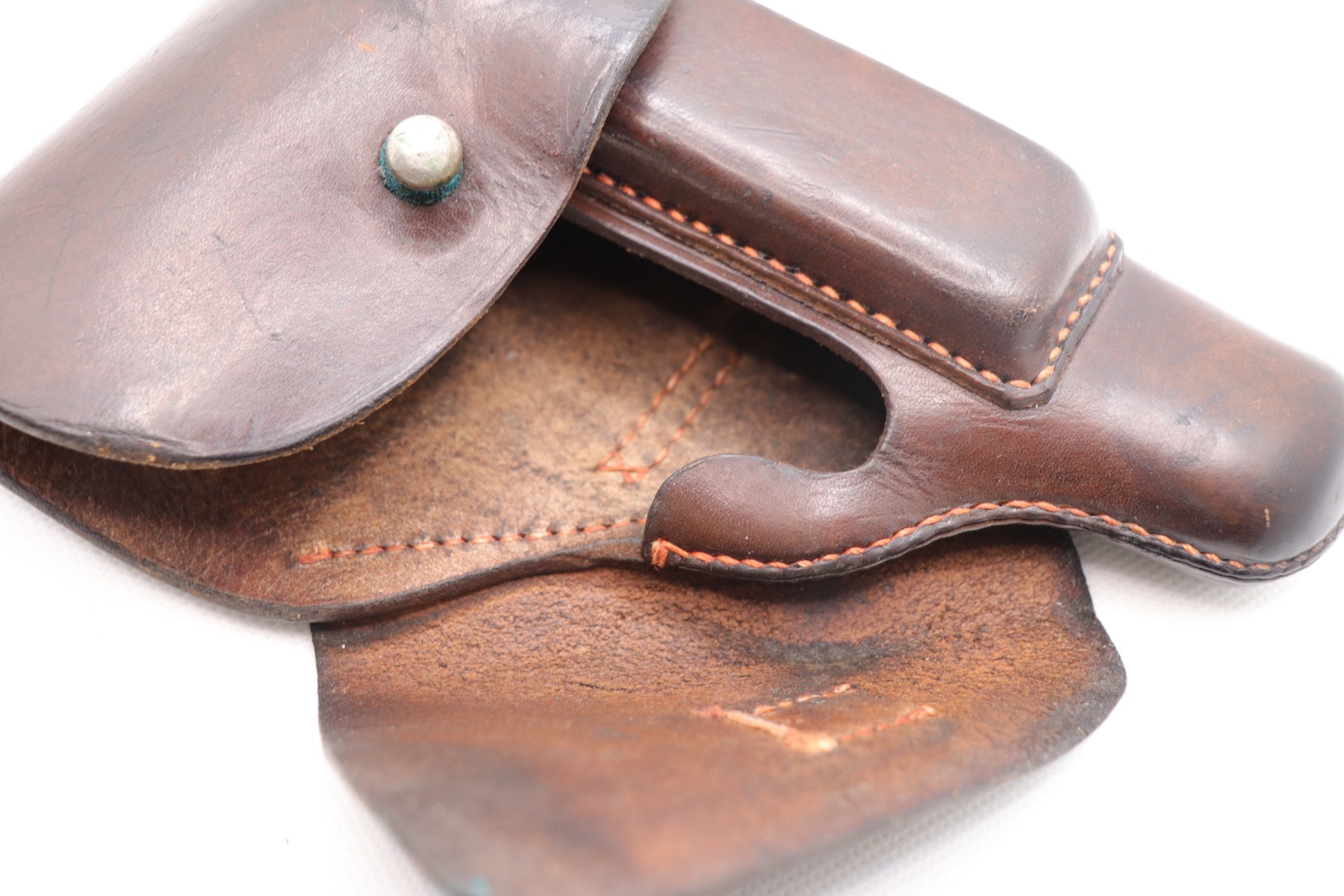 10/21/20 – This holster holds the Walther PPK. It is made of dark brown leather with orange piping. The flap is stamped DRGM AKAH. The holster also has the trademark brass stud to keep the pistol secure. It is in overall very good condition. However, there is a small hole at the top of the leather flap, visible in photos. Priced accordingly.
