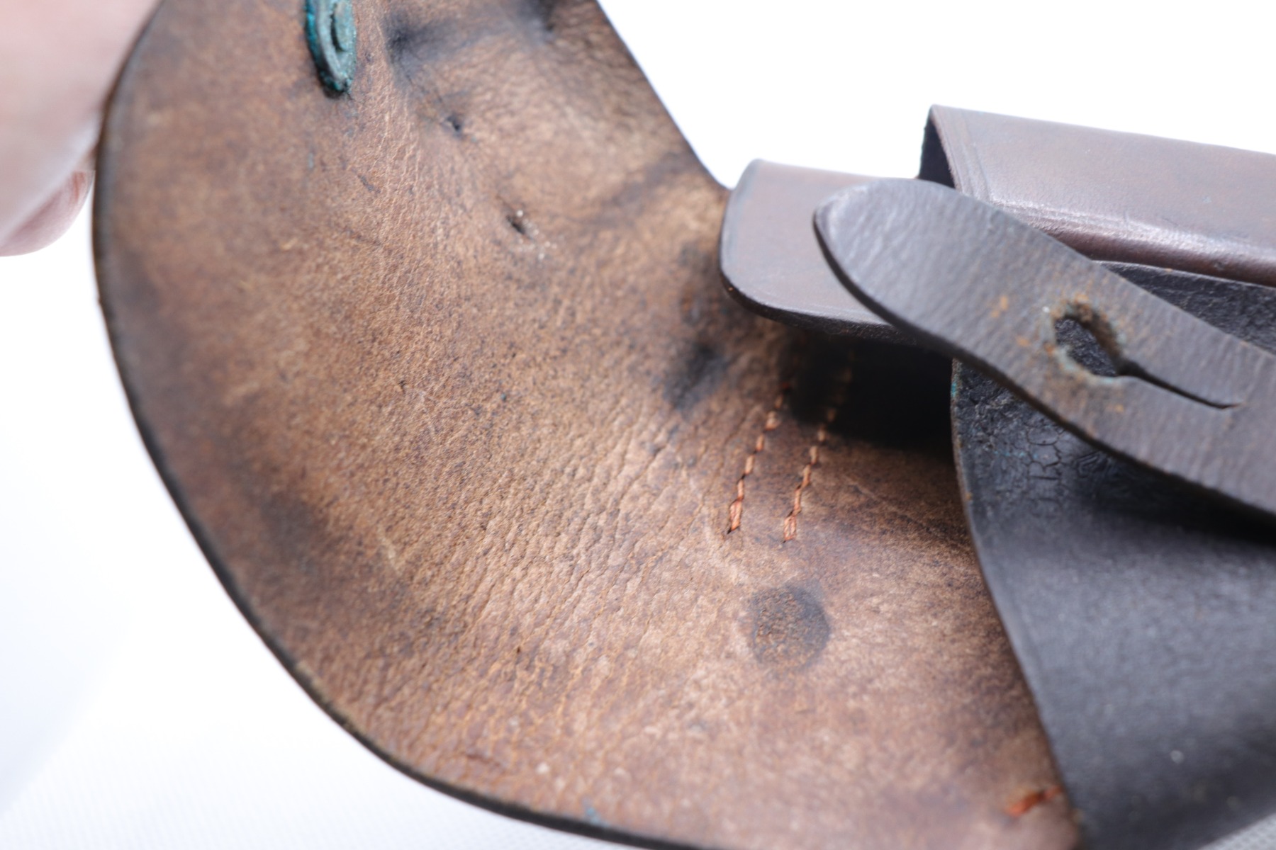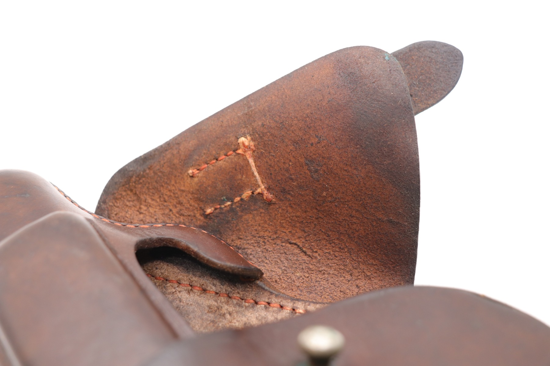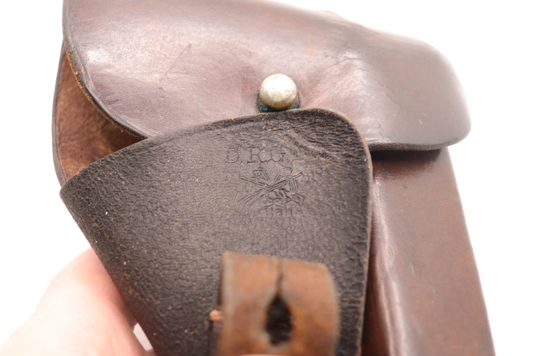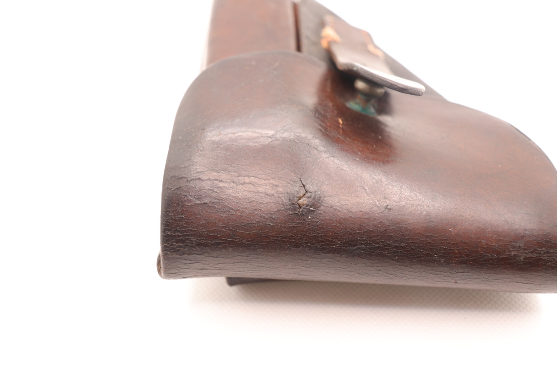 10/21/20 – This holster holds the Walther PPK. It is made of dark brown leather with orange piping. The flap is stamped DRGM AKAH. The holster also has the trademark brass stud to keep the pistol secure. It is in overall very good condition. However, there is a small hole at the top of the leather flap, visible in photos. Priced accordingly.