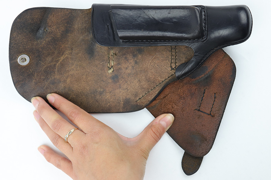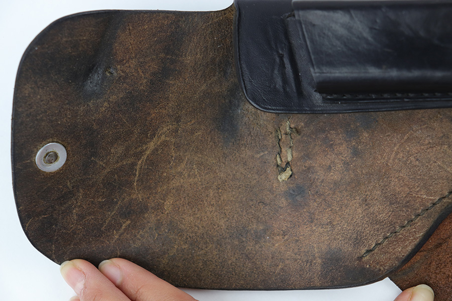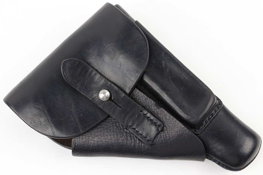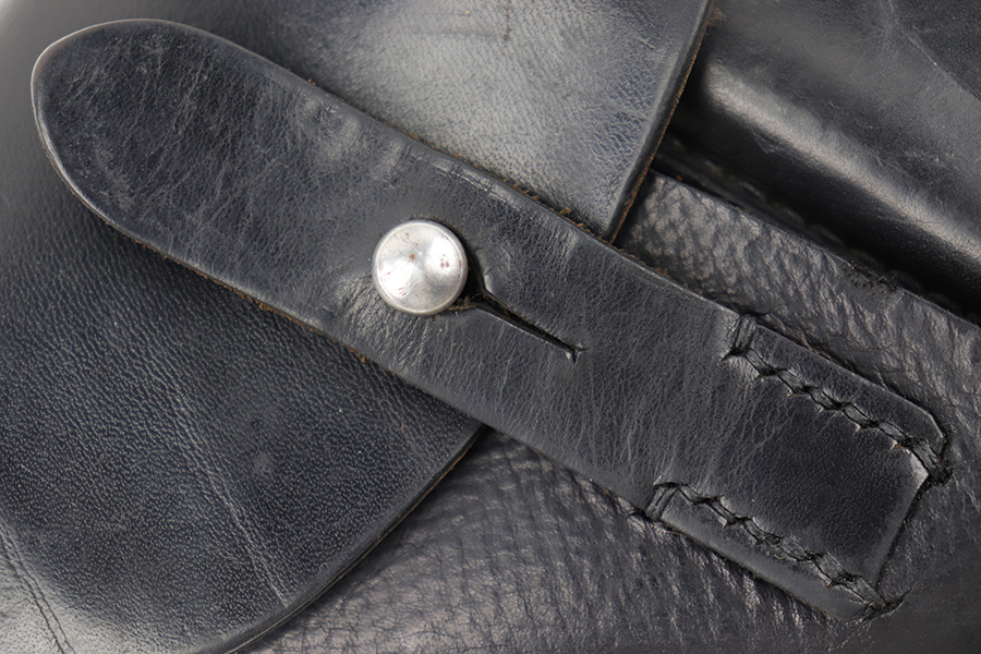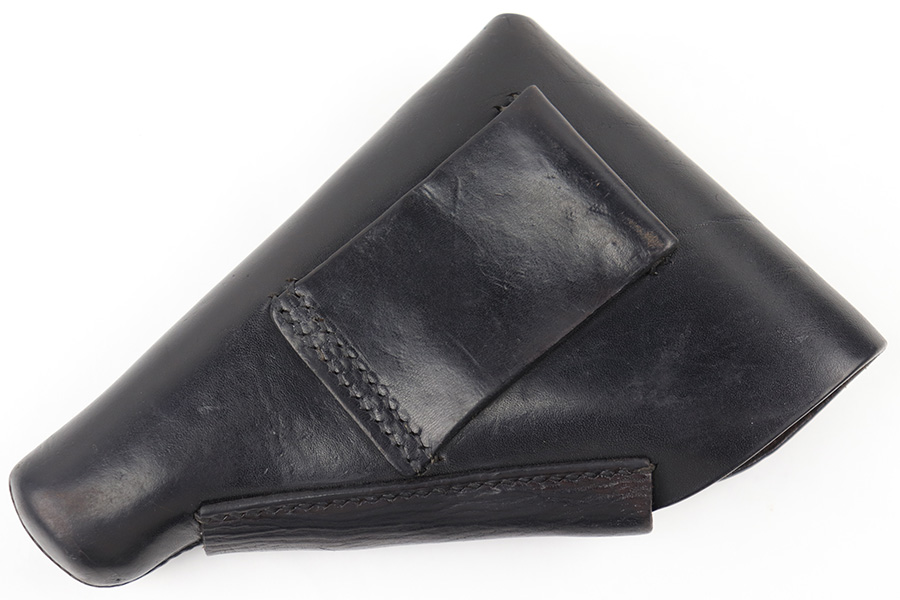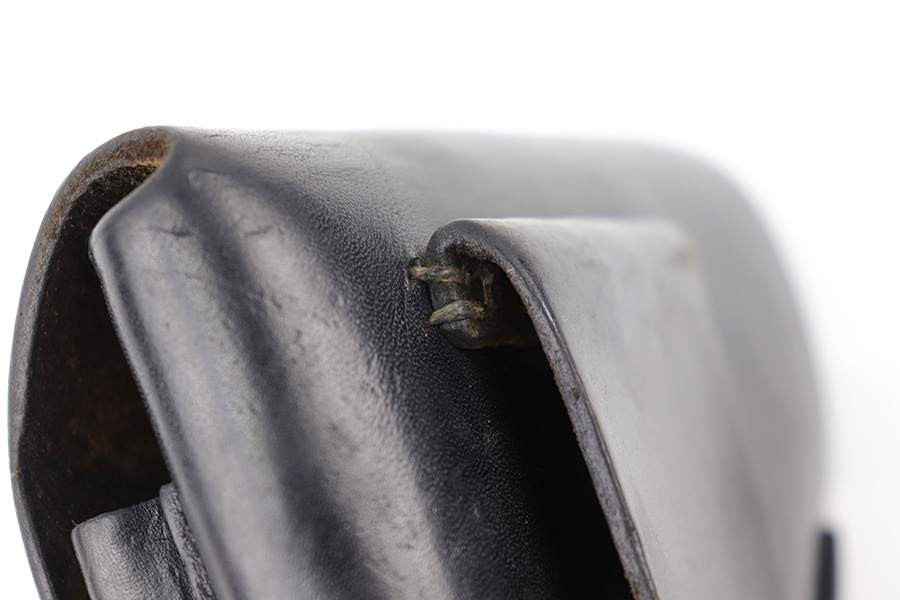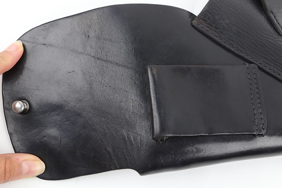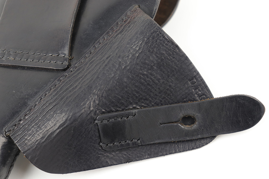 5/8/23 – This is an original WW2 production AKAH Walther PPK holster. The holster is in very good overall condition with all original leather. The stitching is all original as well, except for the top of the belt loop, which appears to have some period-correct added / repaired stitching. This is minor and doesn’t affect functionality of the holster. The rest of the stitching is tight. Maker stamped under the closure strap and has normal aging and use wear throughout.