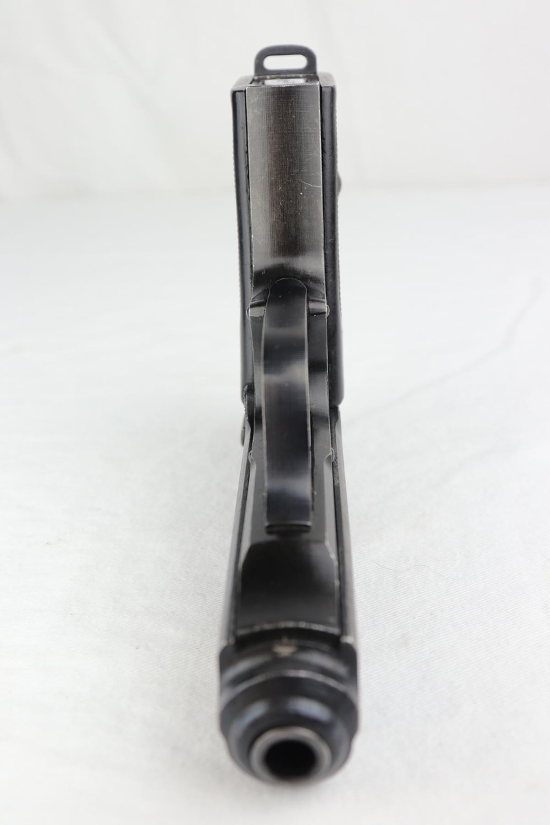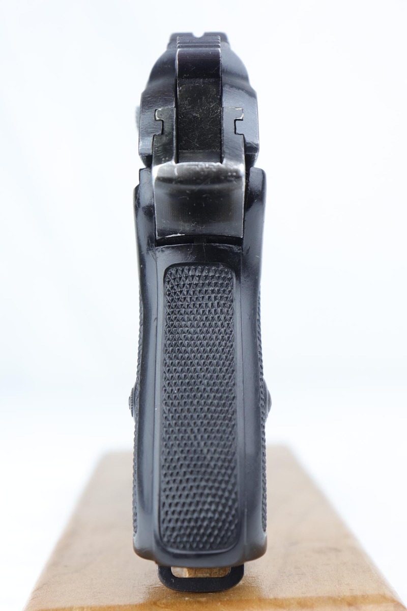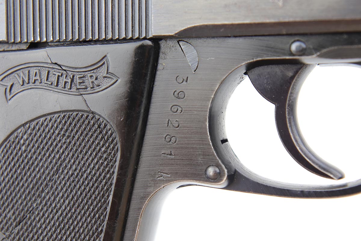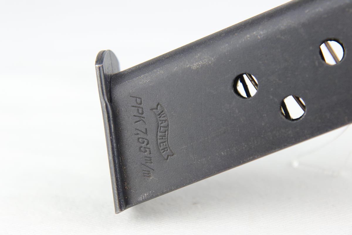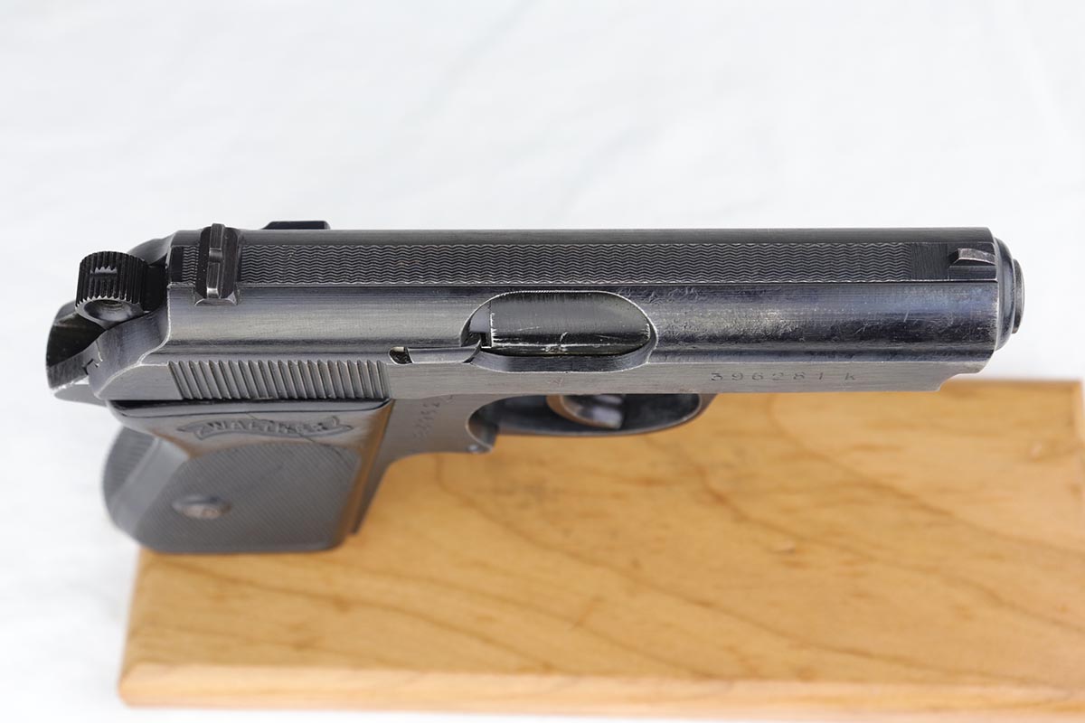 12/20/18 – This is a nice Walther PPK from World War II with duraluminum frame. All matching and original with military style blue that rates at about 94%. Muzzle wear on both sides, and minor thinning of the front strap and the right side slide. Terrific bore and magazine. Grip is original and in decent condition but does have a thin crack on the right side.