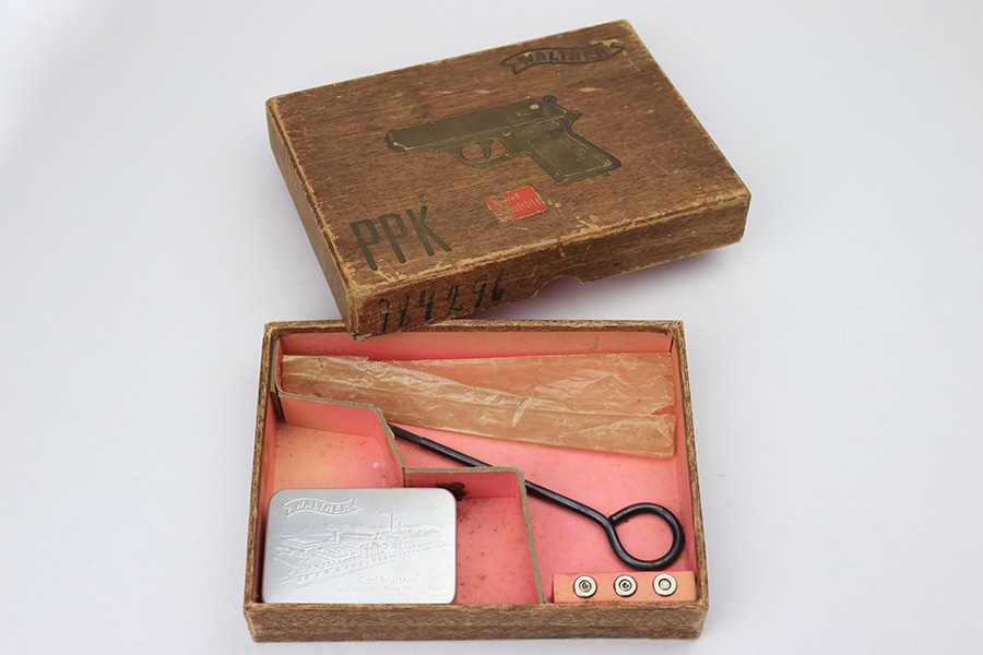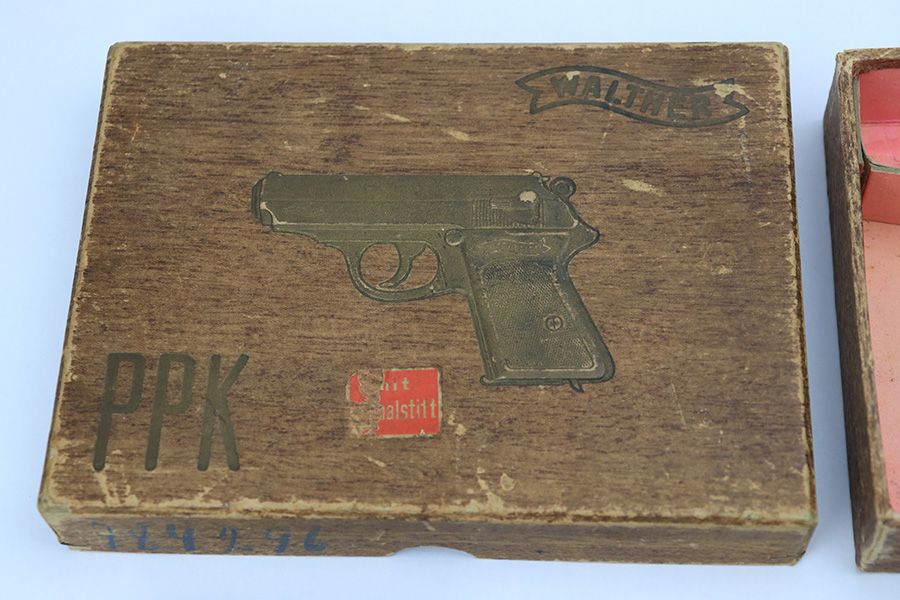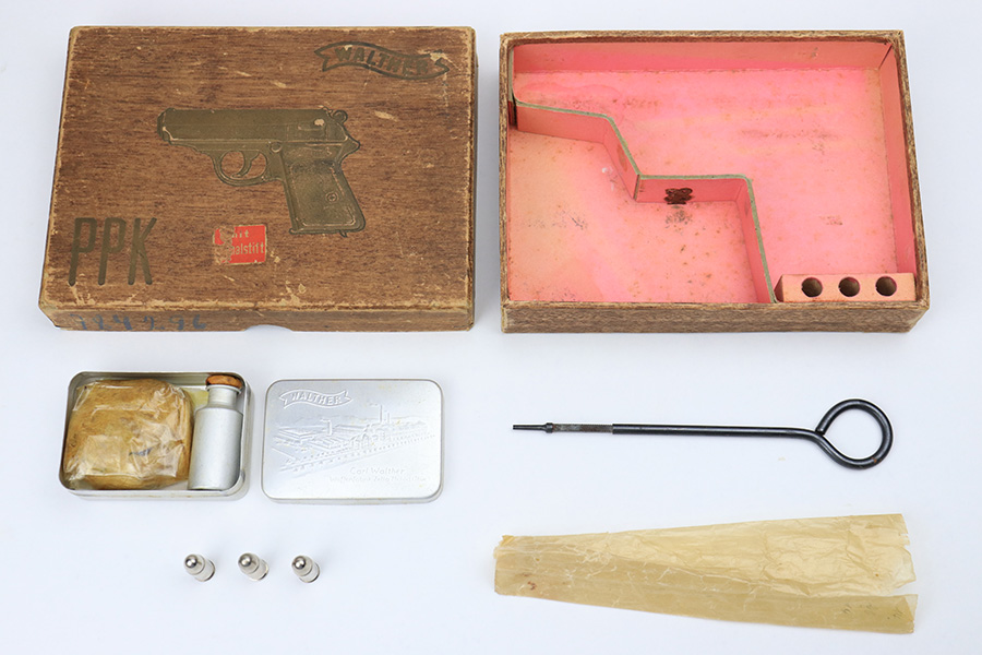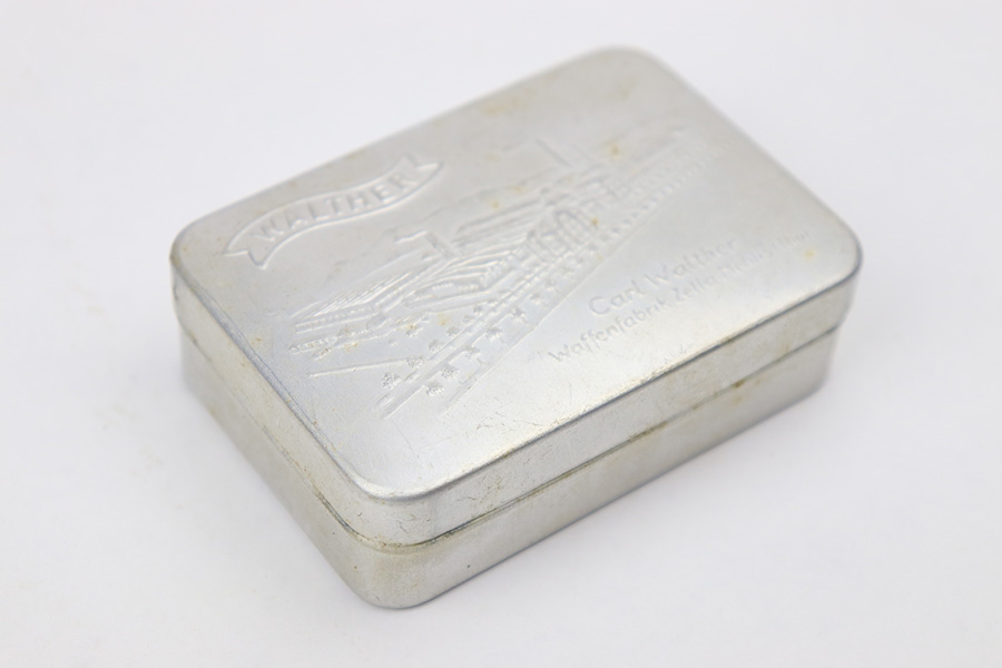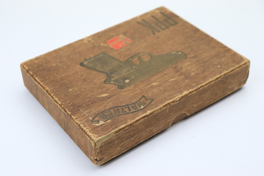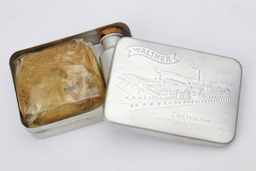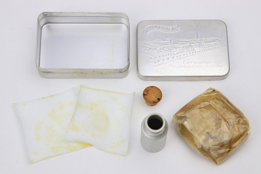 7/13/22 – This is an original WW2 Walther PPK box, complete with internal accessories as shown. The box includes an original, period correct cleaning rod, early style (and complete with milk can oiler & rag) tin, and three presentation dummy rounds. The box has a nice pink colored interior and the original divider is still completely in tact. The exterior of the box has some typical edge wear but no major issues. A great WW2 commercial PPK accessory grouping!