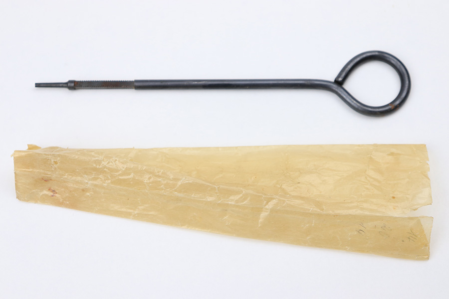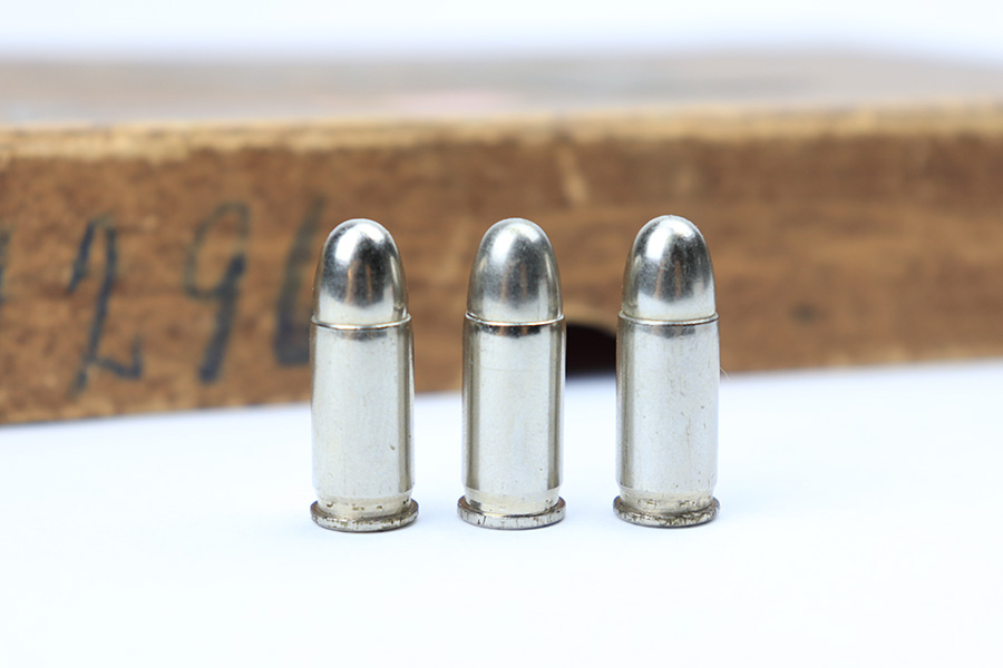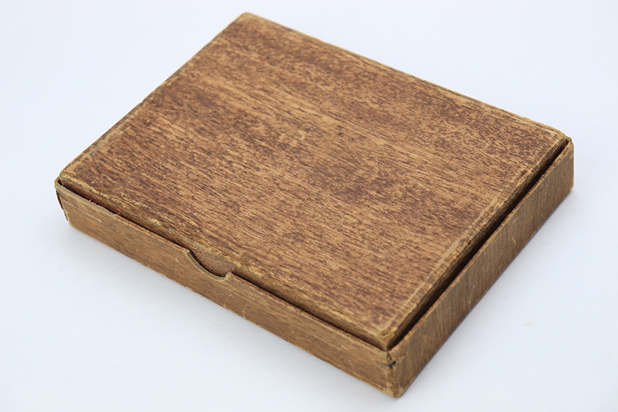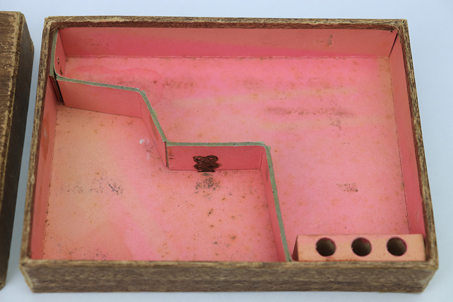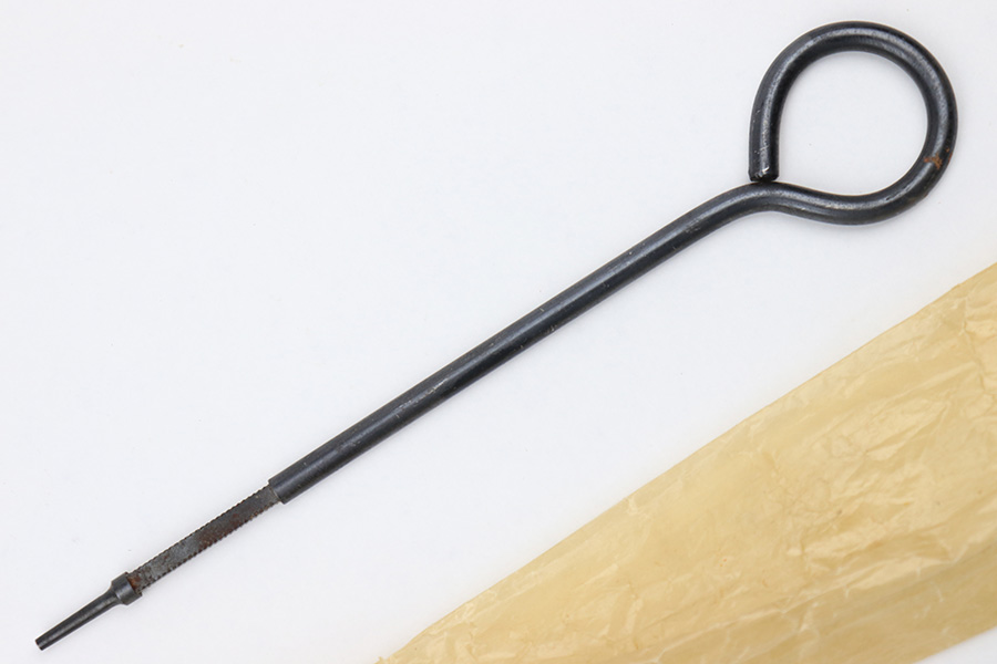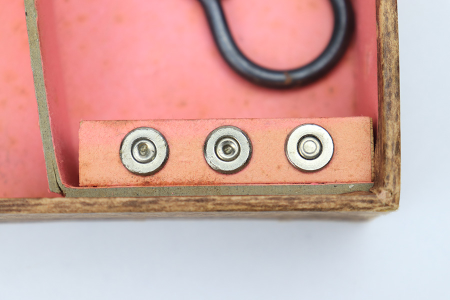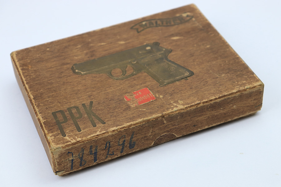 7/13/22 – This is an original WW2 Walther PPK box, complete with internal accessories as shown. The box includes an original, period correct cleaning rod, early style (and complete with milk can oiler & rag) tin, and three presentation dummy rounds. The box has a nice pink colored interior and the original divider is still completely in tact. The exterior of the box has some typical edge wear but no major issues. A great WW2 commercial PPK accessory grouping!