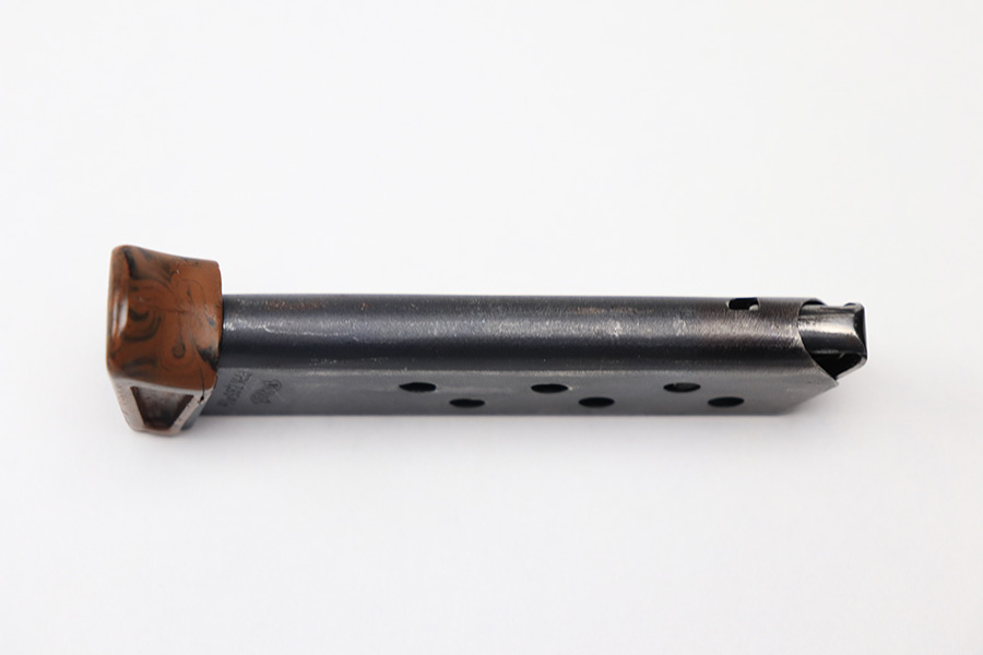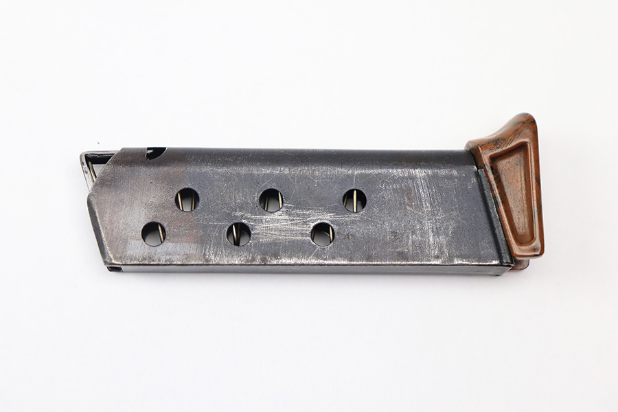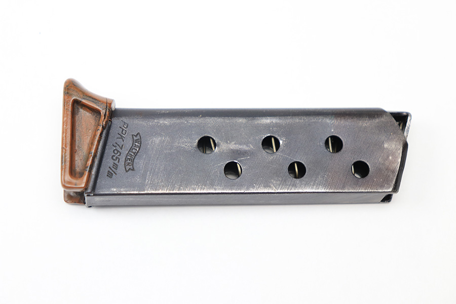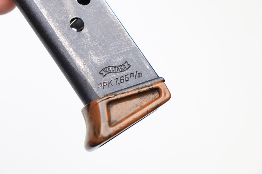 12/27/21 – This is a good example of a wartime Walther PPK brown finger extension magazine. The blued tube has retained a majority of its finish, only showing minor scratchy wear throughout. The left side of the tube features both a Walther banner and the caliber, indicating war time production. The brown finger extension bottom is in good condition, showing almost no wear and a minor crack on the left side, near where it meets the tube. The spring and follower are strong and functional.