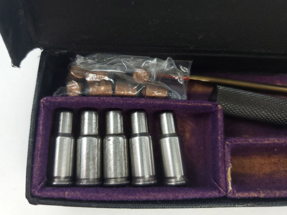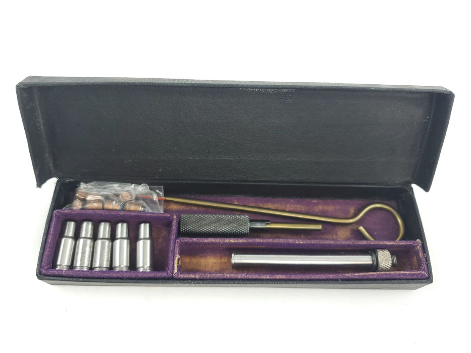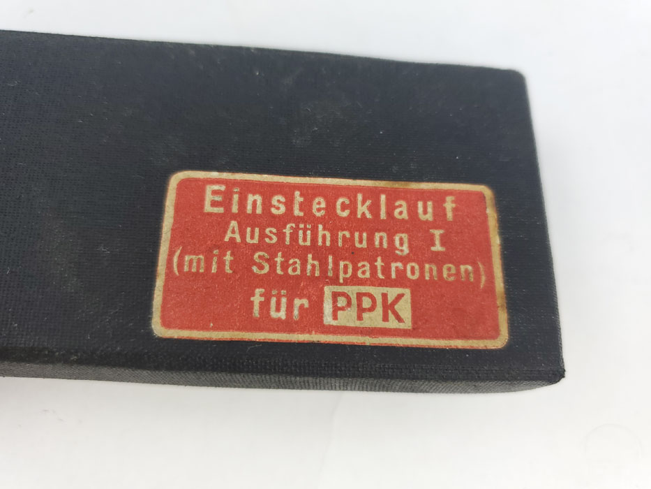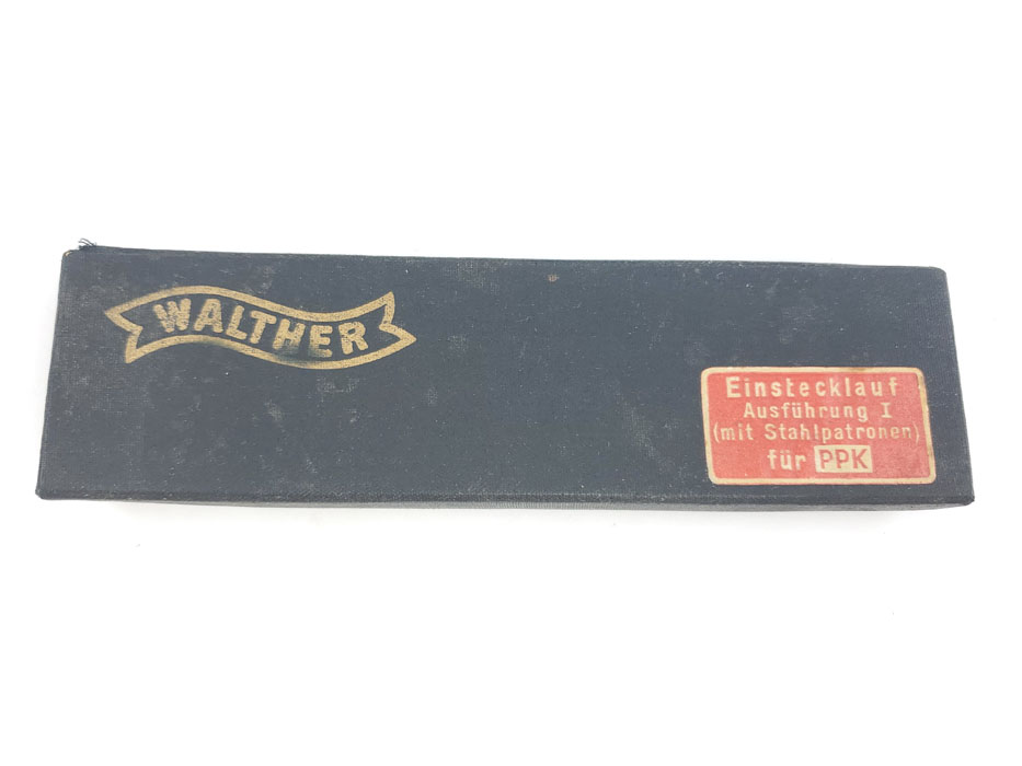 5/6/20 – This is a rare Walther PPK 4mm conversion kit. This kit allows for a PPK to fire 4mm rounds, which are included in the kit (see photos). These are slightly smaller than .22 caliber rounds and intended for indoor firing range use. We believe this is an early commercial item made in the 1930s. Kit comes complete and the original box is in excellent condition. Excellent condition throughout, and the bore is about 9/10 with only some very minor residue, but this would likely clean to mint condition.