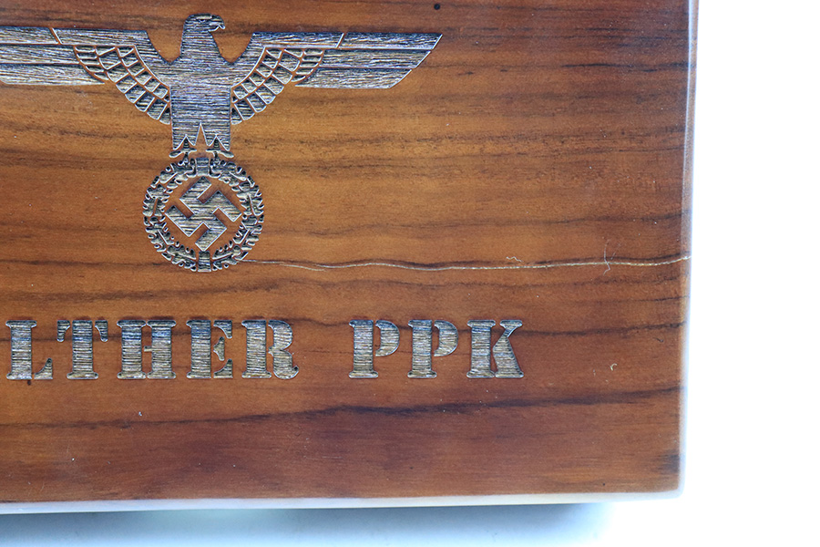 7/25/22 – This handmade wooden box is a great display or storage solution for Walther PPK’s. The top is laser etched, and interior is cushioned with red felt. The box fits a Walther PPK and has an additional slot to store an additional magazine or the single magazine separately. The Walther PPK shown is not included with the box and is shown only to demonstrate how an item fits within the box. The pictured magazine does not have a finger extension but a finger extension magazine will easily fit within the slot. Note: as shown in photographs, the front of the case has a thin crack on its front.