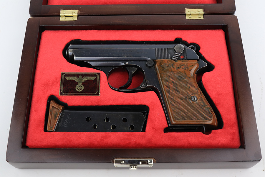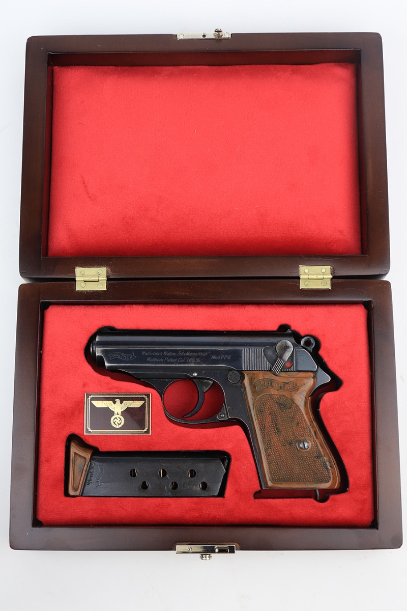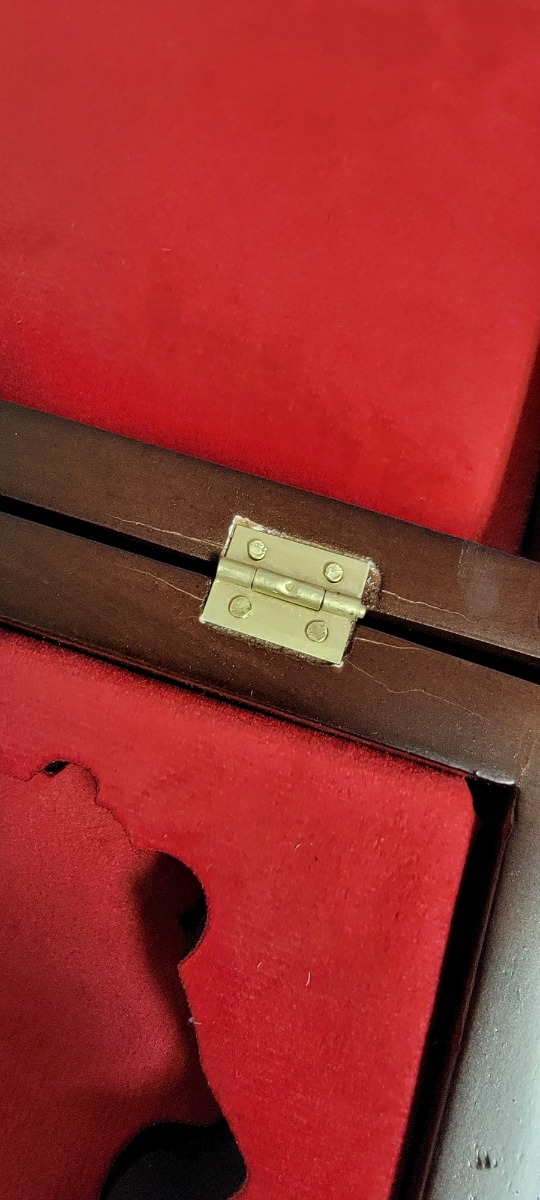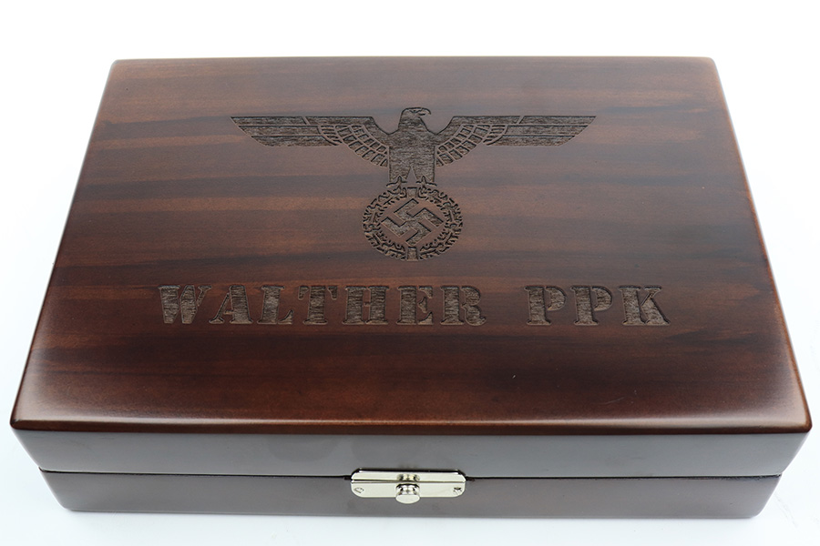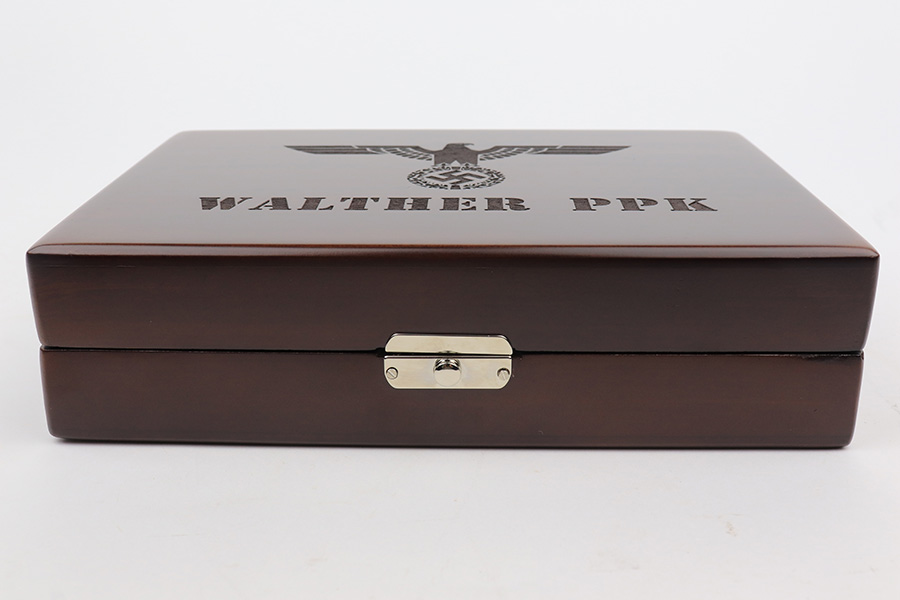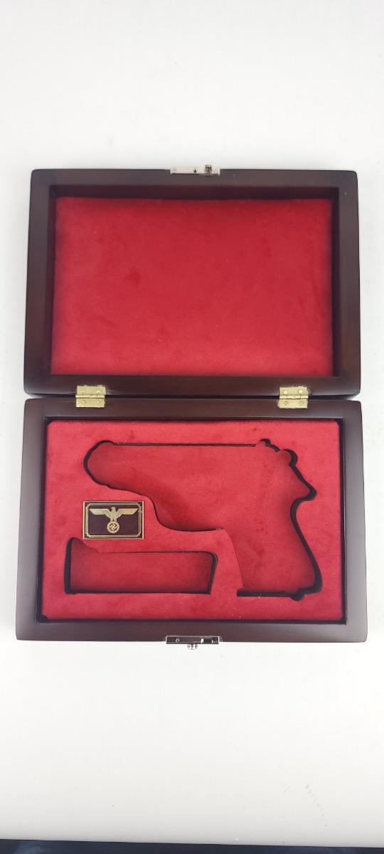 3/15/23 – This is a Walther PPK display case. Hand-crafted with foam-lined interior and wood resin exterior. The hinges have some mild hairline cracks near the hinge, but this doesn’t affect functionality. Price slightly reduced as a result. Makes for an excellent display for any collectible PPK pistol.