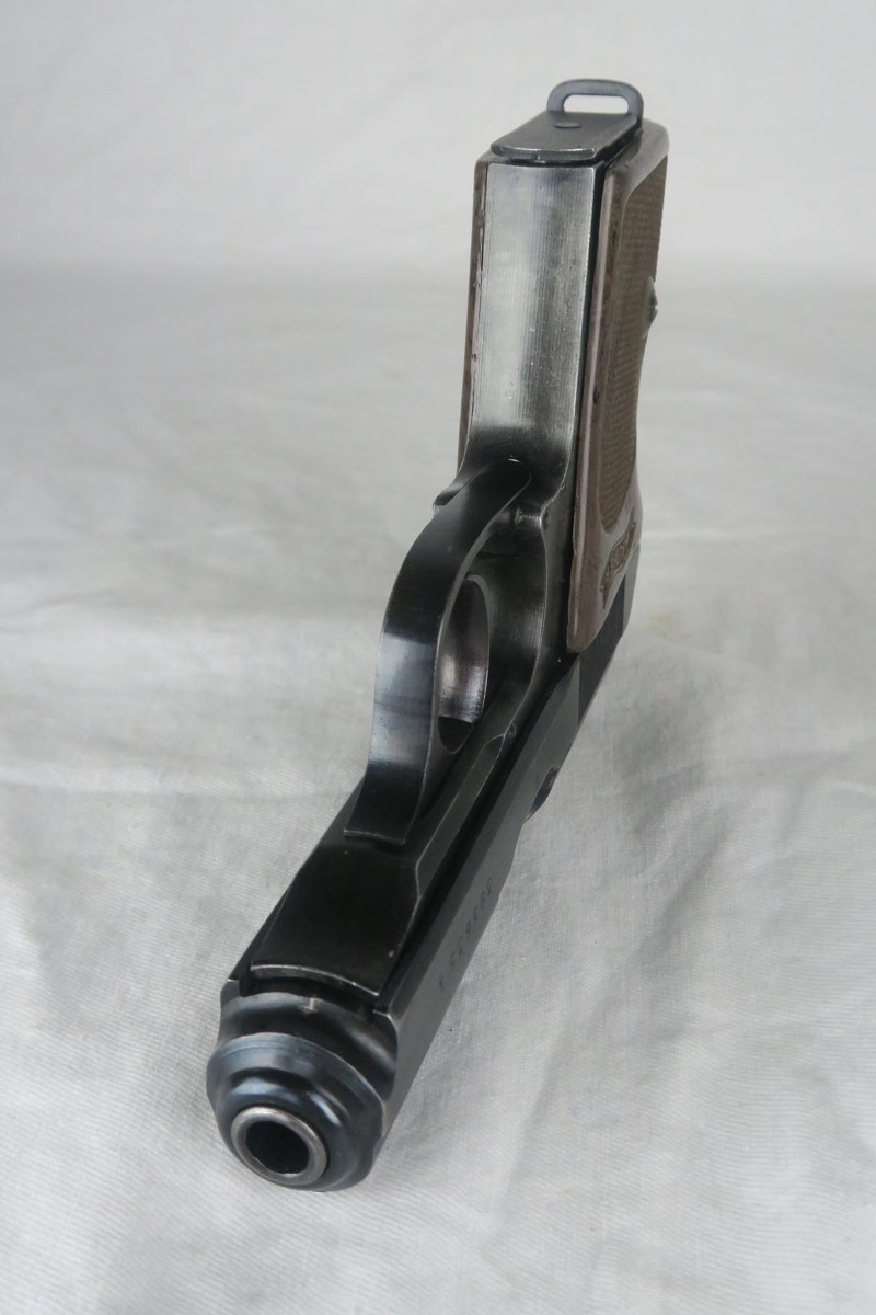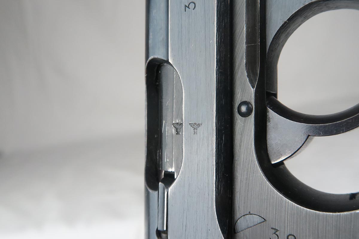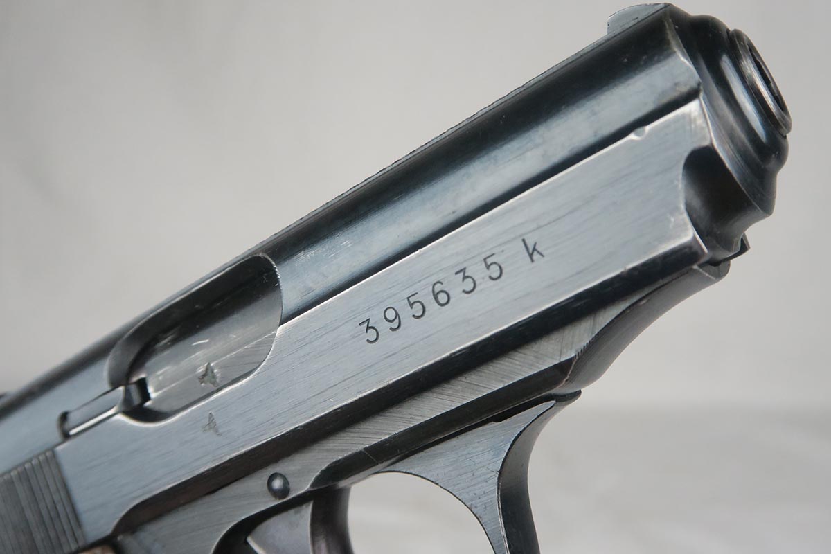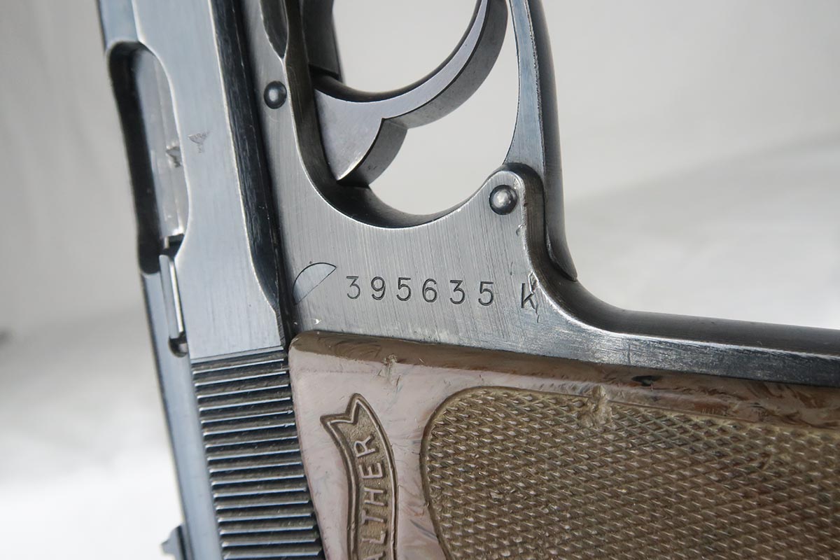 5/25/18 – This is a Nazi era Walther PPK with duraluminum frame, in all original condition with matching parts.  The military finish rates at about 92% with an excellent profile view but thinning throughout the front strap.  It has a nicely colored gray grip but there is the common spinal fracture and a small thumb-sized indent on the left side.  Excellent wartime magazine and bore.