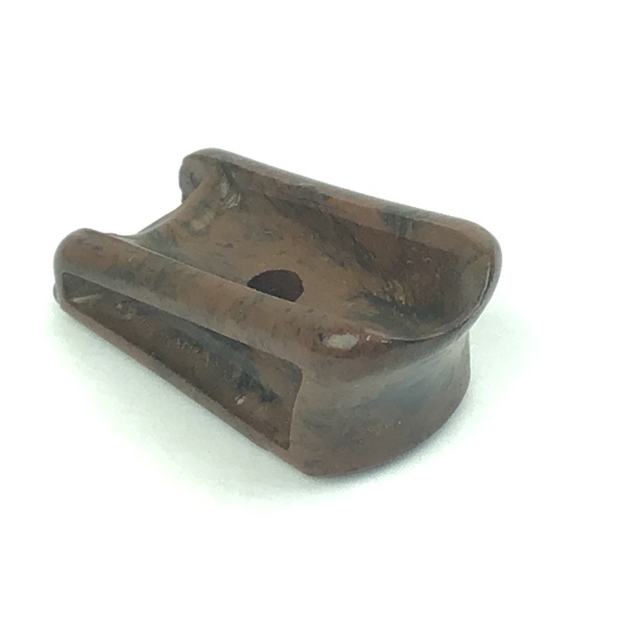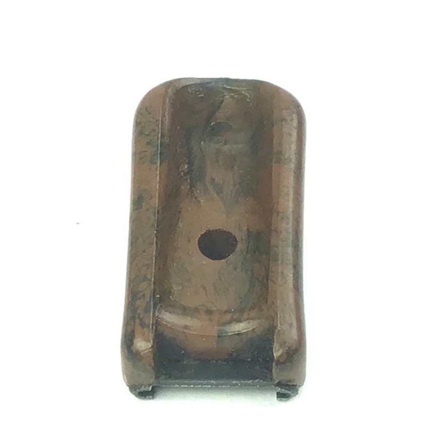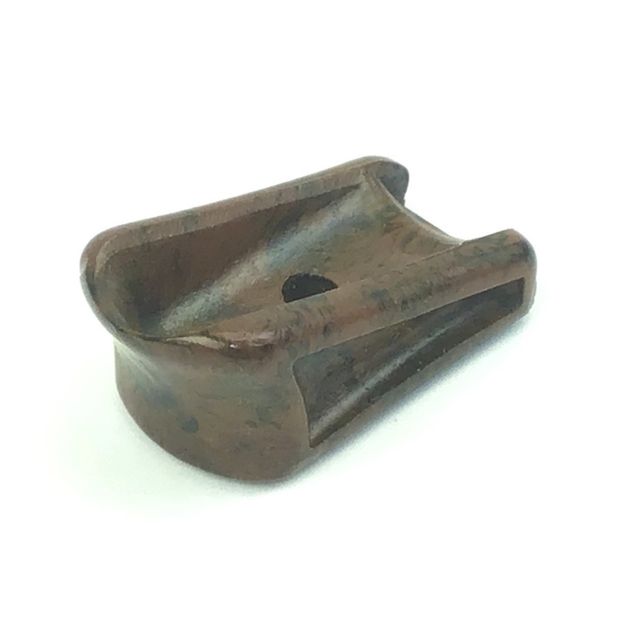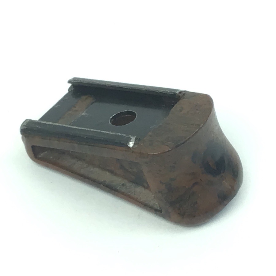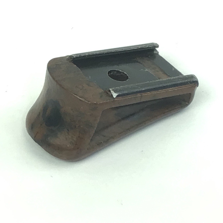 3/13/23 – Walther PPK Early WW2 Magazine finger extension. Manufactured from bakelite, this finger extension is in excellent condition and ready to install on any early / pre-war PPK or PP magazine. Early thin-lipped style edge. Swirly brown & black color with no chips or cracks. Metal base is completely secure and straight.