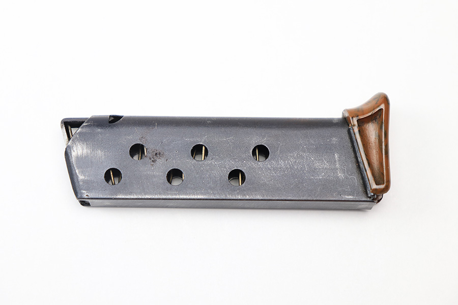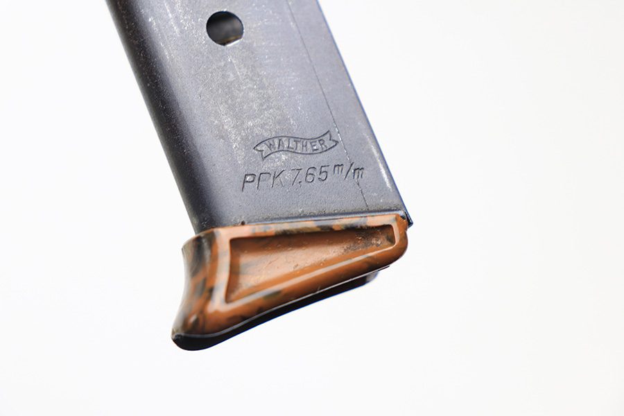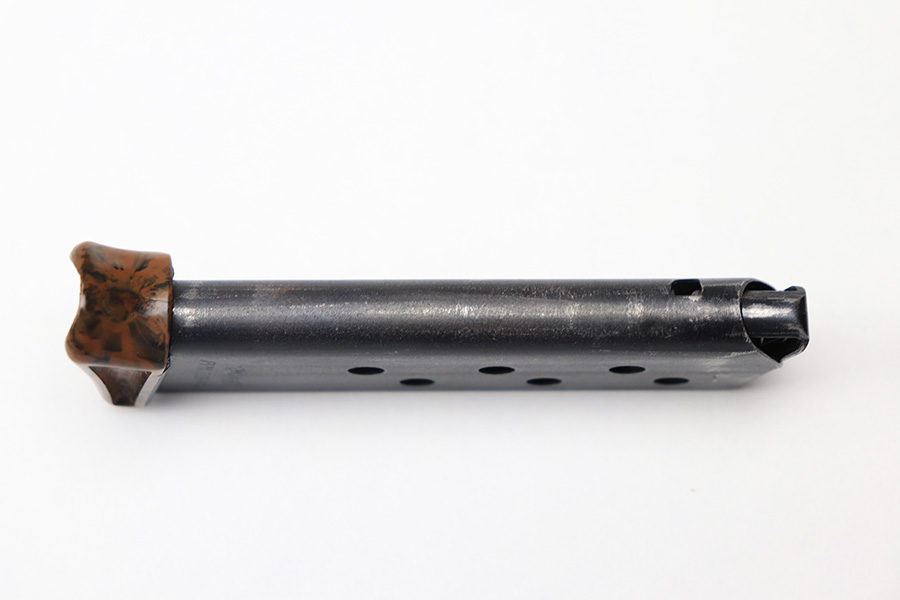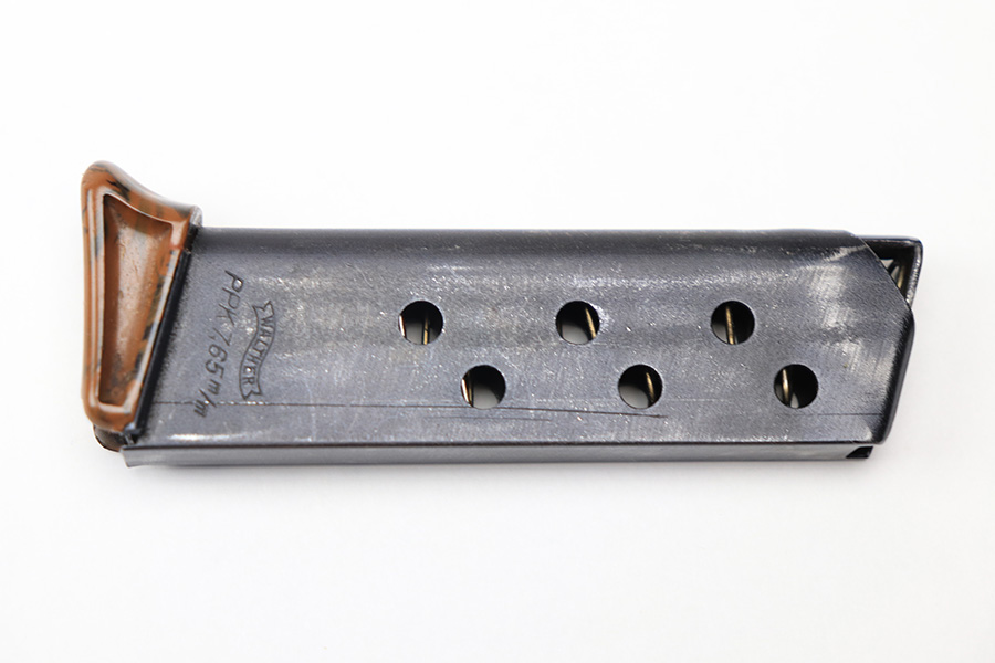 12/27/21 – This is a great example of a Walther PPK brown war-time finger extension magazine. The blued tube has retain a majority of its finish, showing only minor signs of wear throughout. The left side of the tube features both the caliber and a Walther banner, indicating wartime production. The brown finger extension bottom is a thin lip example and is in excellent condition, showing virtually no wear. The spring and follower are functional and strong.