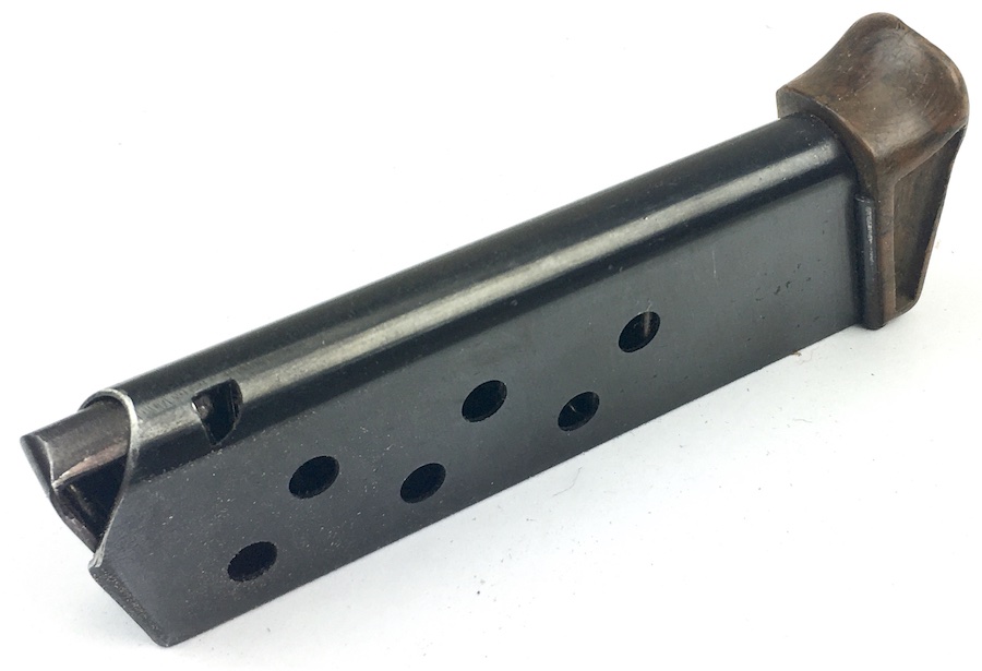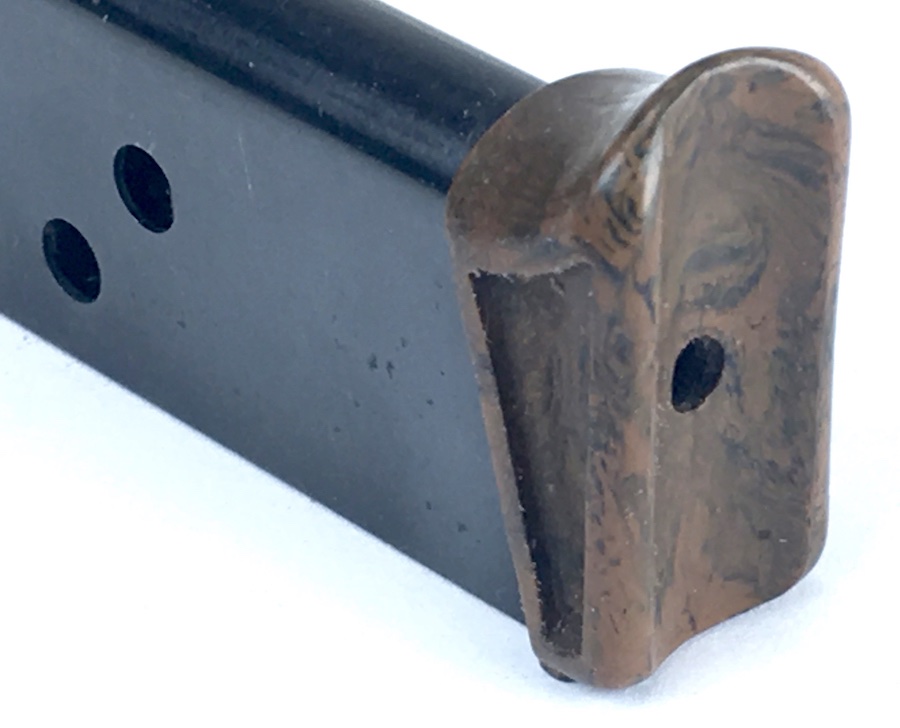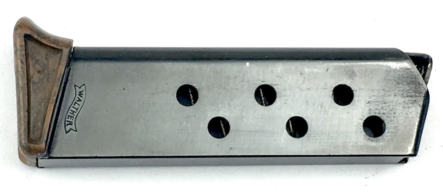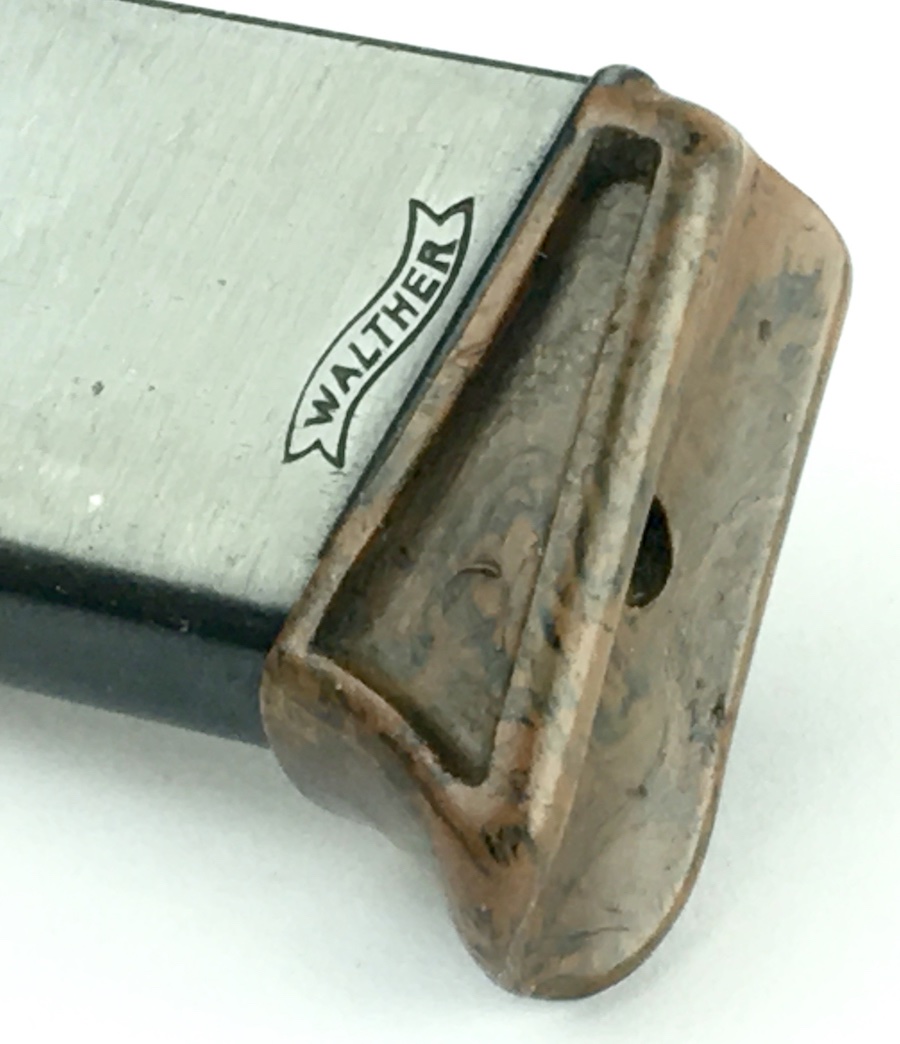 10/28/19 – Walther PPK, early / pre-war finger extension magazine. Banner only “Walther” logo on the left side of the tube. High polish bluing is 98%. No dents, cracks or corrosion. The FE is in excellent condition. Beautiful mottled brown color with no chips or cracks. Strong, smooth spring.