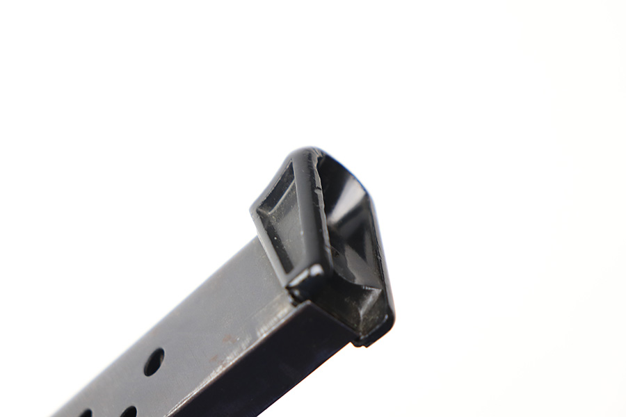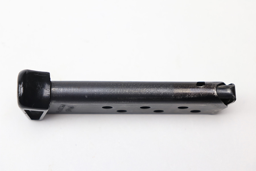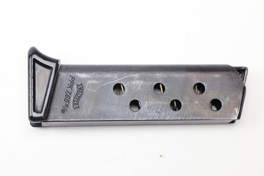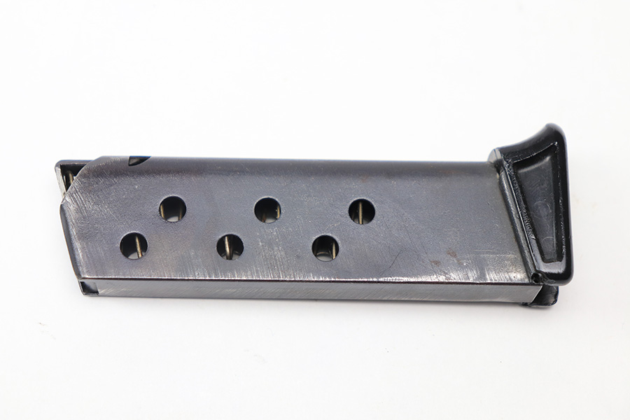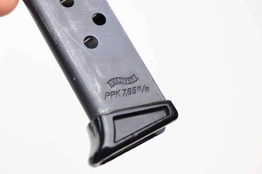 12/27/21 – This is a nice example of a Walther PPK magazine with a black finger extension bottom. The blued tube has retained most of its original finish but does show some signs of light scratchy wear throughout. The left side of the tube features both a Walther banner and the caliber, pointing to wartime production. The bottom is in great condition with only a few minor scratches or dings and no visible cracks or major flaws. The spring and follower are strong and functional.