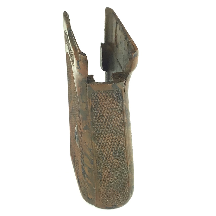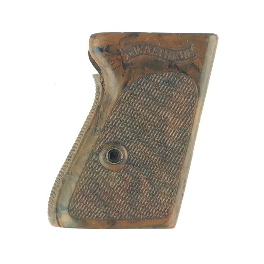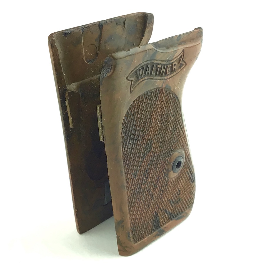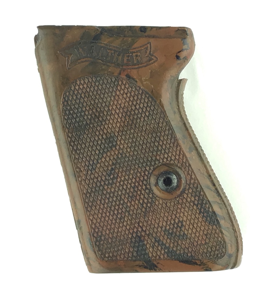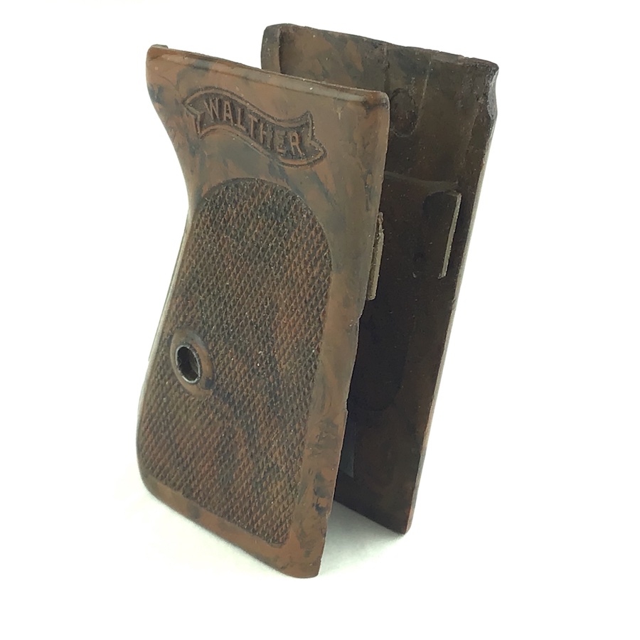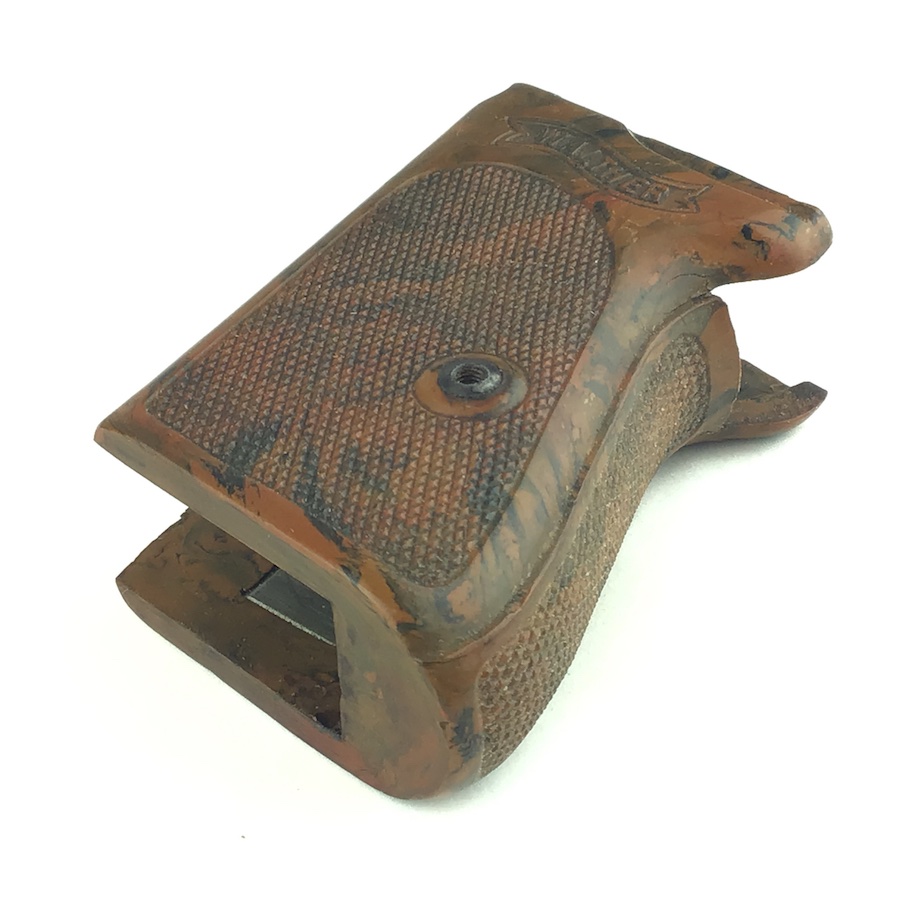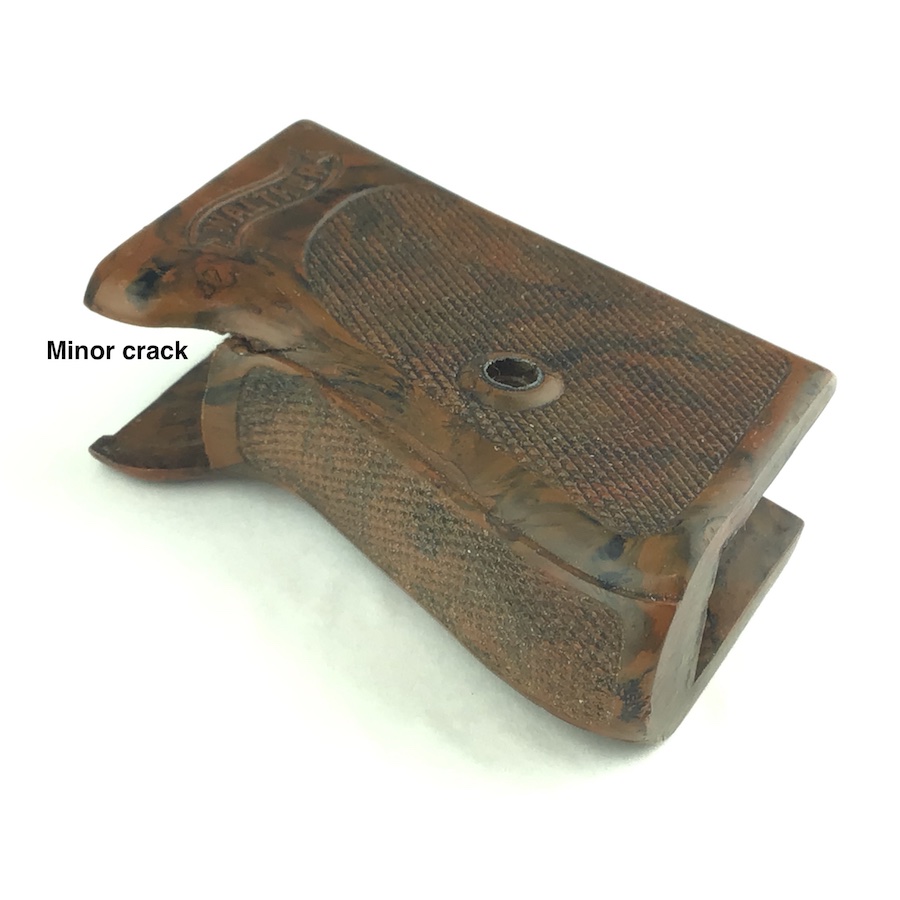 4/6/21 – This is an original WW2 era Walther PPK grip. The grip is the early WW2 variation with brown bakelite that has nice black marbling. The grip is in great condition with only a small surface crack at the top of the right side.  This is a very minor flaw. Minimal warping with nice coloring.