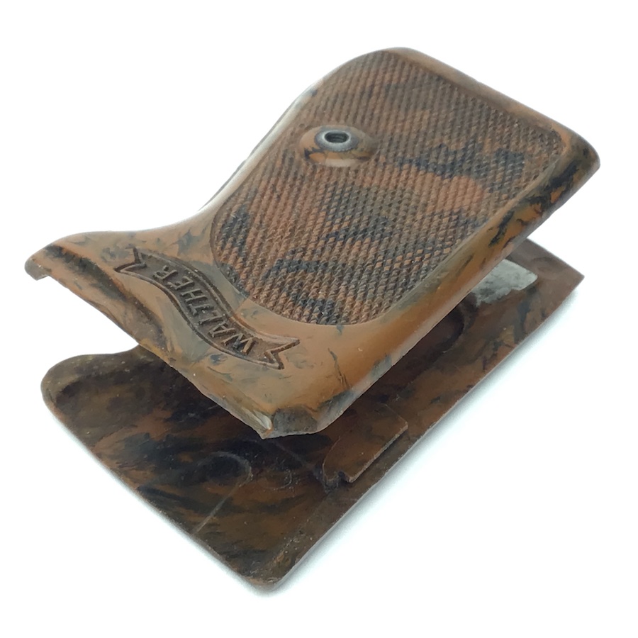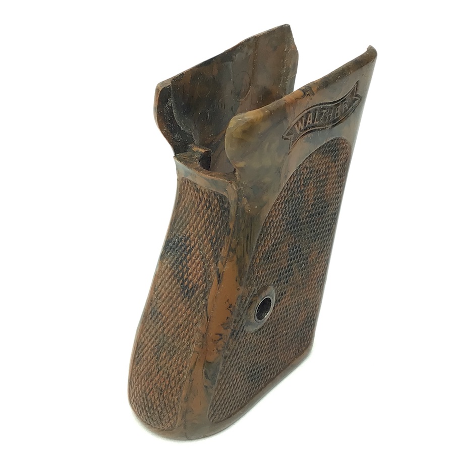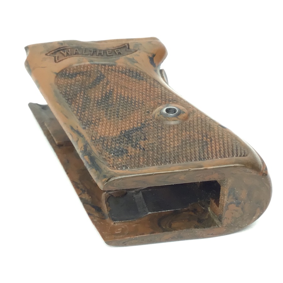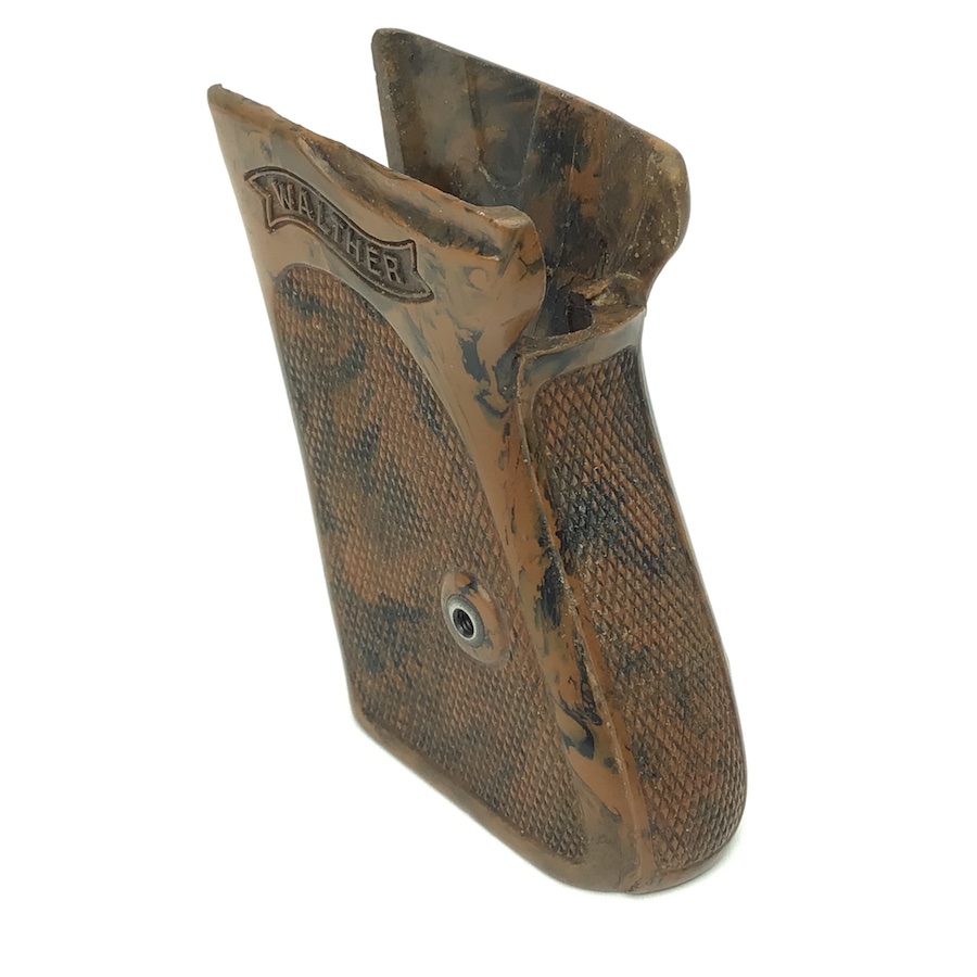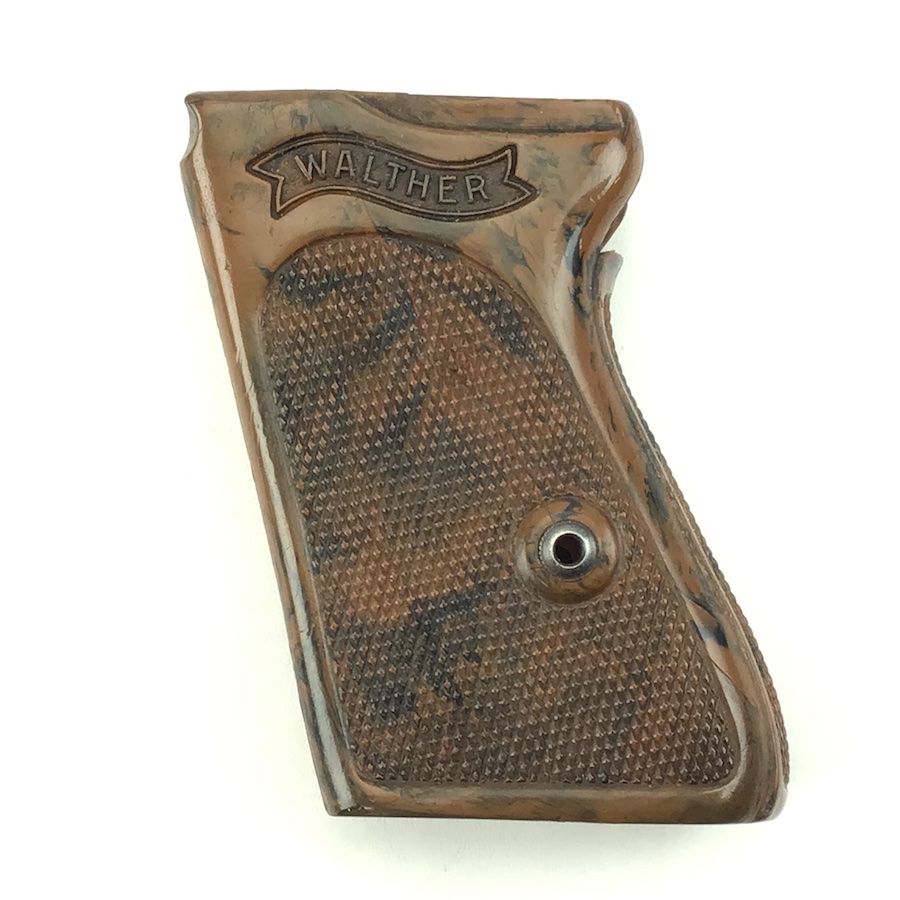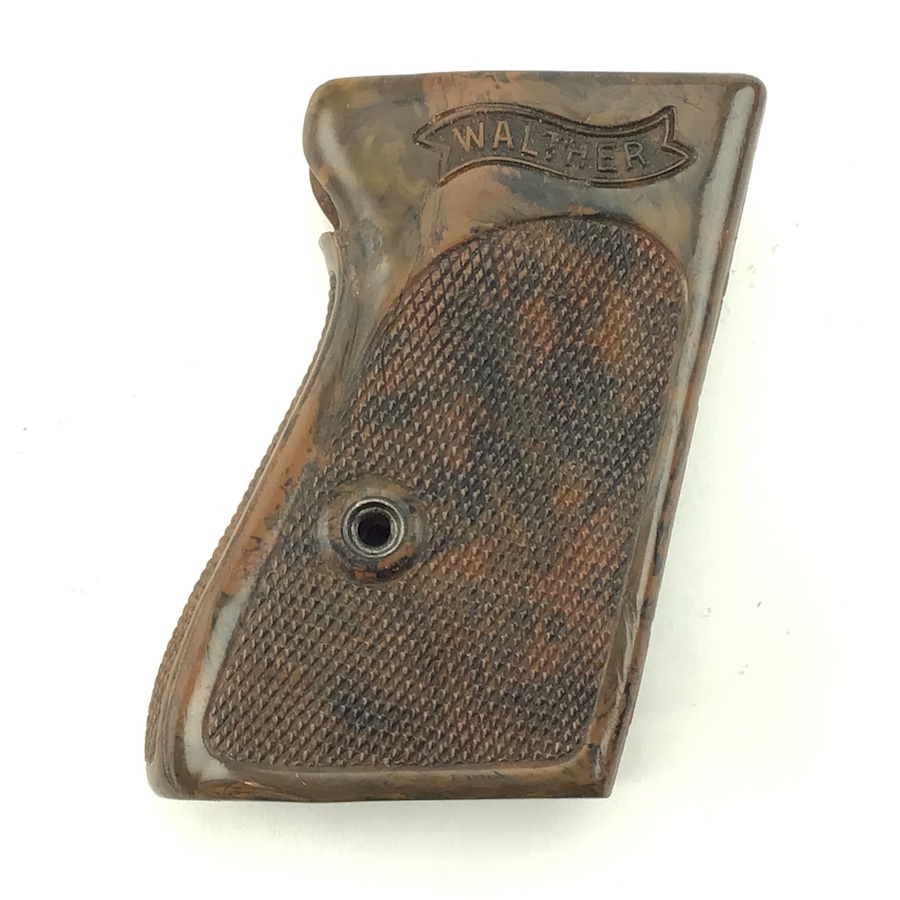 6/17/21 – Original and excellent condition. WW2 era Walther PPK, one piece grip. The grip is the early WW2 variation with brown bakelite that has a black color swirl. The grip is in excellent condition with no cracking. Minimal warping with nice coloring. Very hard to find in this condition.