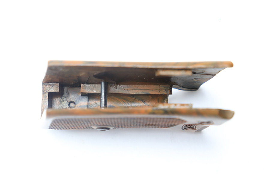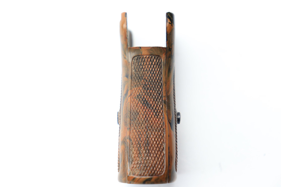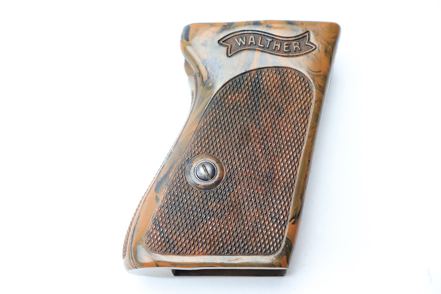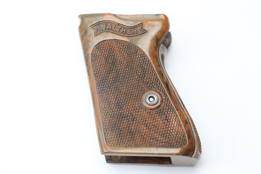3/30/22 – This is an excellent example of a brown Walther PPK grip. This grip is an early WW2 variation with no cracking. There is only faint scratchy wear near some edges of the grip. There is also only minor warping of the bakelite and nice coloring throughout. Grip screw included. A very hard to find, and harder to upgrade PPK grip!