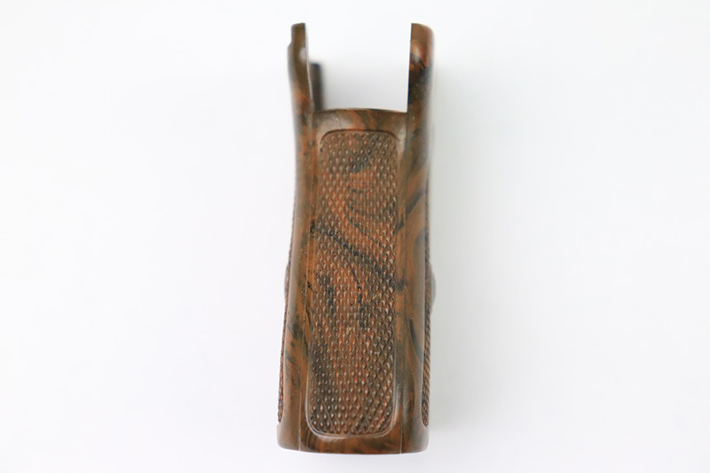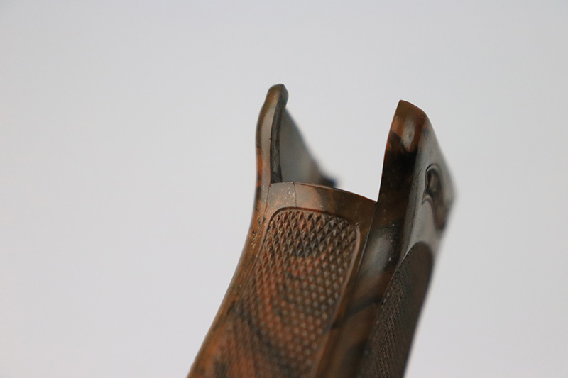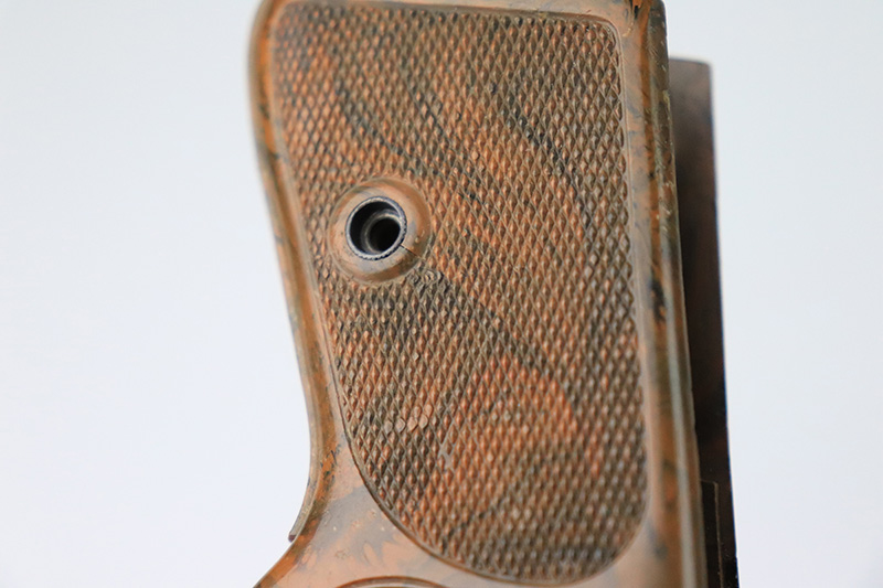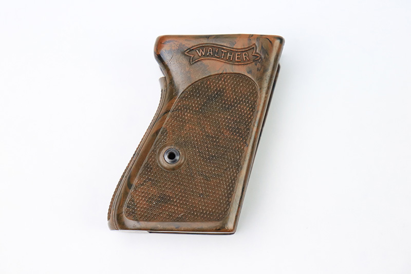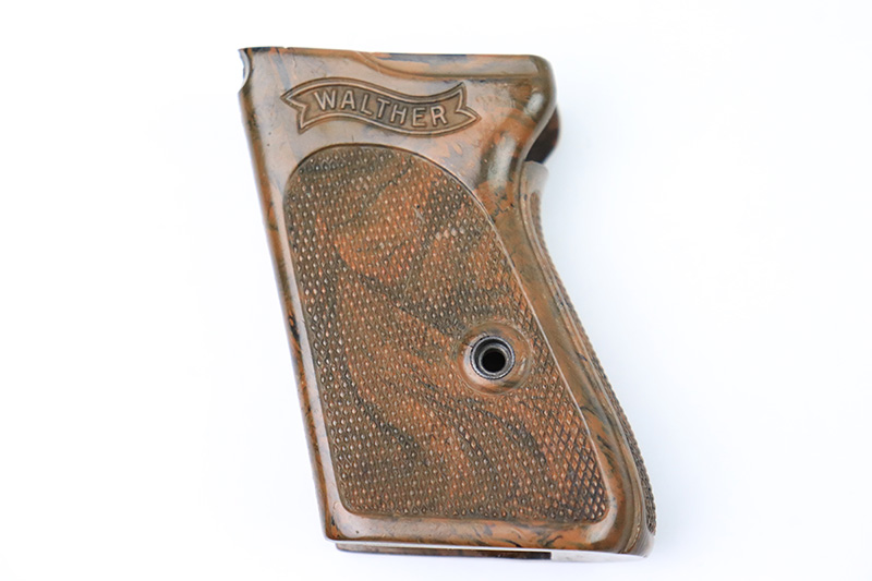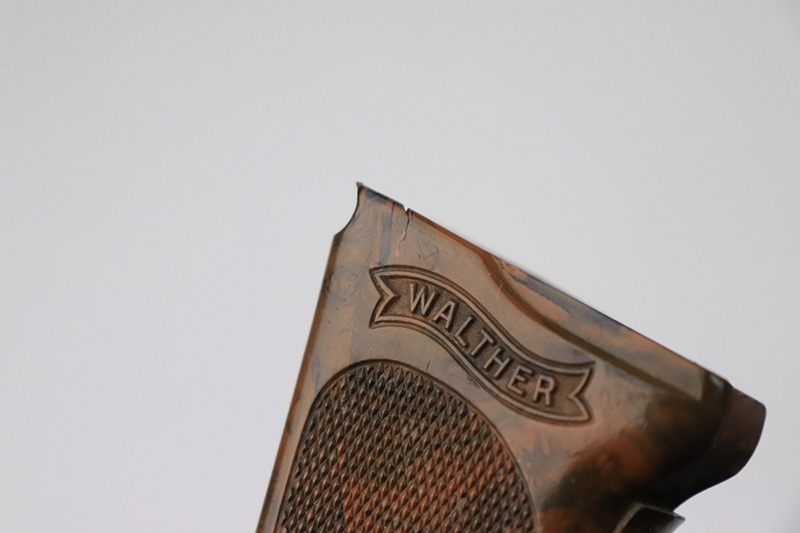 9/28/22 – This is an excellent example of a brown Walther PPK grip. This grip is an early WW2 example, featuring the grip screw travelling from the left-hand side to the right-hand side when viewed from the rear. There is minimal wear throughout with three small cracks in the grip as shown in the photos. One is on the left face of the grip, above the Walther logo. The second is on the left side of the grip near the grip screw hole. The third is toward the top of the rear of the grip. There is minimal flare at the top of the grip and it is in overall in excellent condition. A great upgrade for a PPK with a badly cracked or warped grip!