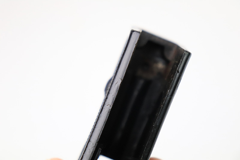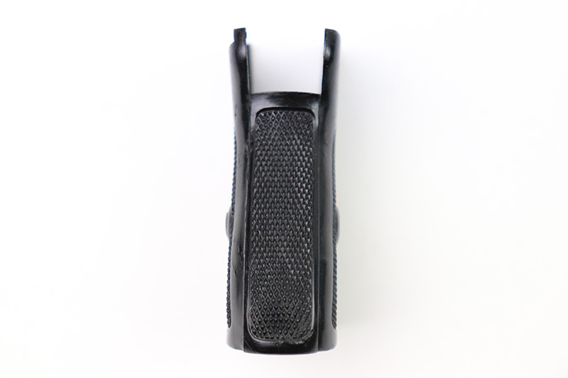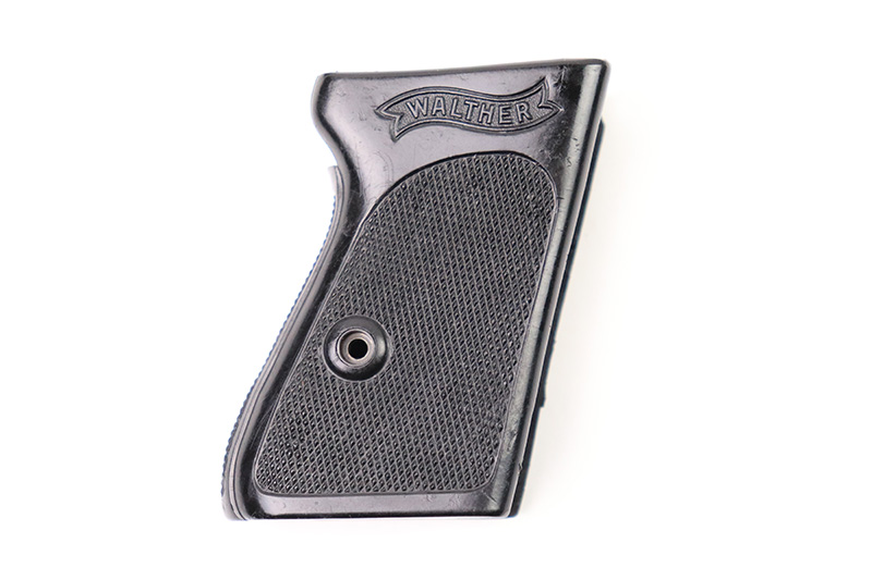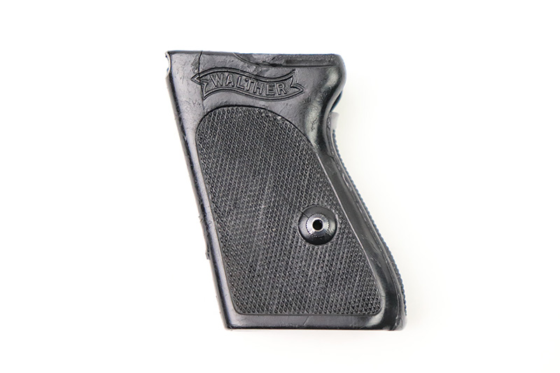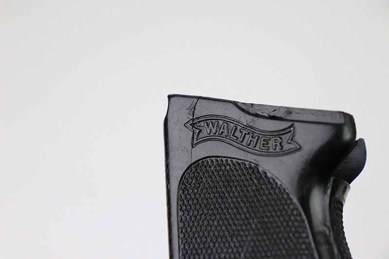 9/28/22 – This is an great example of a black Walther PPK grip from WW2. The grip is a later wartime example featuring a grip screw that goes from the right-hand side to the left-hand side when viewed from the rear. There is minimal flaring at the top of the grip. The grip has two cracks as shown in the photos. One crack is on the left-hand side of the grip along the front of the Walther logo. The second crack is also on the left-hand side near the grip screw nut.