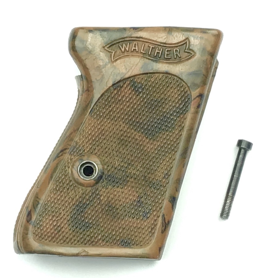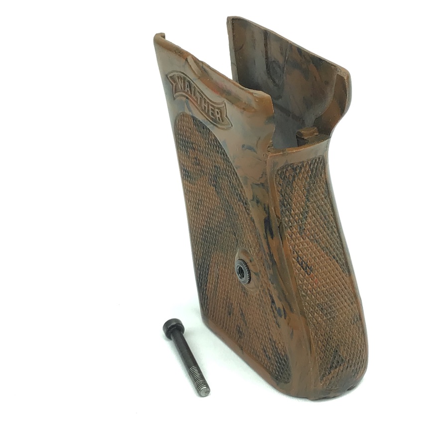 11/25/20 – This is an original WW2 era Walther PPK grip & screw. The grip is the early WW2 variation with brown bakelite that has a black color swirl. The grip is in great condition with no cracking. Comes with one original screw in excellent condition. Minimal warping with nice coloring. Very hard to find in this condition.