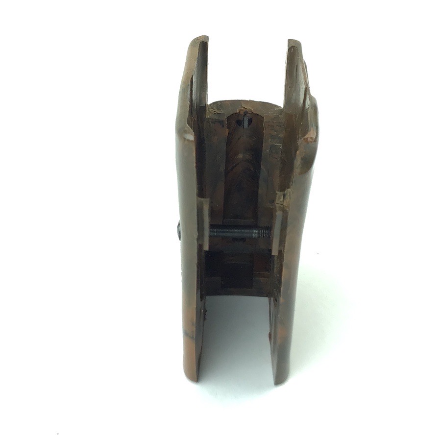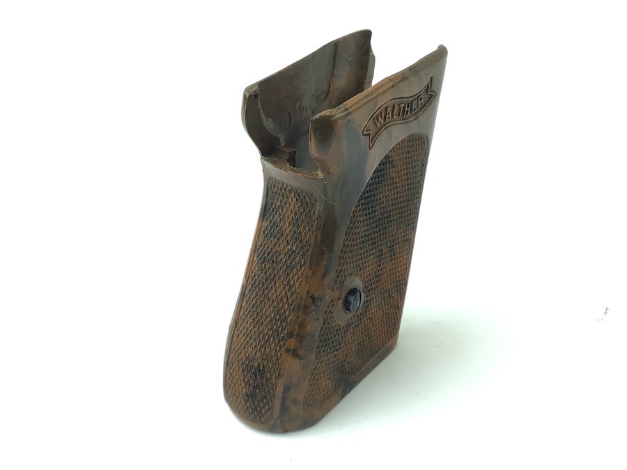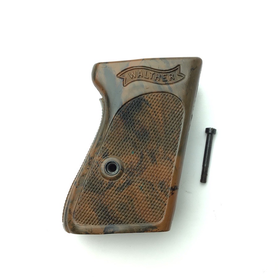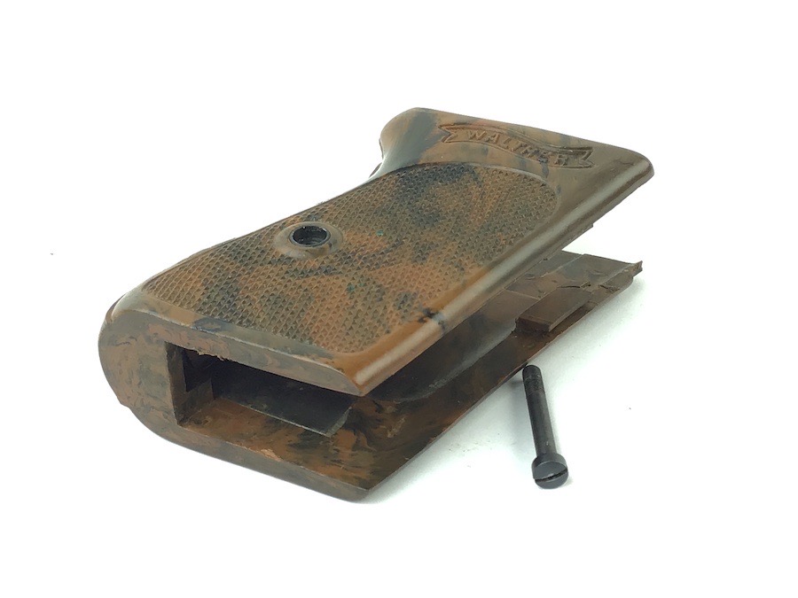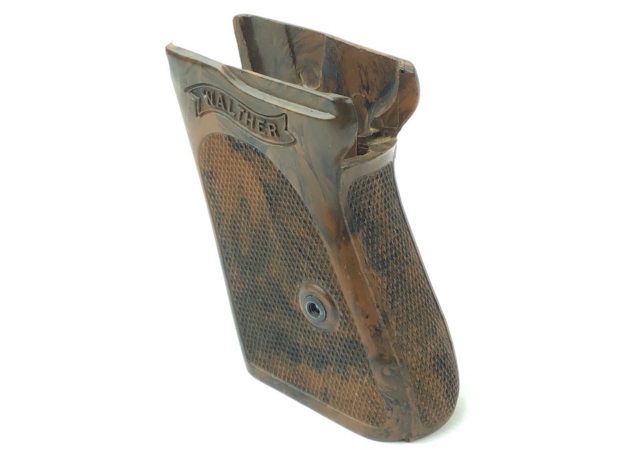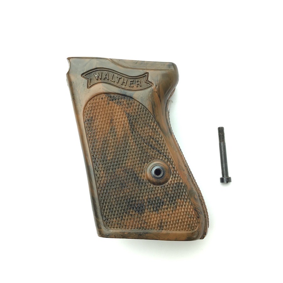 1/16/24 – Located at our Ohio office. This is an original WW2 era Walther PPK grip & screw. The grip is the early WW2 variation with brown bakelite that has a black color swirl. The grip is in excellent condition with no cracking. Comes with one original screw in excellent condition. Very hard to find in this condition.