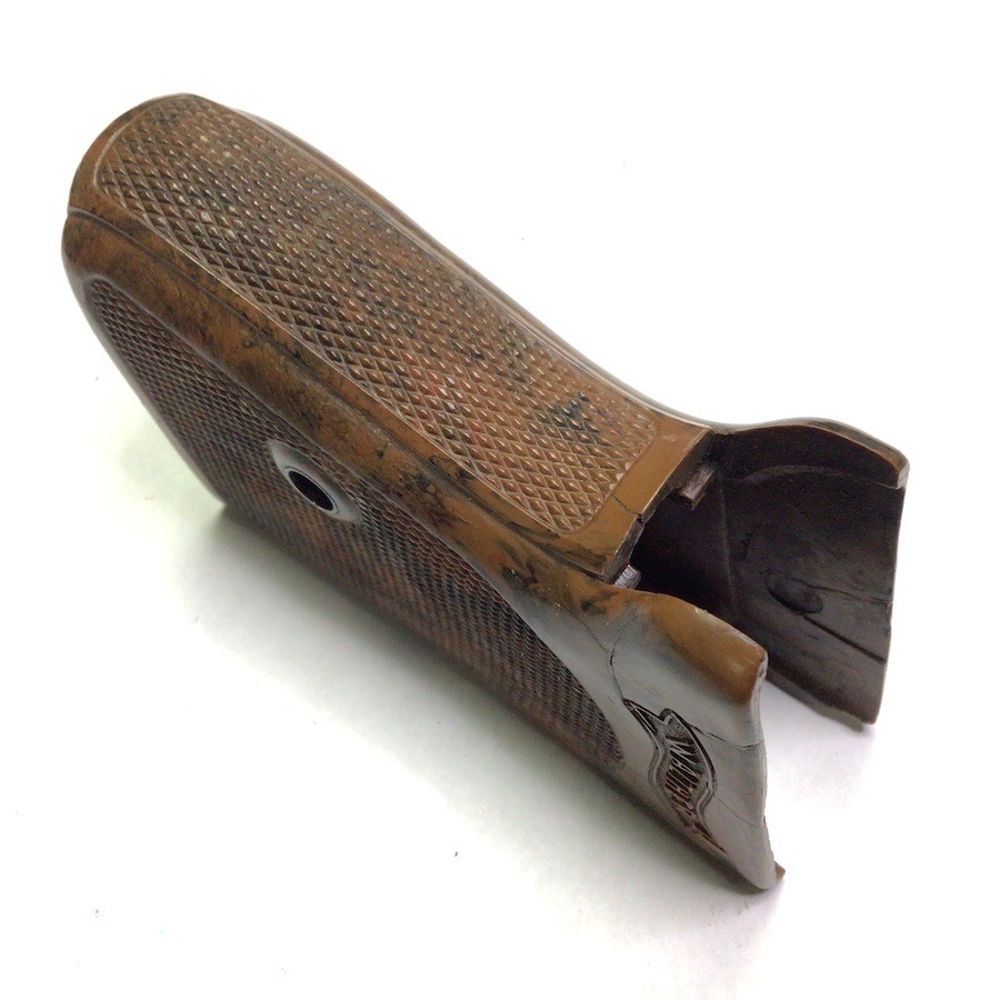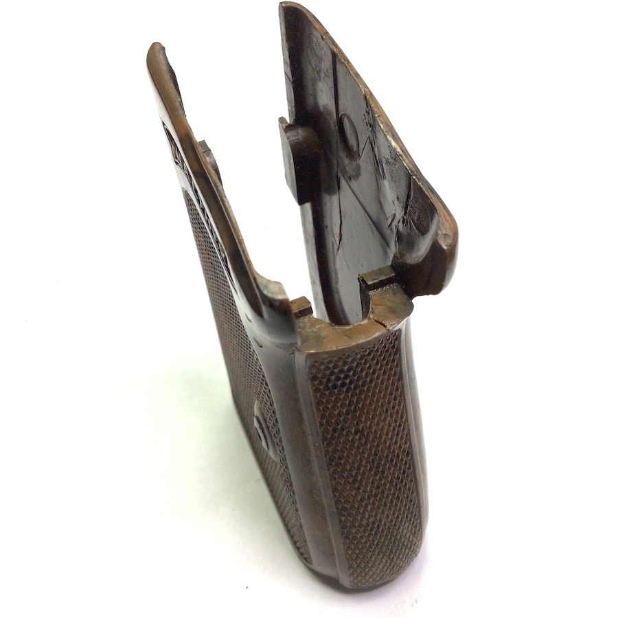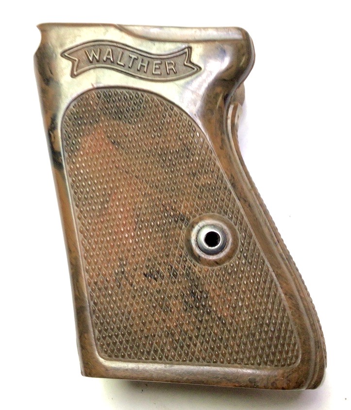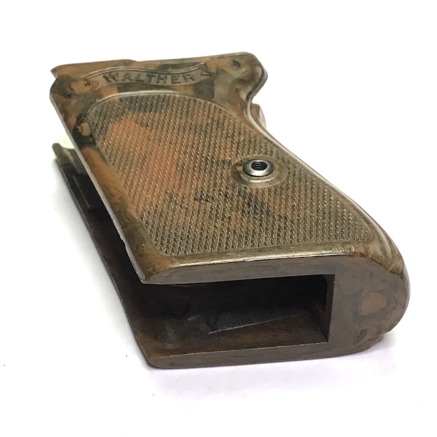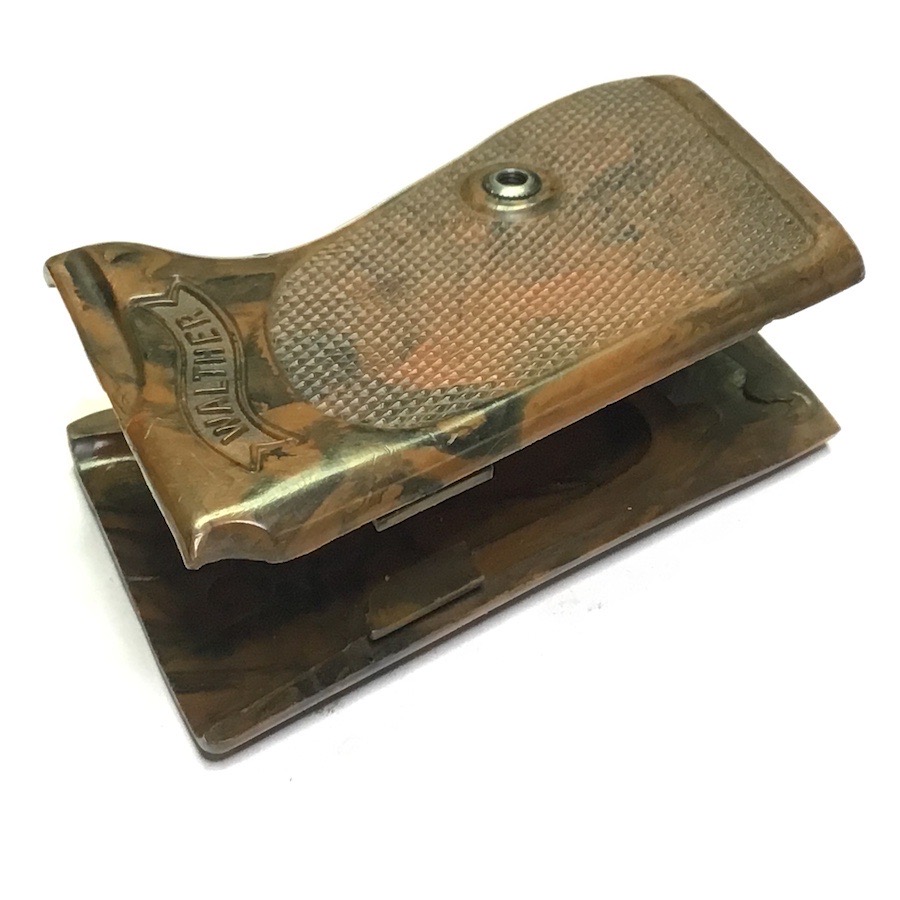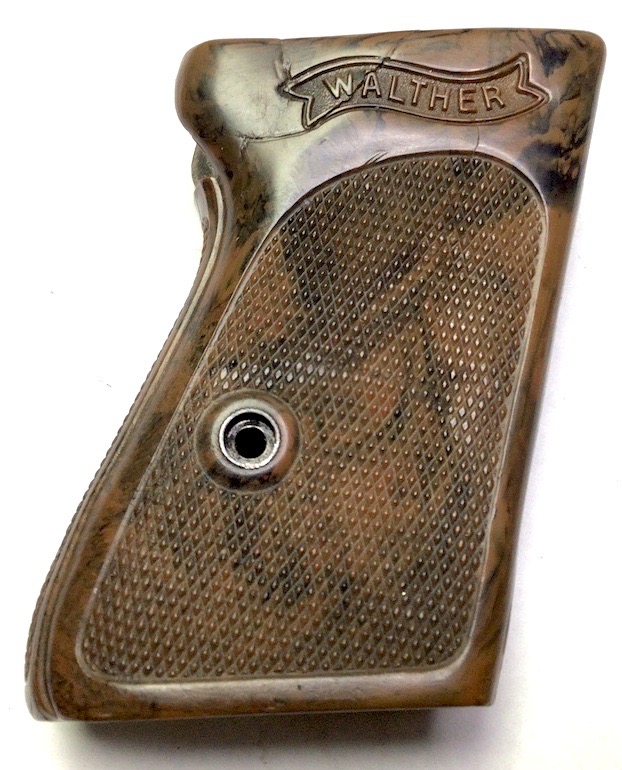 3/14/24 – This is an original WW2 era Walther PPK, one piece grip. The grip is the early WW2 variation with brown bakelite that has a black color swirl. The grip is in great condition. There is a minor surface crack on the right side, but it is a very solid repair done some time in the past. Minor spine crack at the top. Priced accordingly.