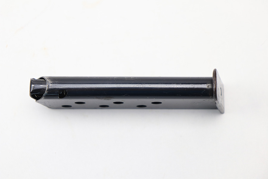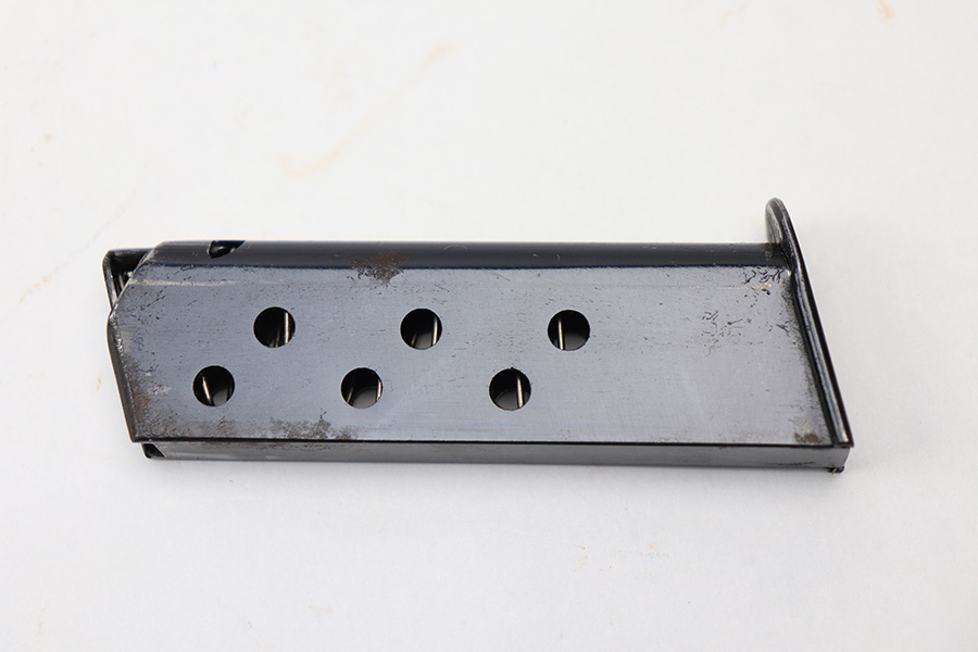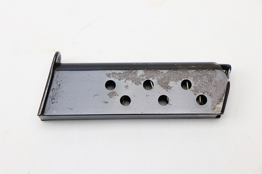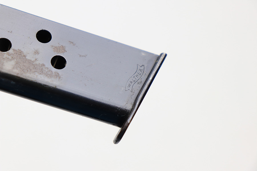 2/9/22 – This is an early variation Walther PPK magazine. The magazine has an early high polish finish and a Walther banner stamped on one side of the tube. The left side of the tube also shows some surface rust and patina, but the rest of the magazine is in great shape. The spring is strong and fully functional.