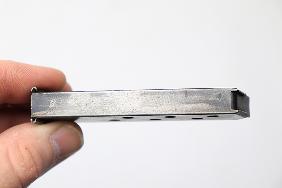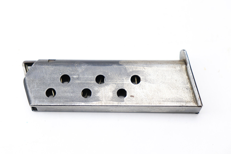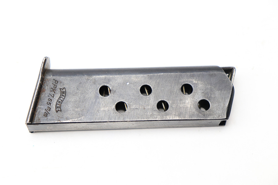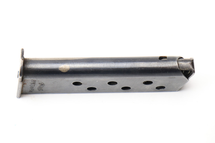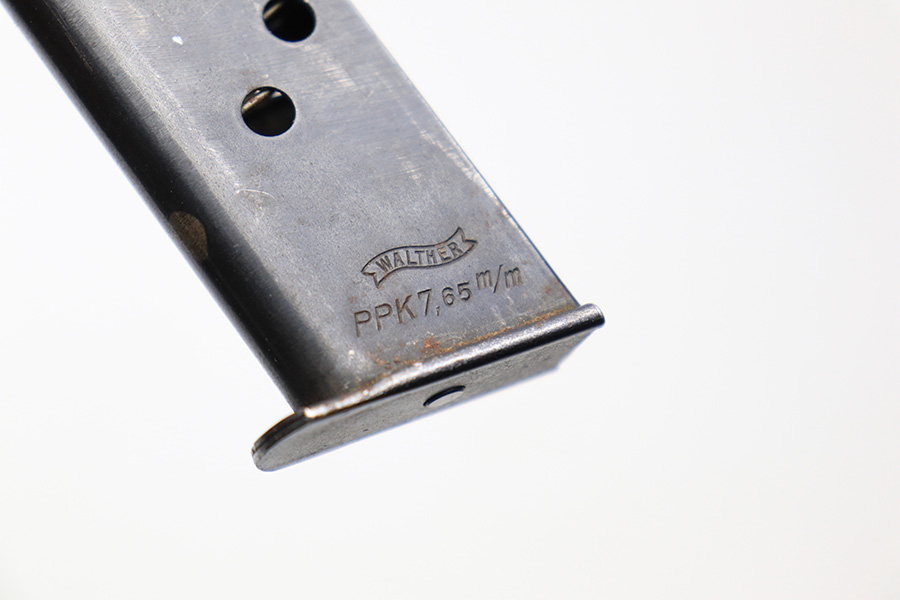4/22/22 – This is an original Walther PPK magazine from WW2. The magazine has some finish loss, especially on the right side of the magazine, as shown in photos. This is all surface wear and not rust or pitting, however. The spring is still fully functional.
