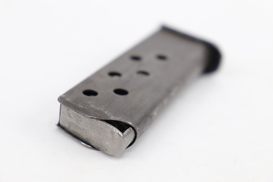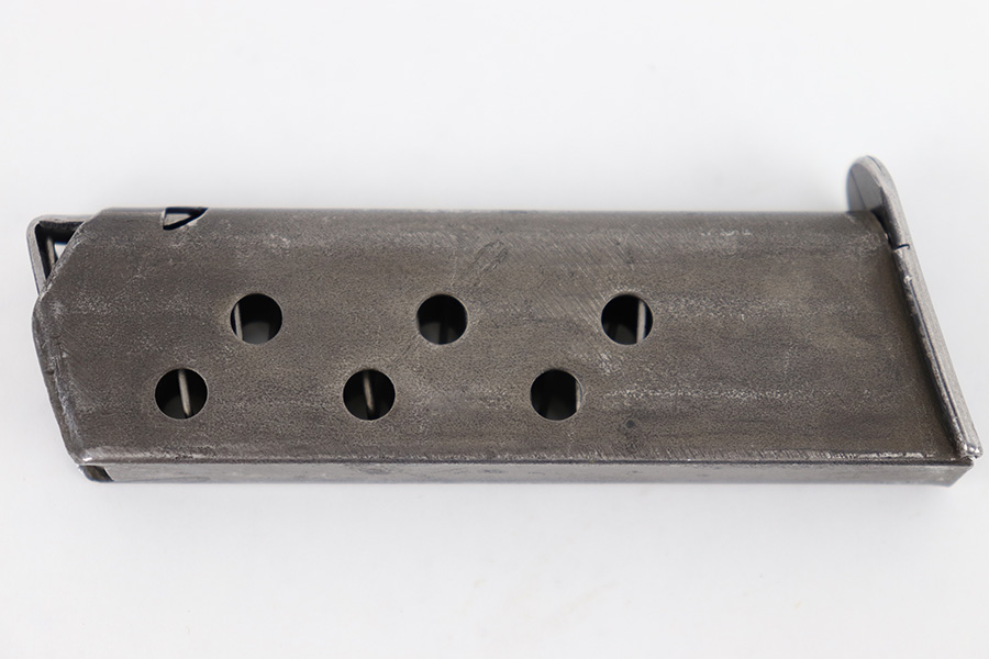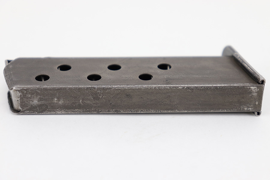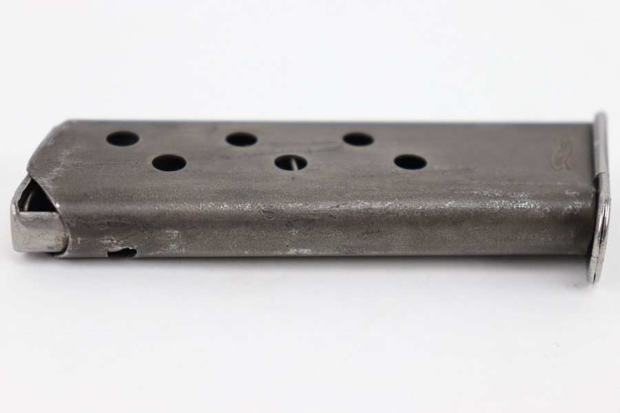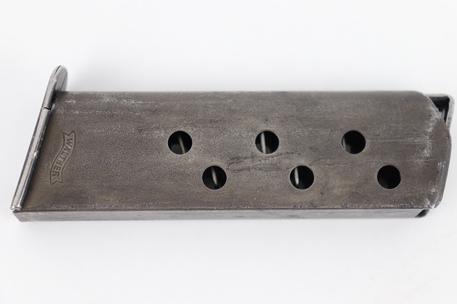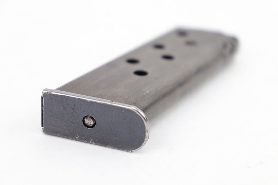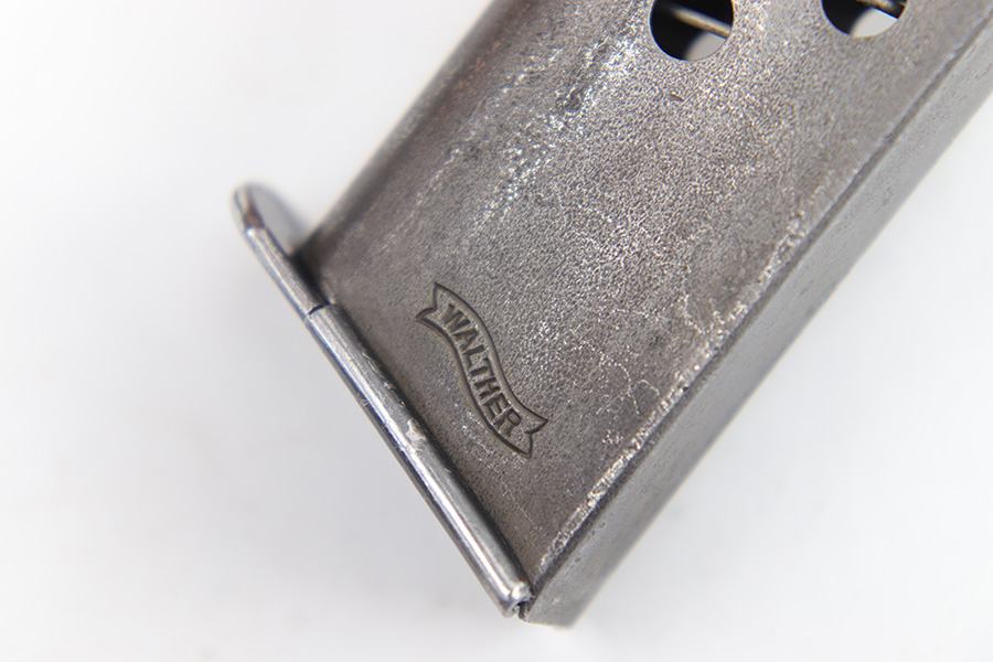 4/25/23 – This is an original WW2 early variation PPK magazine. The magazine is likely an old refinish, where most of the refinish has worn off, leaving the dark grey look we see today. The base has a high polish finish with some mild surface wear. The tube has some mild signs of aging but no rust or pitting. The spring is strong and functional.