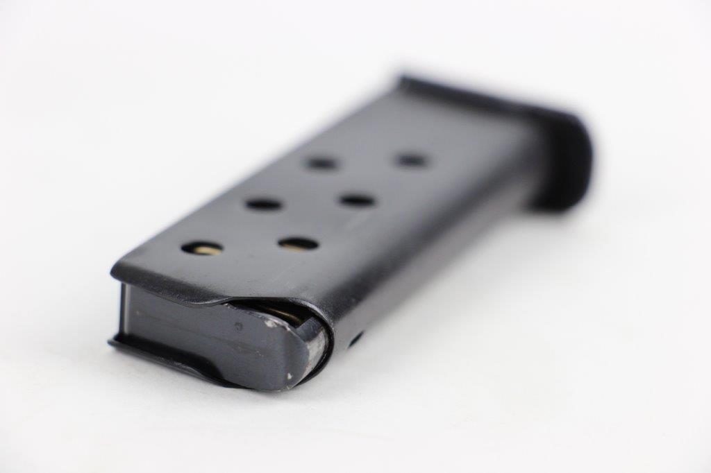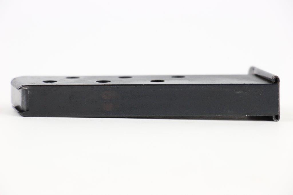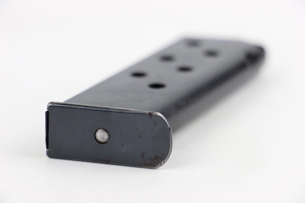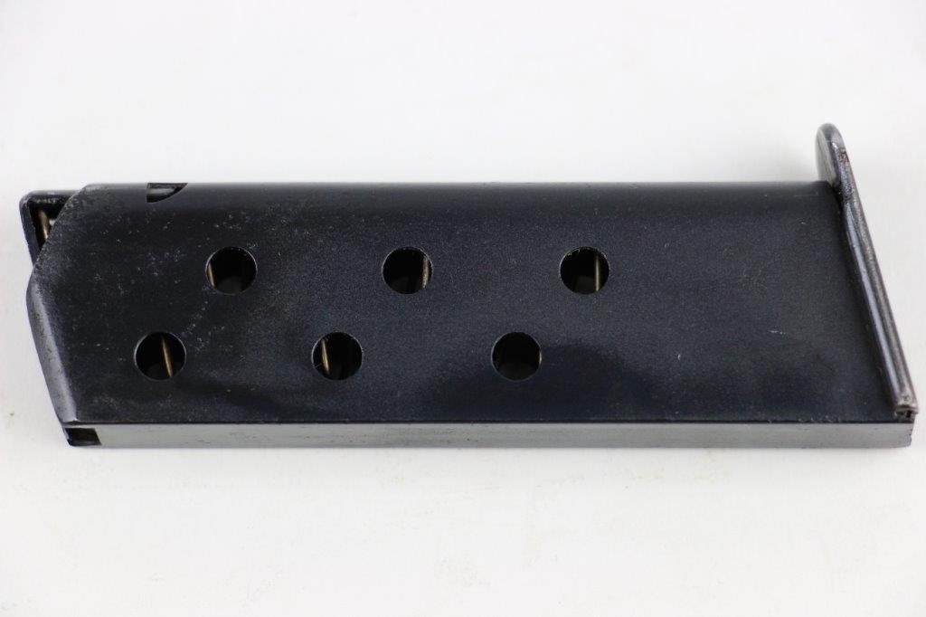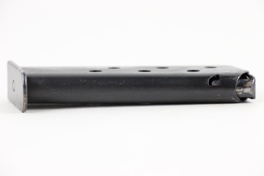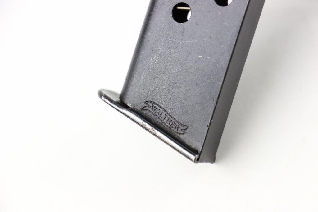 7/7/24 – This is an original WW2 production Walther PPK magazine. The magazine has a wartime dull blued finish and is Walther banner stamped on the left side of the tube base. The tube has some light surface scratches and dark spotty patina, mostly near the top of the tube near the feed ramp (hard to see in photos). The base is blued and in great shape. Strong, fully functional spring.