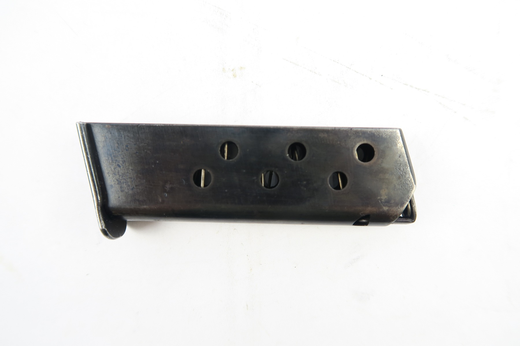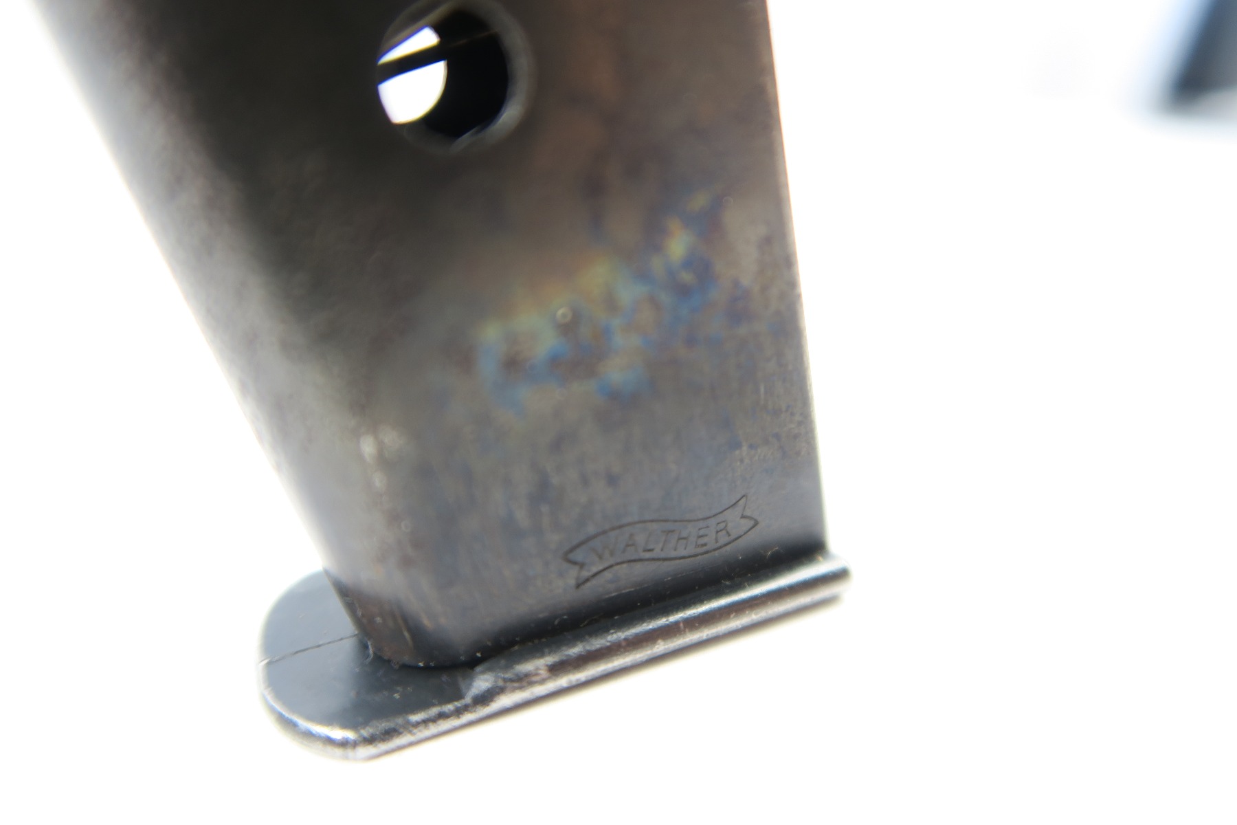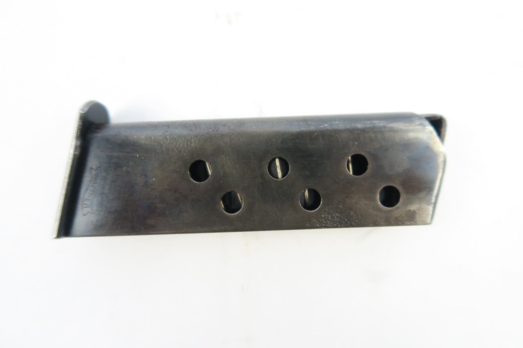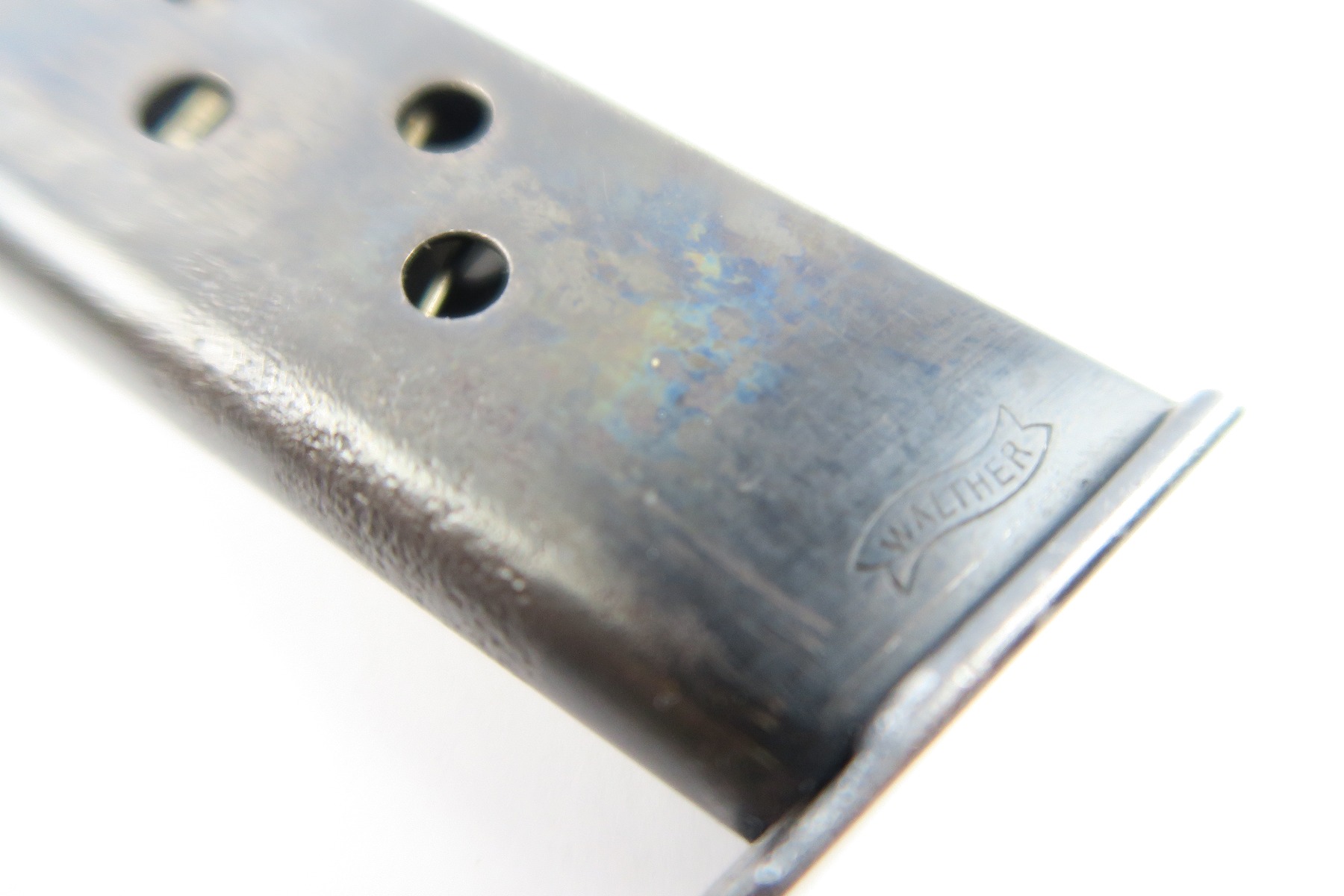 5/3/18 – This is an original early variation Walther PPK magazine. The magazine has a Walther banner on the left side of the frame and no other markings. The magazine is fully functional but has some pitting on the frame. Priced accordingly.