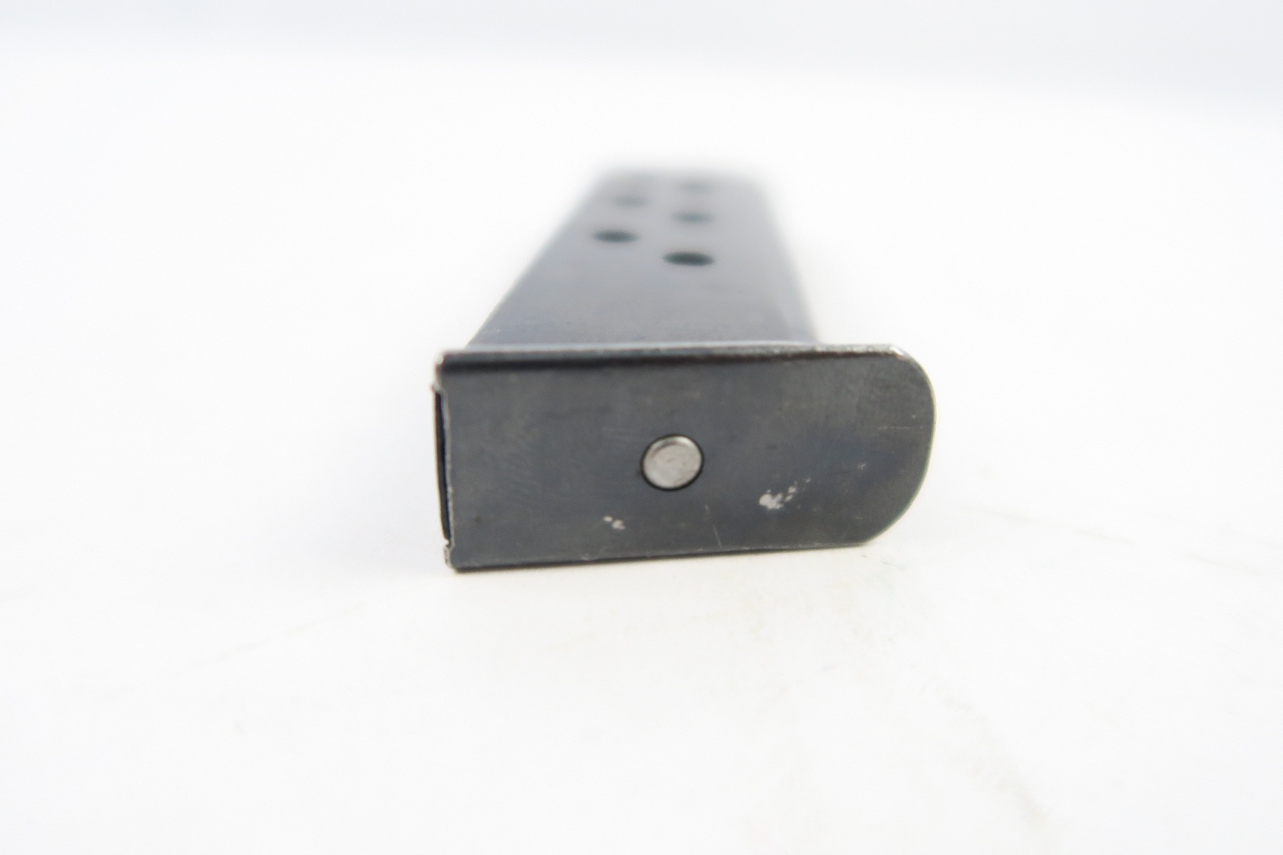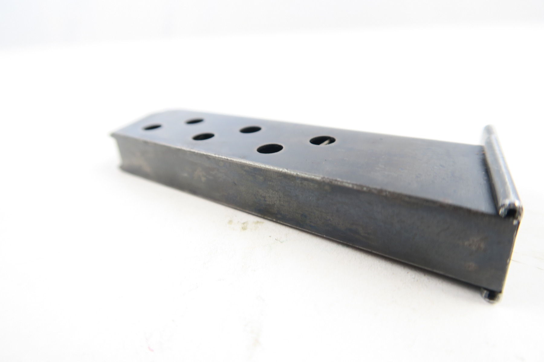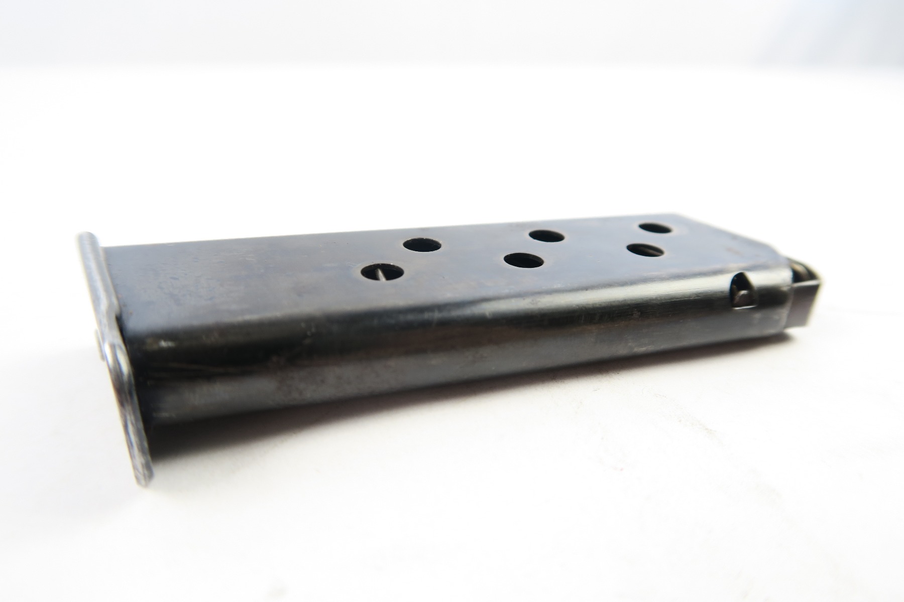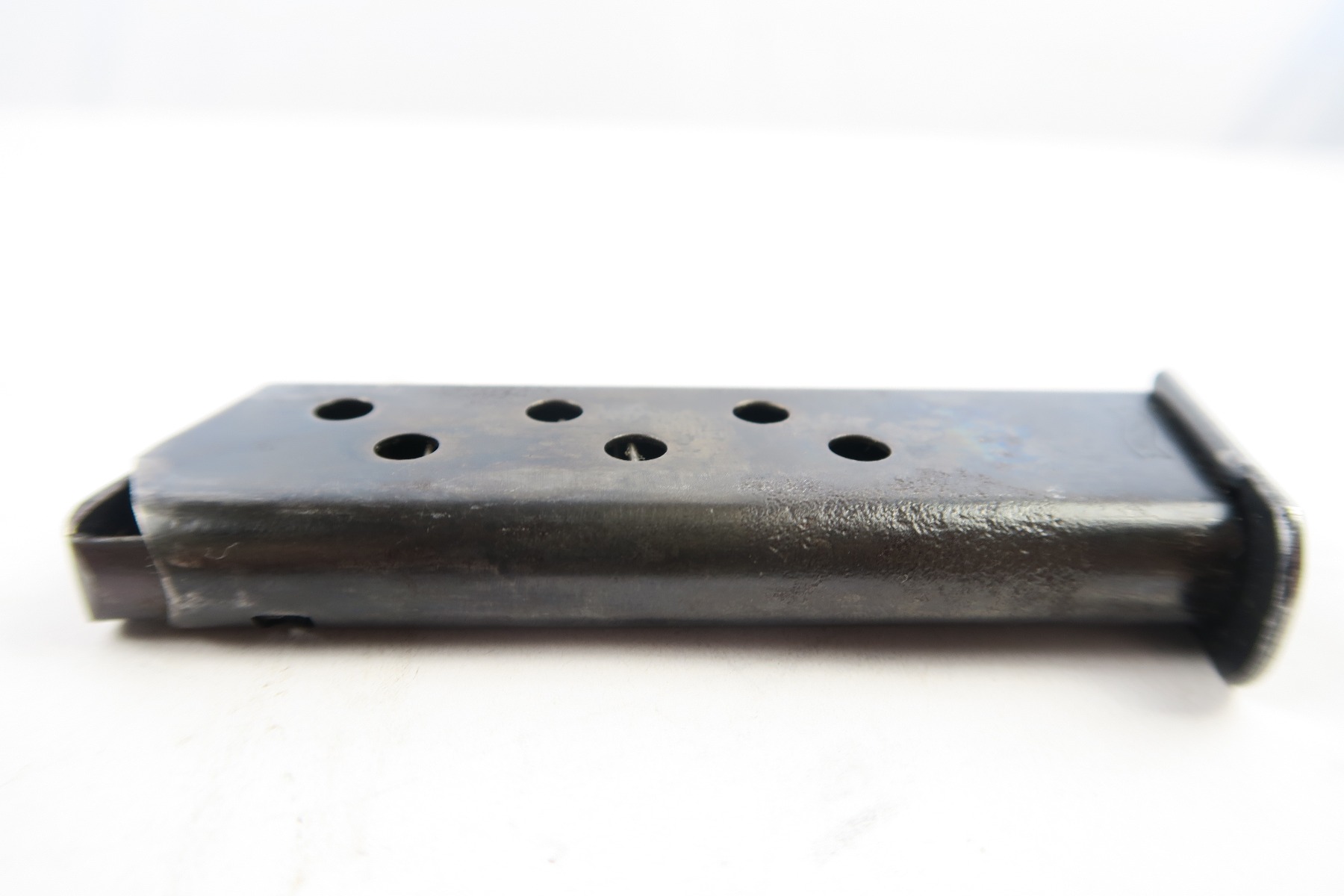 5/3/18 – This is an original early variation Walther PPK magazine. The magazine has a Walther banner on the left side of the frame and no other markings. The magazine is fully functional but has some pitting on the frame. Priced accordingly.